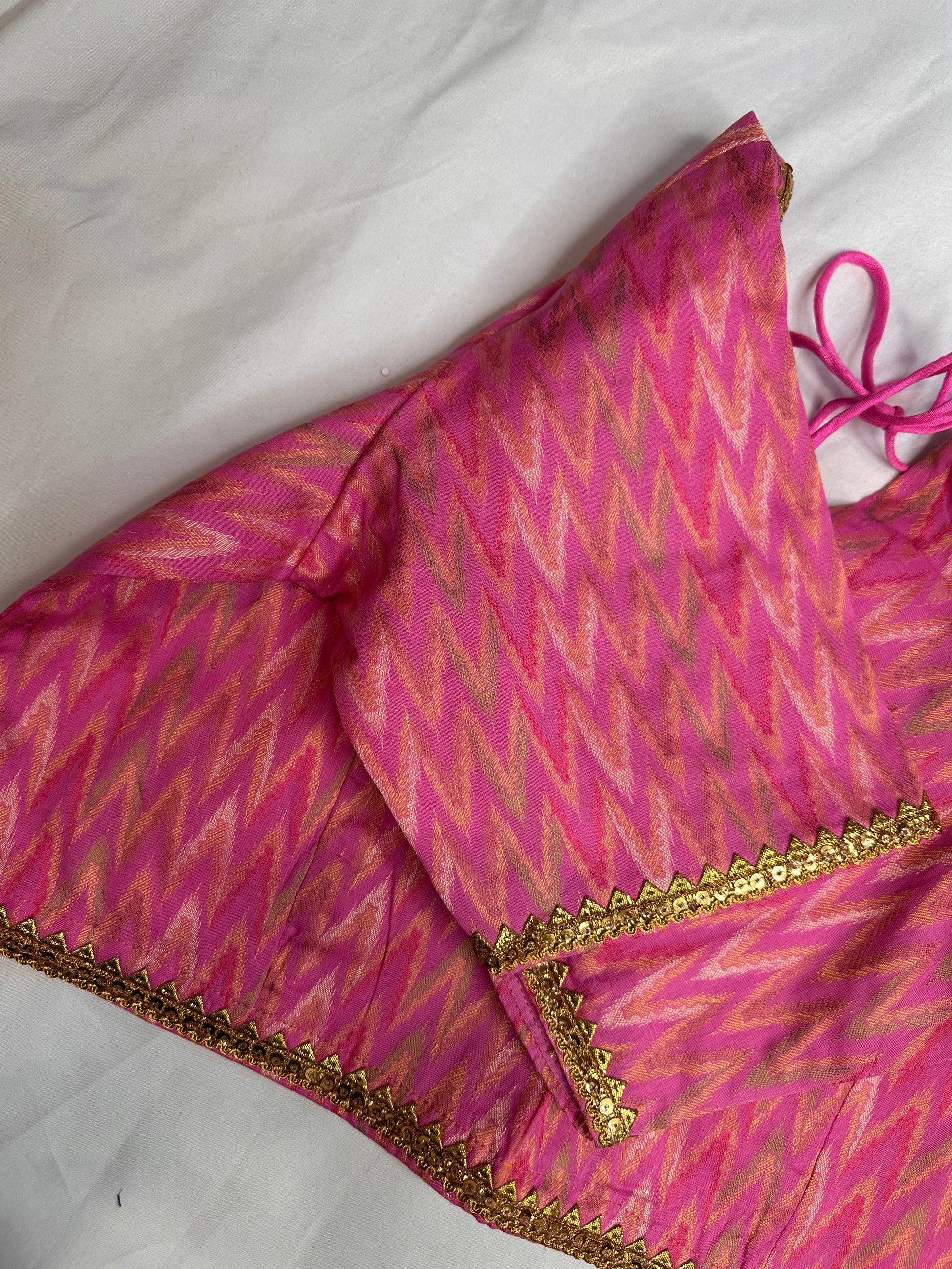 Pink Banarsi BlouseBlouse Details : Blouse Color : Pink; Blouse stitched Size 38 and can be altered from 36 to 44, Sleeves Length : 10 Inches, blouse Length: 14.5 Inches, FrontNeck : 7 Inches and Back Neck : 10 Inches;