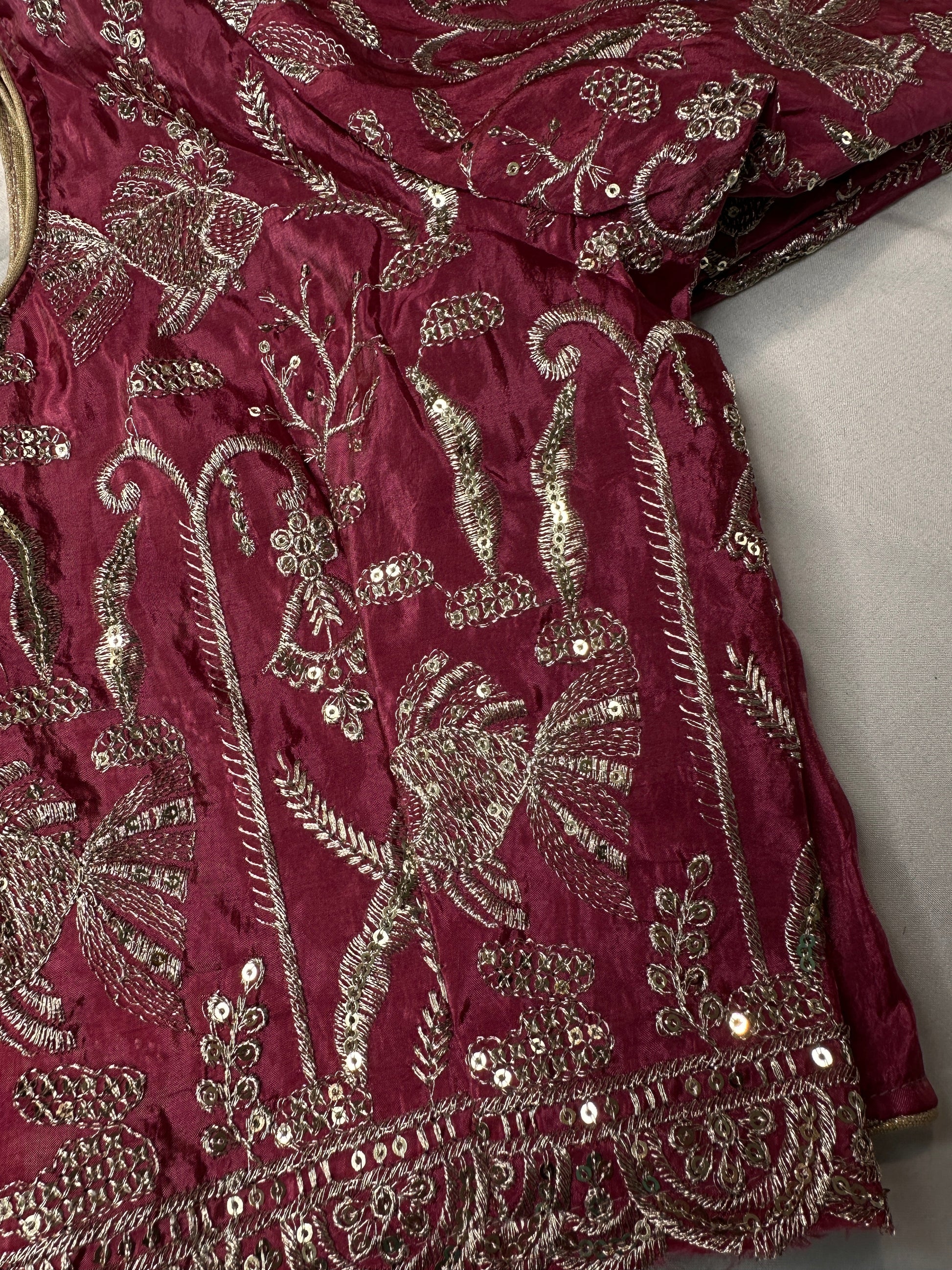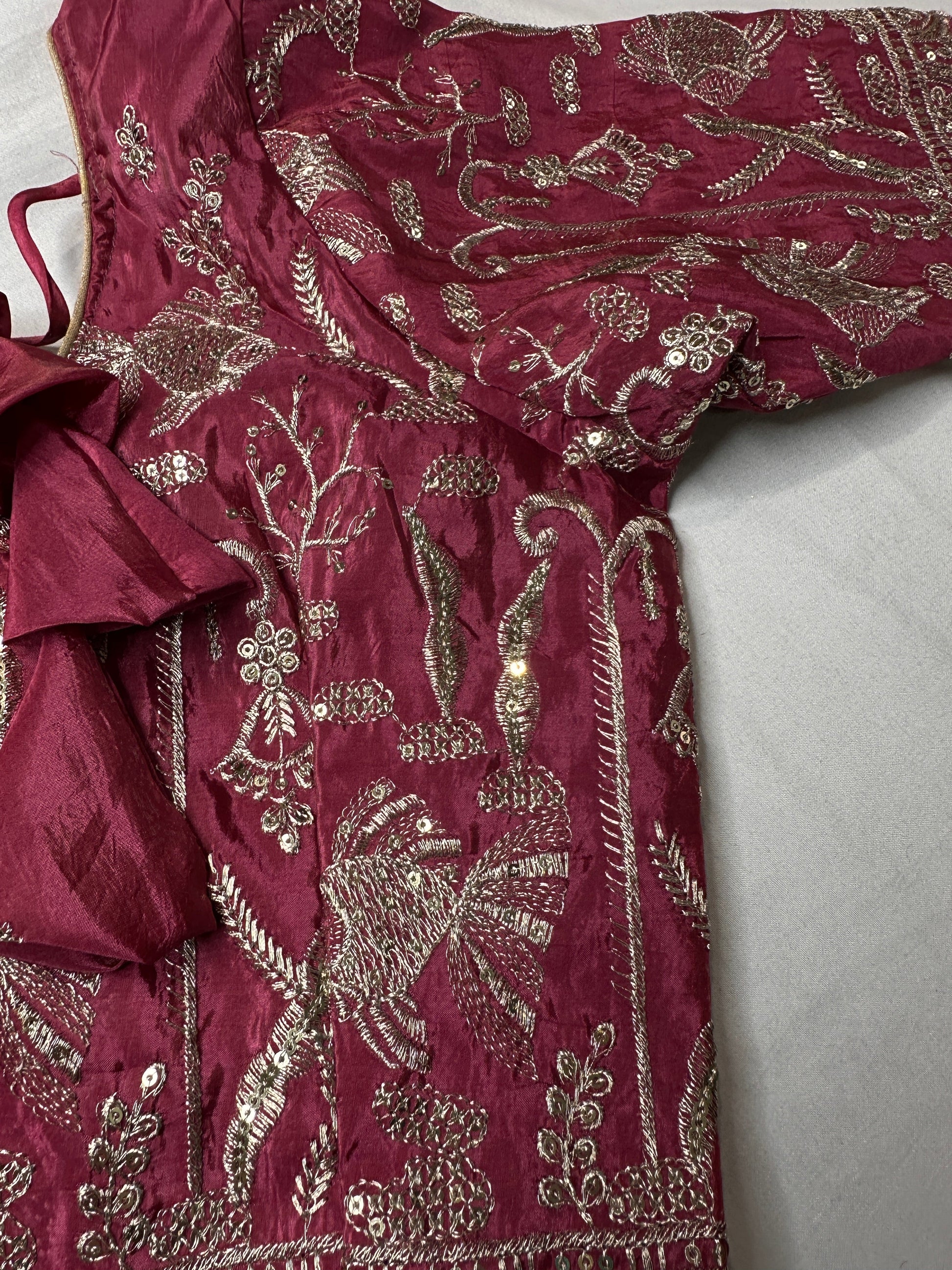 Pink Embroidery Chennon Silk BlouseBlouse Details : Blouse Color : Pink; Blouse stitched Size 38 and can be altered from 36 to 42, Sleeves Length : 9.5 Inches, blouse Length 15 Inches, FrontNeck : 6 Inches and Back Neck : 6 Inches;