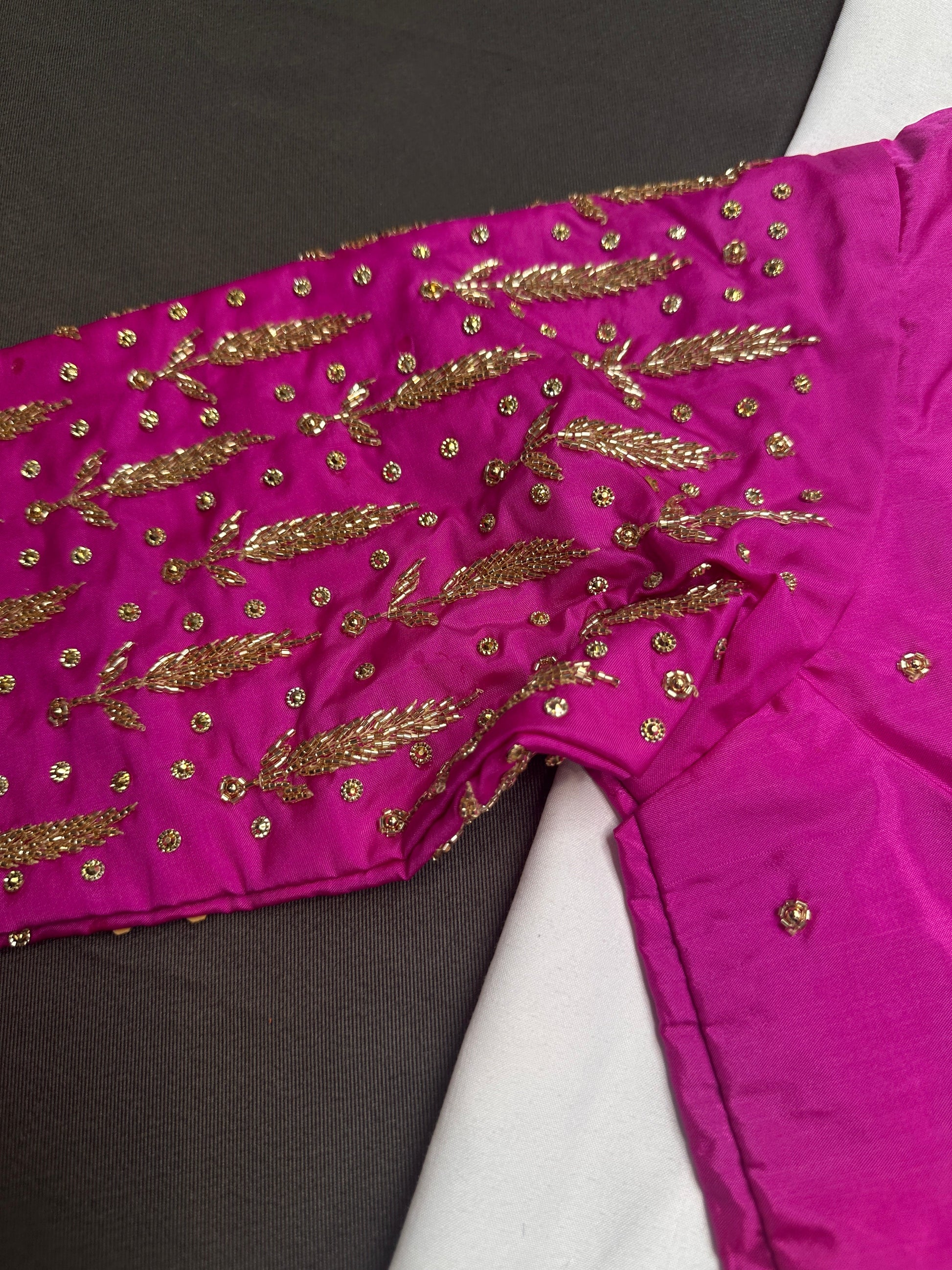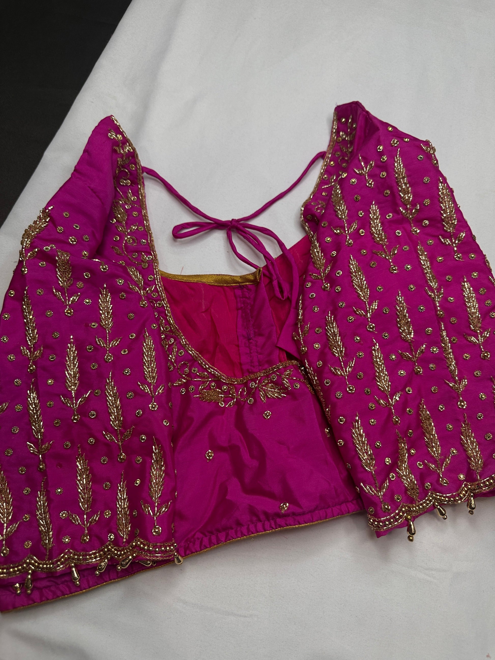 Pink Leaf Kardana Pearls Maggam BlouseBlouse Details : Blouse Color :Pink Blouse stitched Size 38 and can be altered from 36 to 44, Sleeves Length : 12 Inches, blouse Length 14.5 Inches, FrontNeck : 7 Inches and Back Neck : 10 Inches;