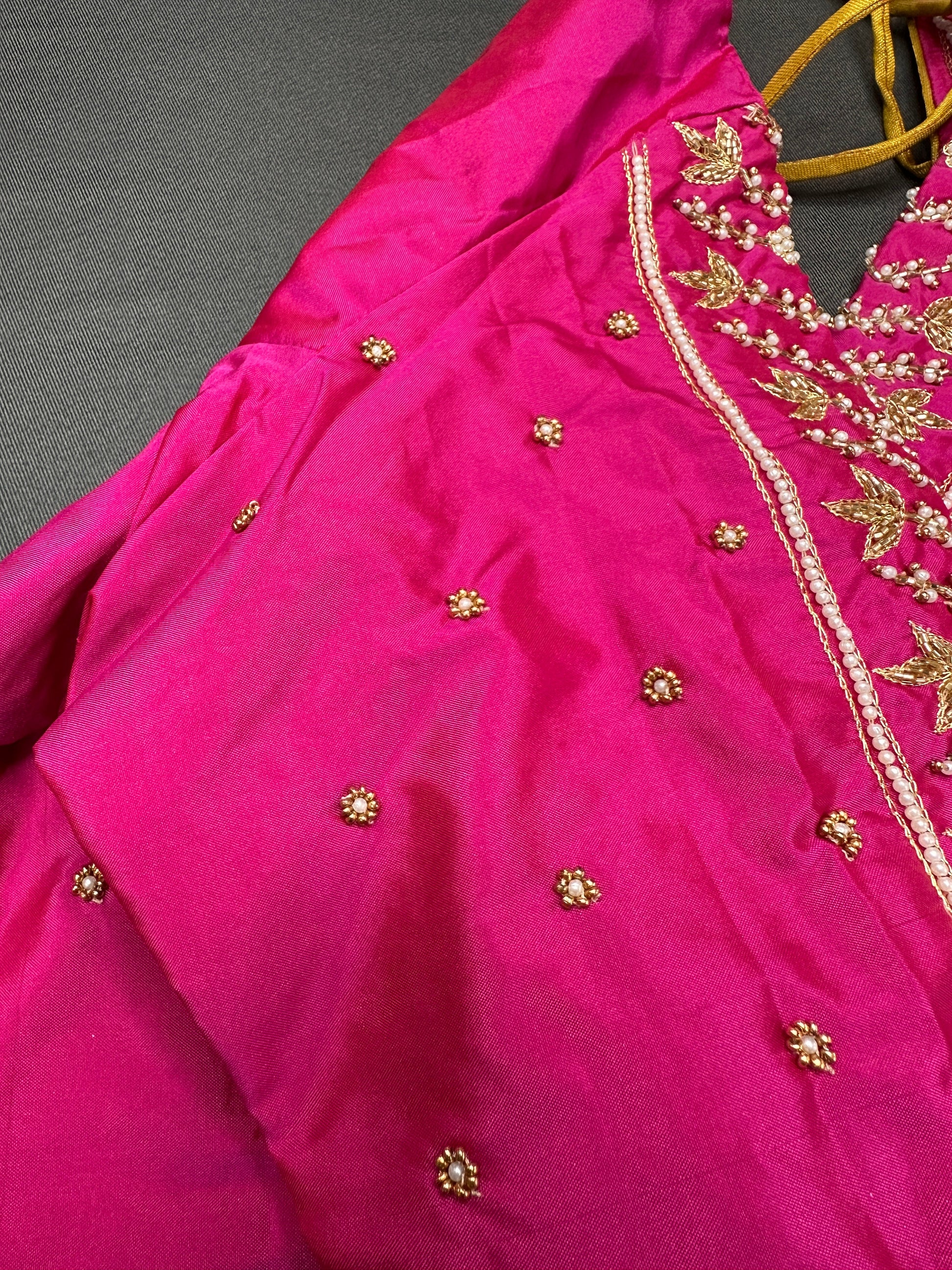 Pink Pearl Kardana Maggam Aari Work BlouseBlouse Details : Blouse Color : Pink; Blouse stitched Size 38 and can be altered from 34 to 46, Sleeves Length : 10 Inches, blouse Length 15 Inches, FrontNeck : 6 Inches and Back Neck : 10 Inches;