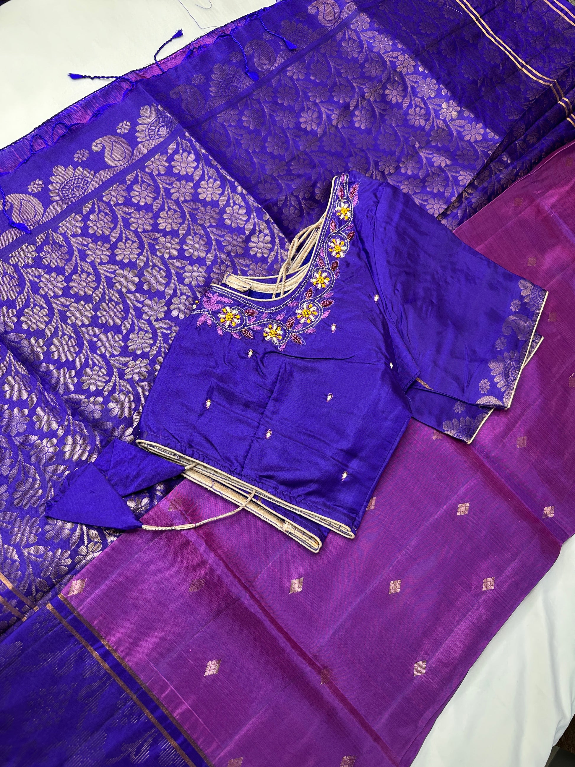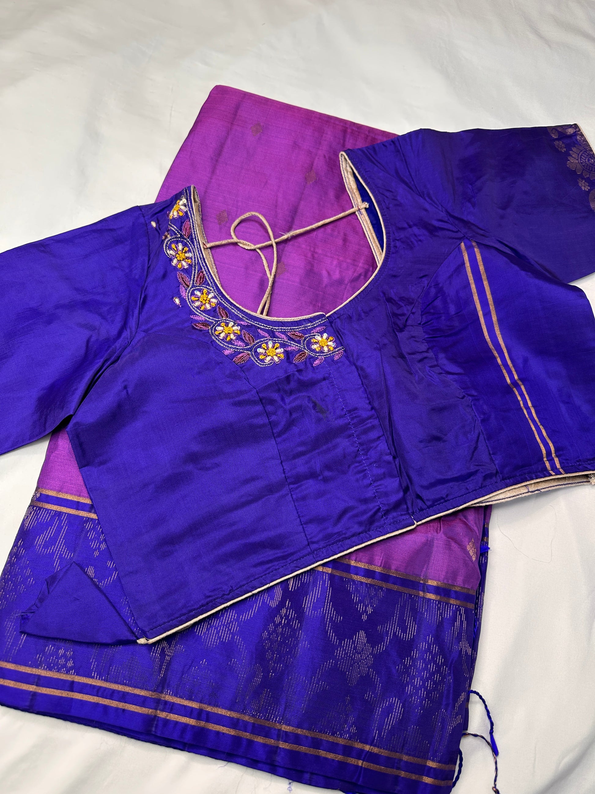 Pure Kanchi Handloom Purple Saree Saree Details : Purple Color Saree Blue Pallu Fall and Pico done Blouse Details : Blue Maggam Work Blouse Size 38 and has margin to go up to Size 44; Sleeves Length : 8.5 Inches: Blouse Length : 15 Inches; Front Neck : 7 Inches; Back Neck : 8 Inches Inches