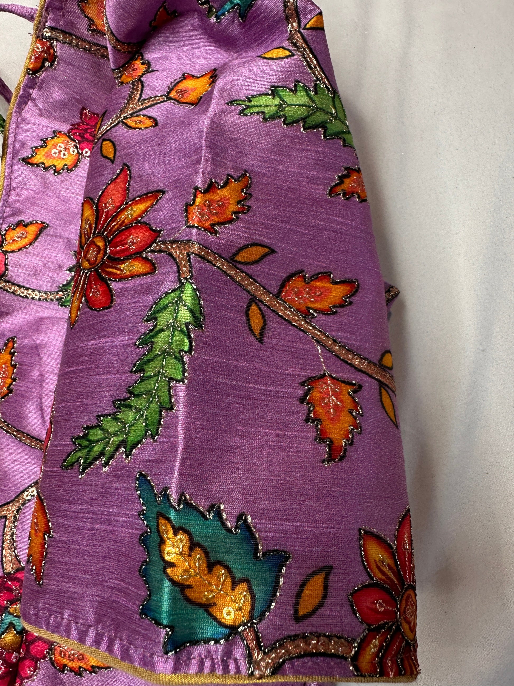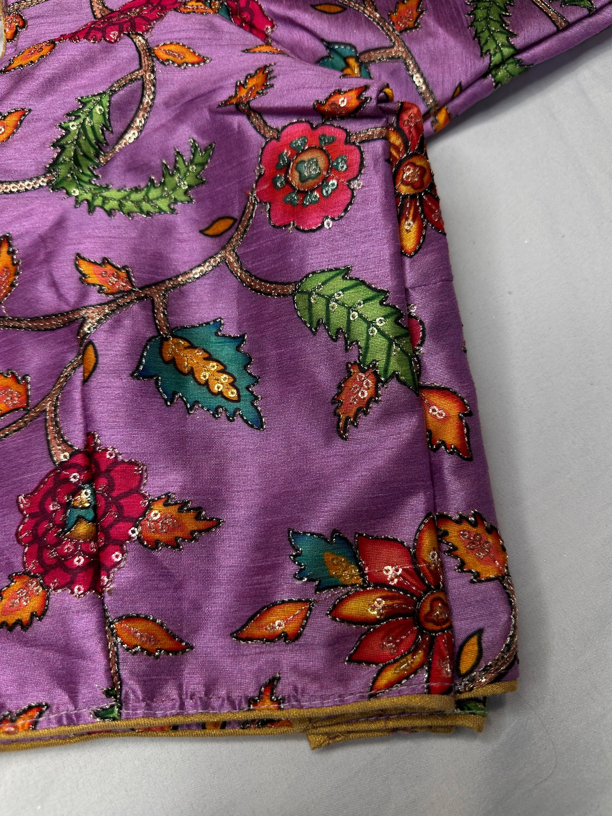 Purple Silk Kalamkari Sequence BlouseBlouse Details : Blouse Color : Purple; Blouse stitched Size 34 and can be altered from 38, Sleeves Length : 10 Inches, blouse Length 14.5 Inches, FrontNeck : 7 Inches and Back Neck : 4 Inches;