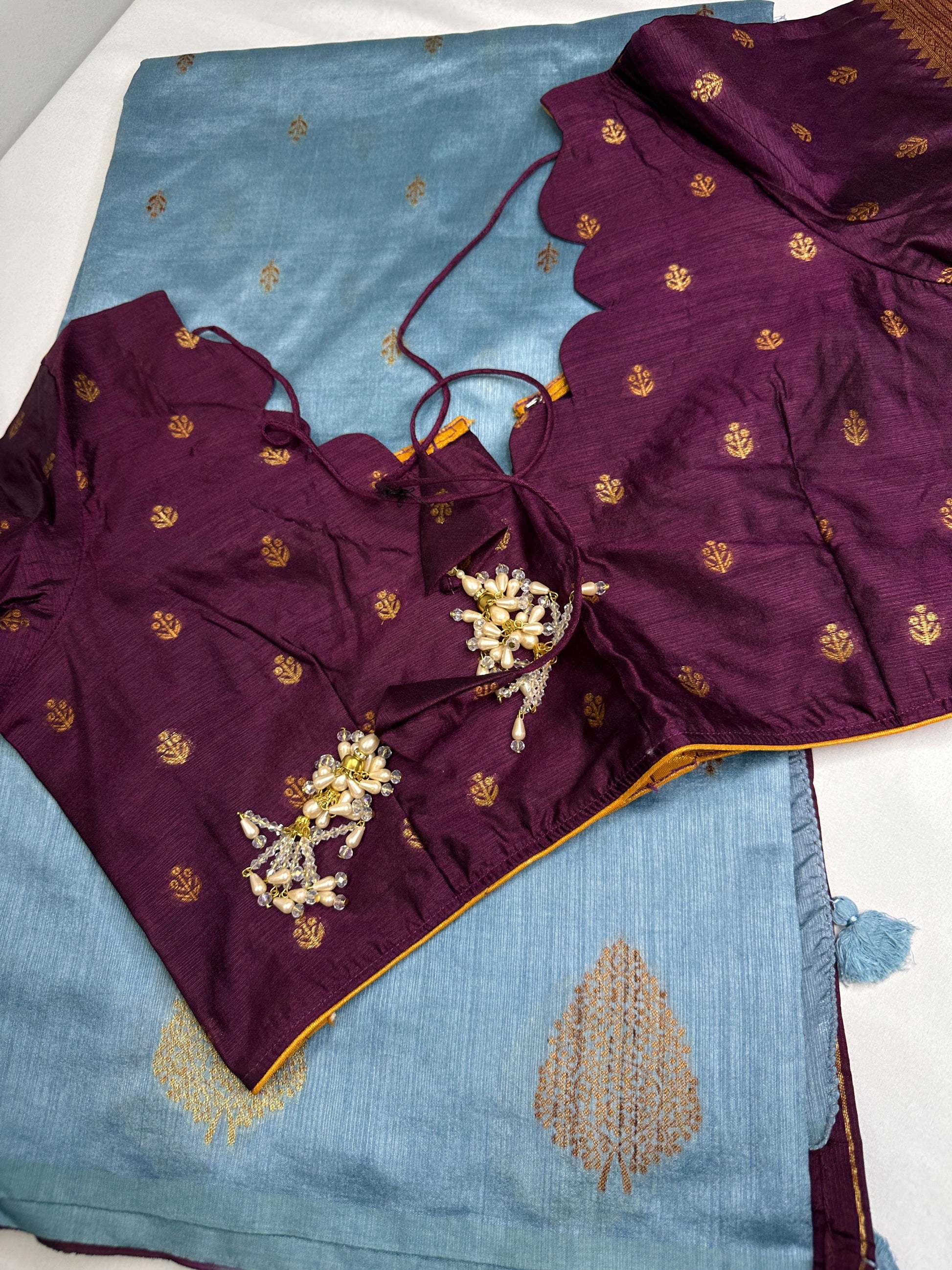 Blouse Details : Purple Blouse Size 38 and has margin to go up to Size 46; Sleeves Length : 9 Inches: Blouse Length : 15 Inches; Front Neck : 8 Inches; Back Neck : 10 Inches Inches
