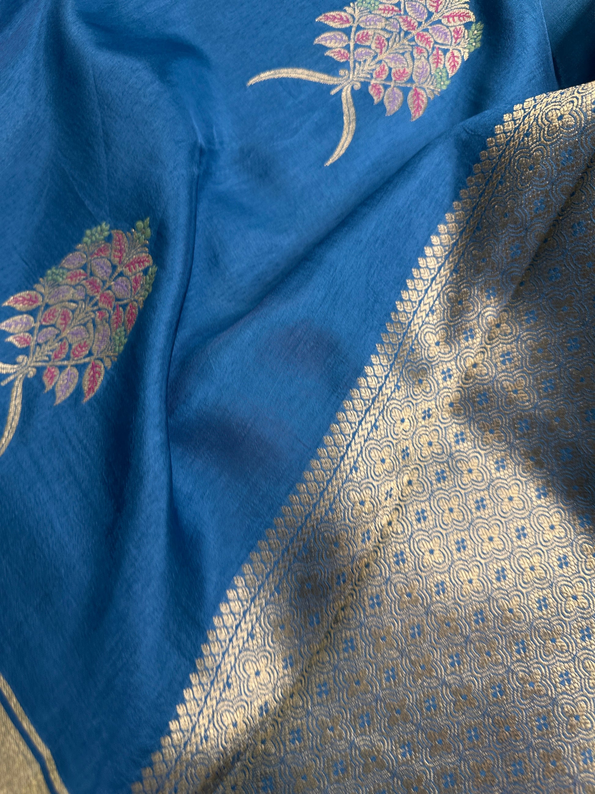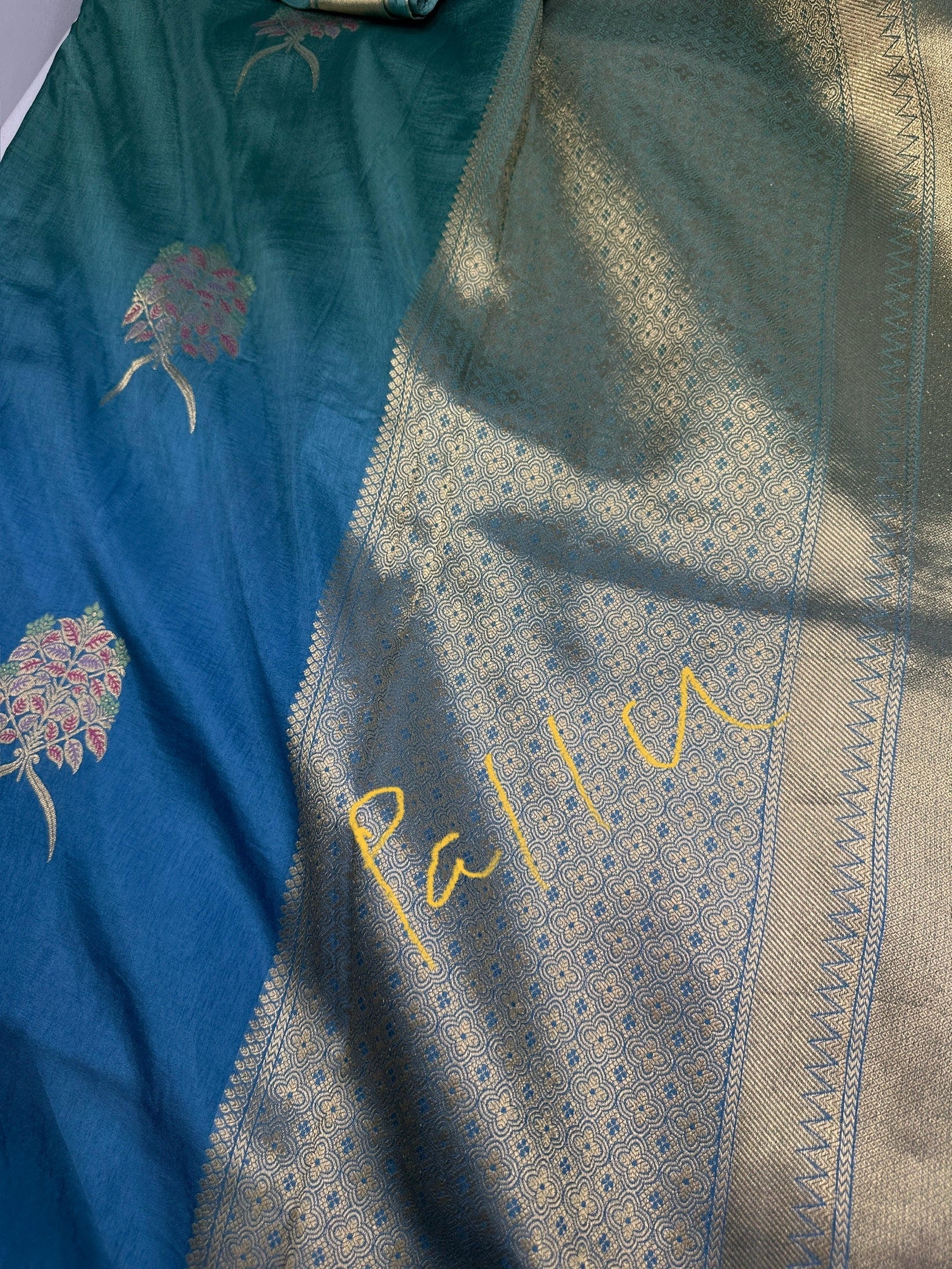Raw Mango Pure Silk Saree Saree Details : Blue Teal Color Saree Zari Pallu Fall and Pico done Blouse Details : Blue Blouse Size 38 and has margin to go up to Size 46; Sleeves Length : 9 Inches: Blouse Length : 15 Inches; Front Neck : 7 Inches; Back Neck : 10 Inches Inches