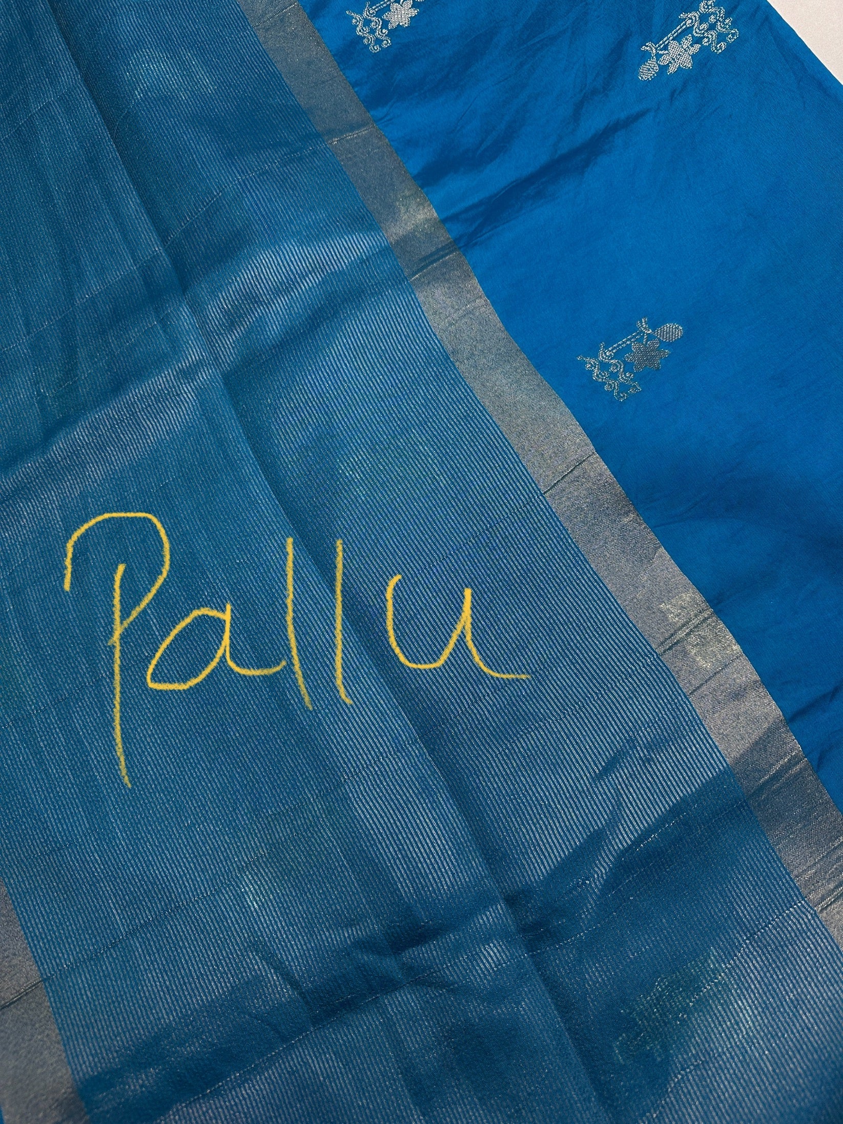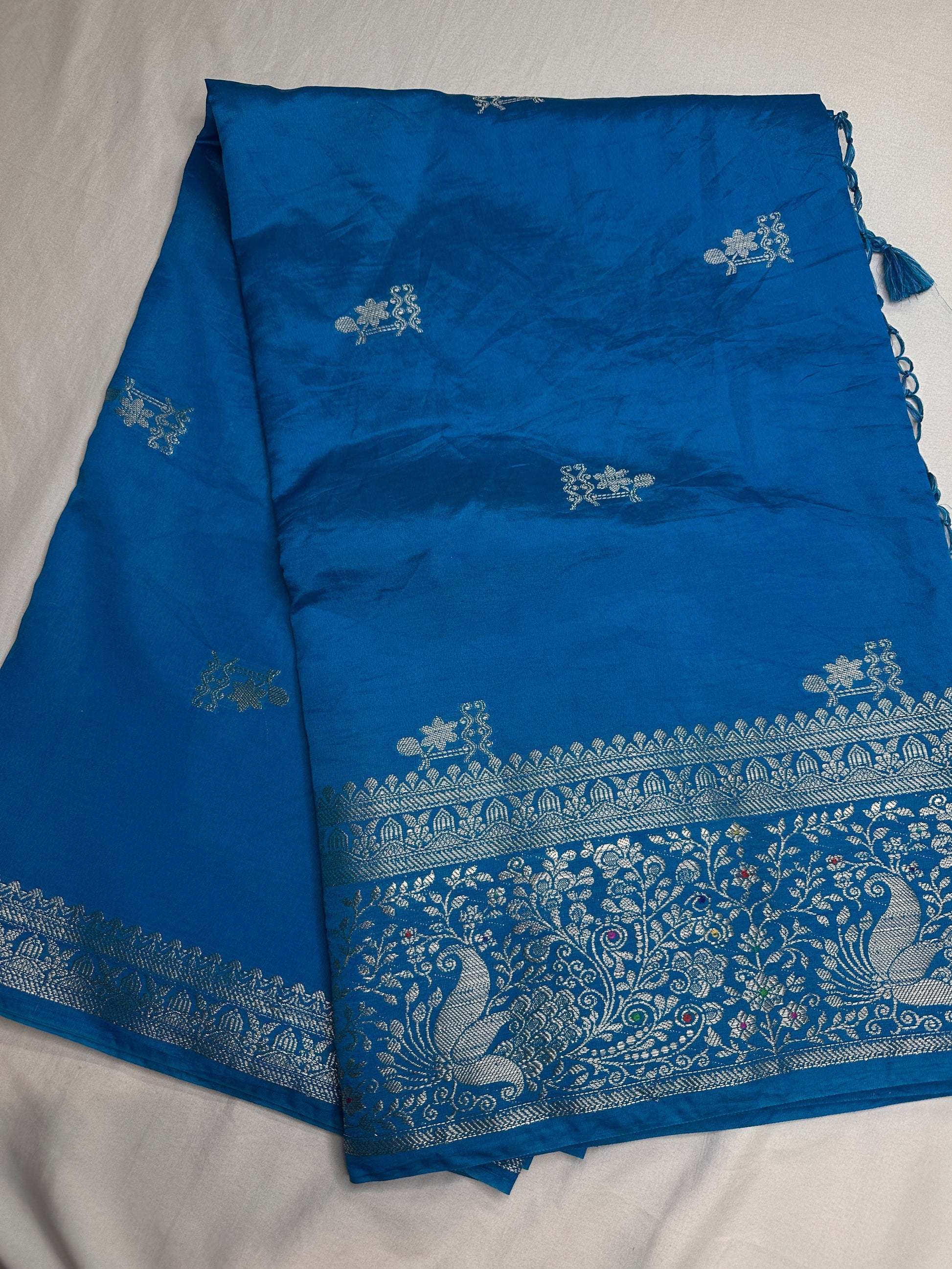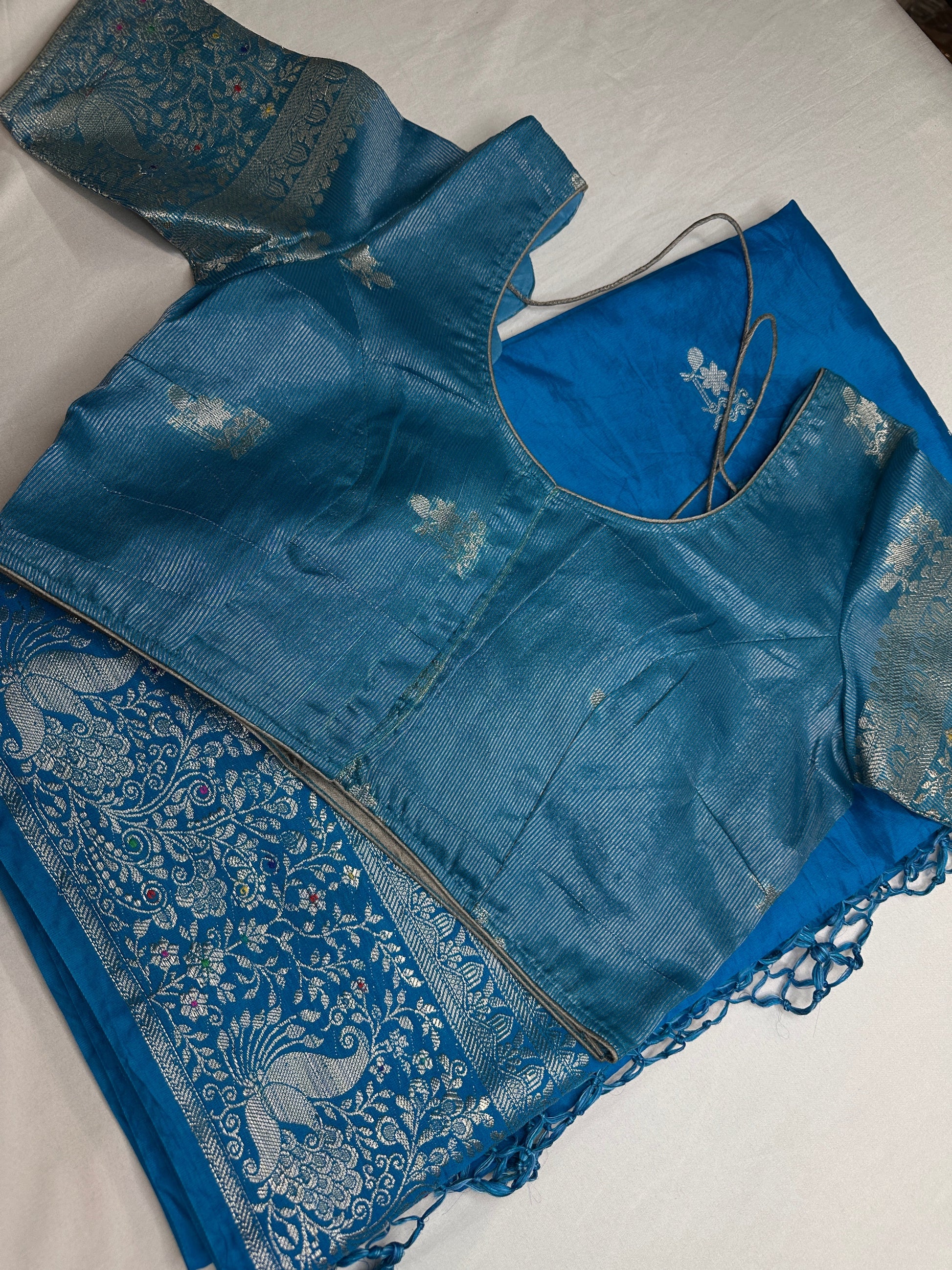Raw Mango Silk Blue Silver Zari Saree Saree Details : Blue Color Pallu Fall and Pico done Blouse Details : Blue Blouse Size 38 and has margin to go up to Size 44; Sleeves Length : 10 Inches: Blouse Length : 15 Inches; Front Neck : 7 Inches; Back Neck : 10 Inches Inches