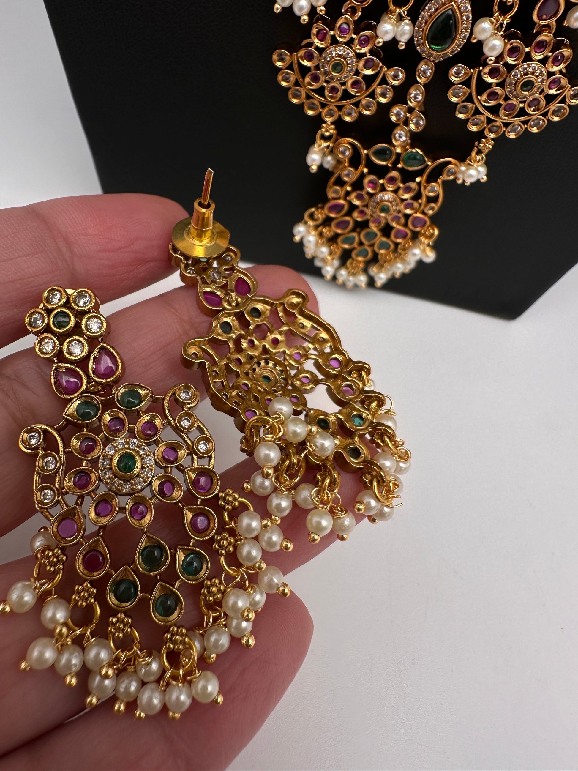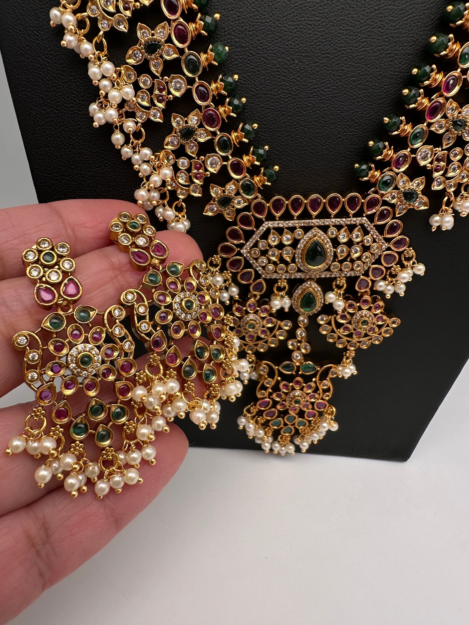 Red Green CZ Pearls Long Matte Guttapuslu Necklace with matching earrings