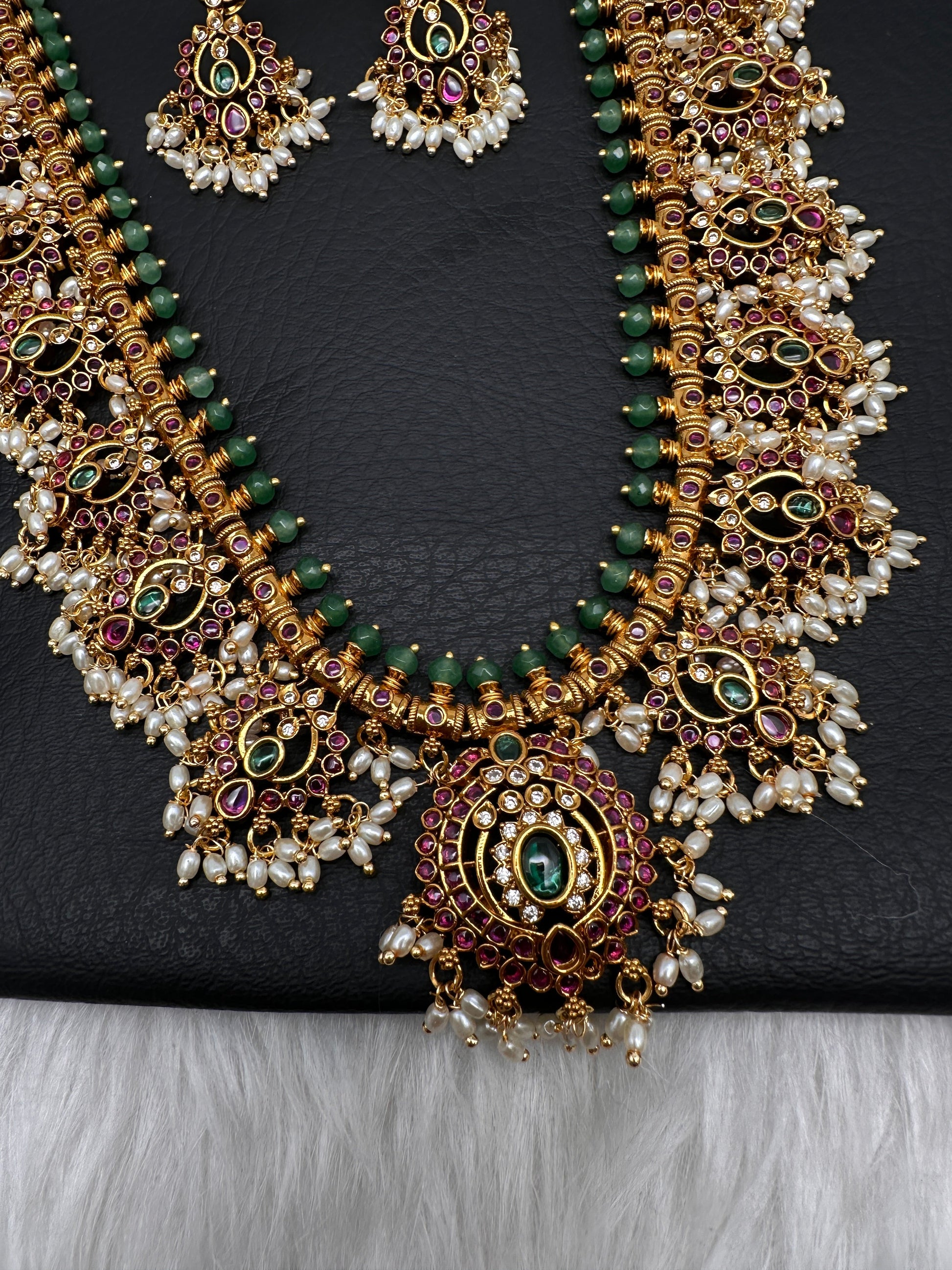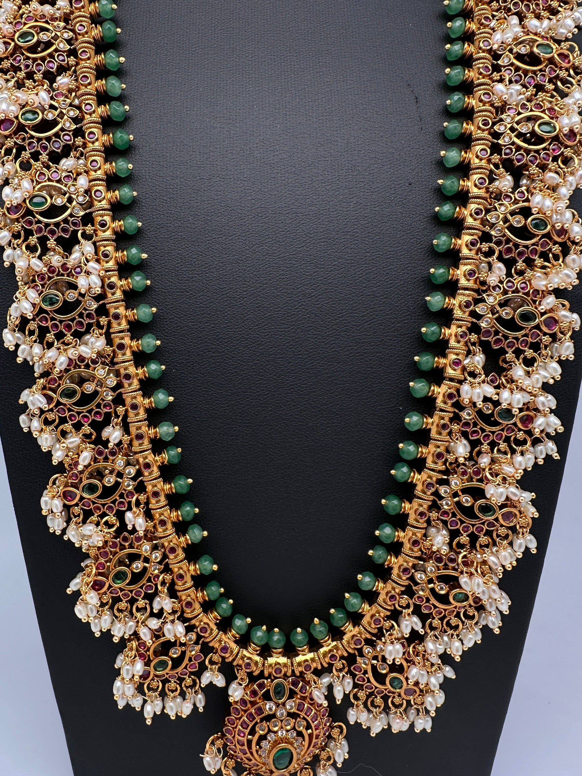 Rice Pearls Kempu Long Guttapusalu Necklace with matching earringsColor : GoldSize : Necklace Length : 24 Inches; Earring Length : 2 Inches ApproxStones : Kemp Red Green Beads Pearls