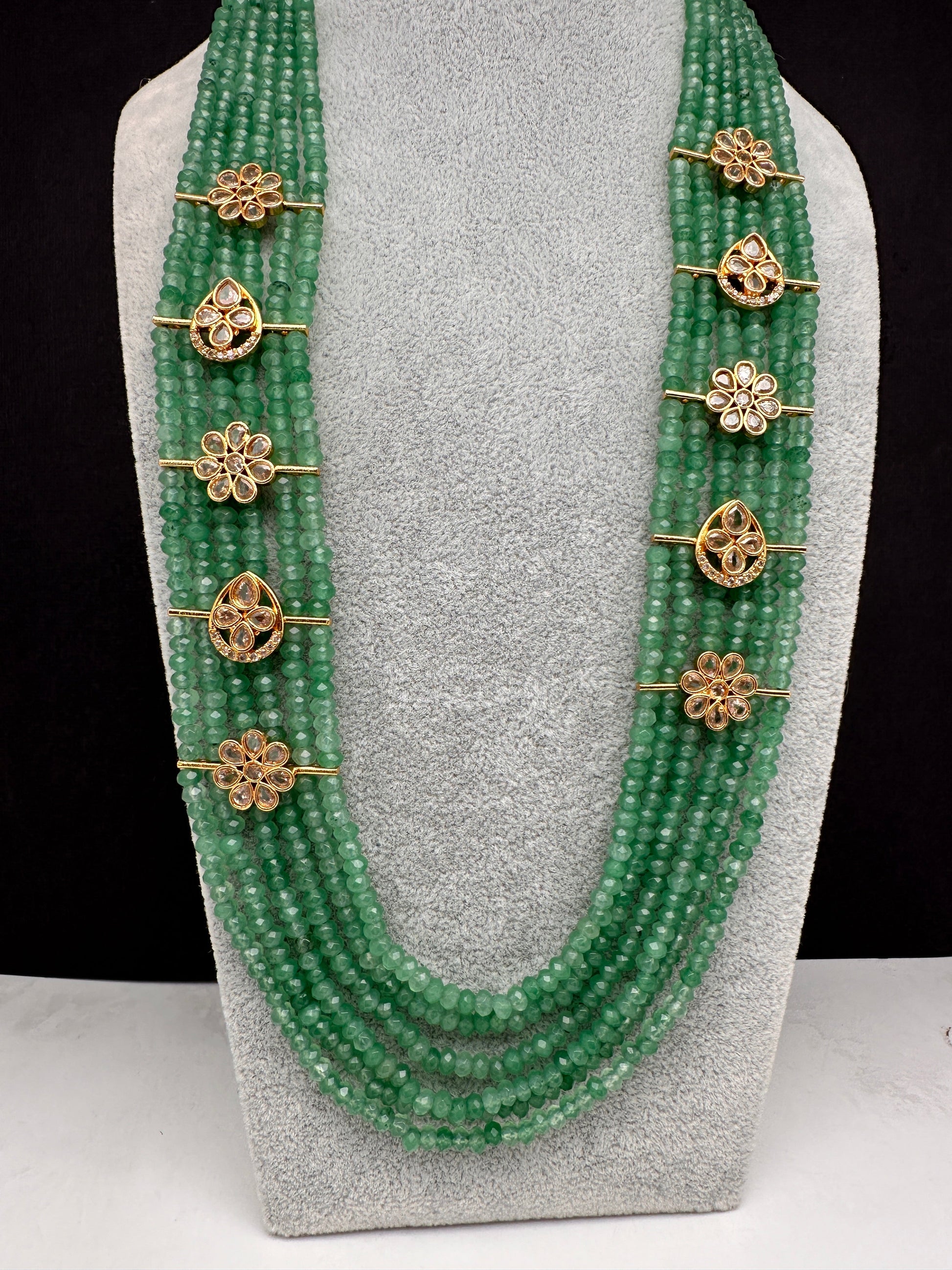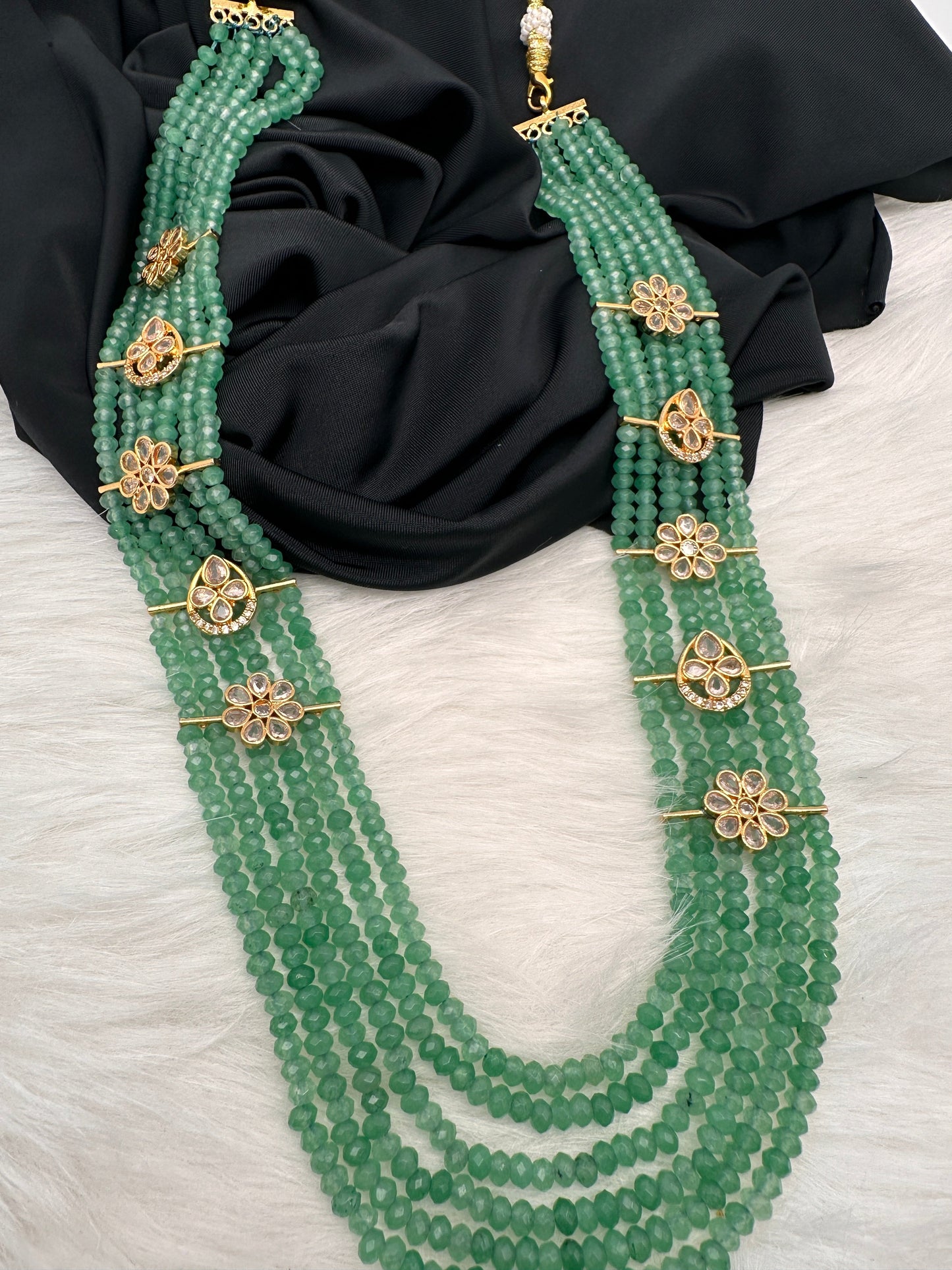 Six Line Green Emerald Beads Necklace Only Neckalce no earringsColor : GoldenSize : Necklace Length : 20 Inches Approx;Stones : Green Beads