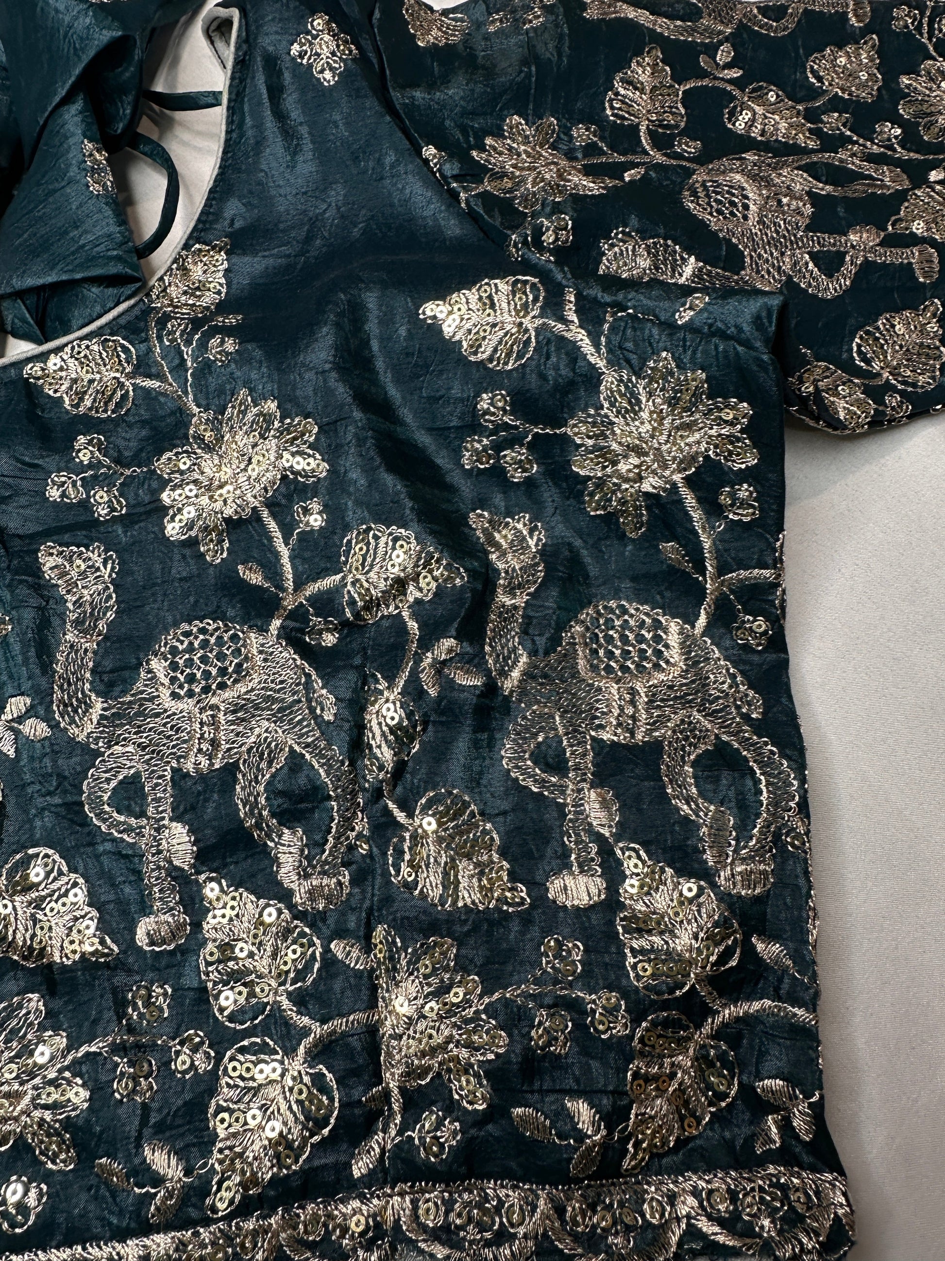 Teal Green Embroidery Chennon Silk BlouseBlouse Details : Blouse Color : Pink; Blouse stitched Size 38 and can be altered from 36 to 42, Sleeves Length : 9.5 Inches, blouse Length 15 Inches, FrontNeck : 6 Inches and Back Neck : 6 Inches;