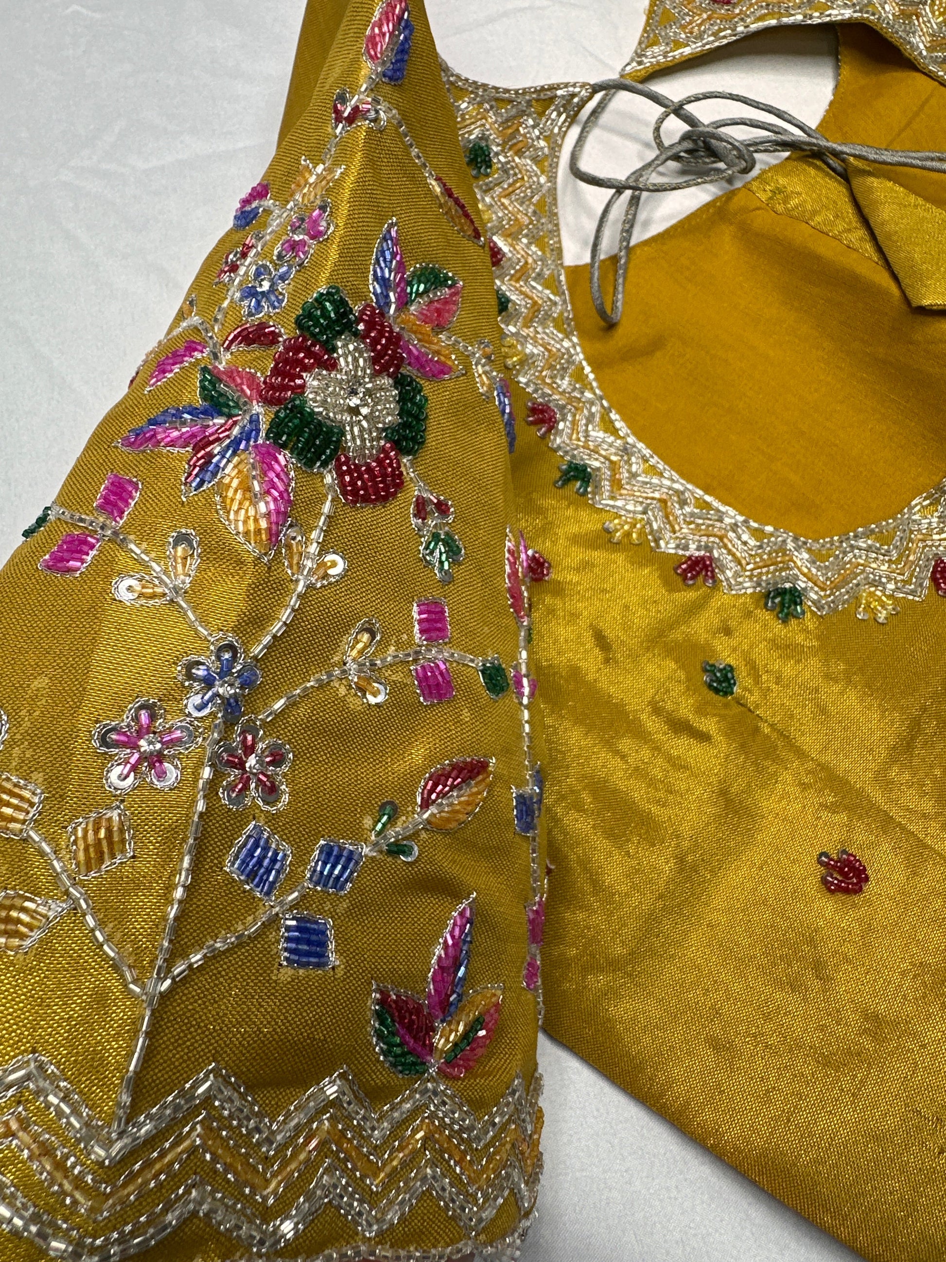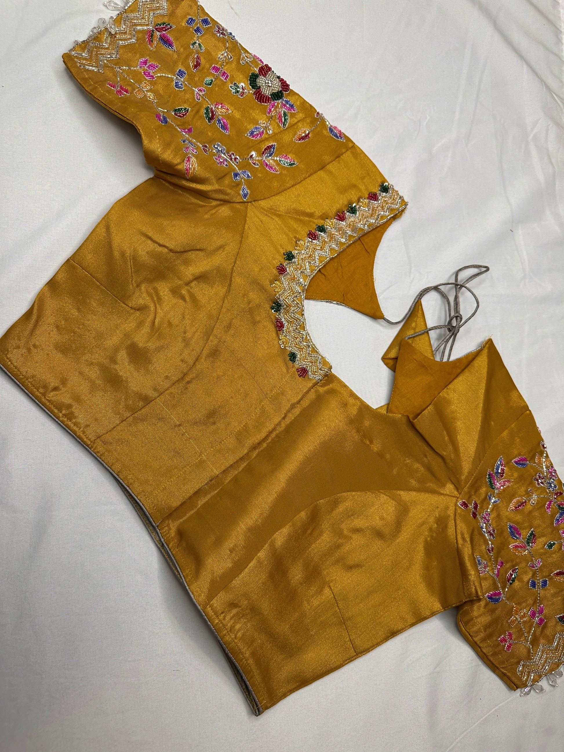 Tissue Golden Multi Color Maggam BlouseBlouse Details : Blouse Color : Purple; Blouse stitched Size 38 and can be altered from 36 to 44, Sleeves Length : 9 Inches, blouse Length 14.5 Inches, FrontNeck : 7 Inches and Back Neck : 4 Inches;