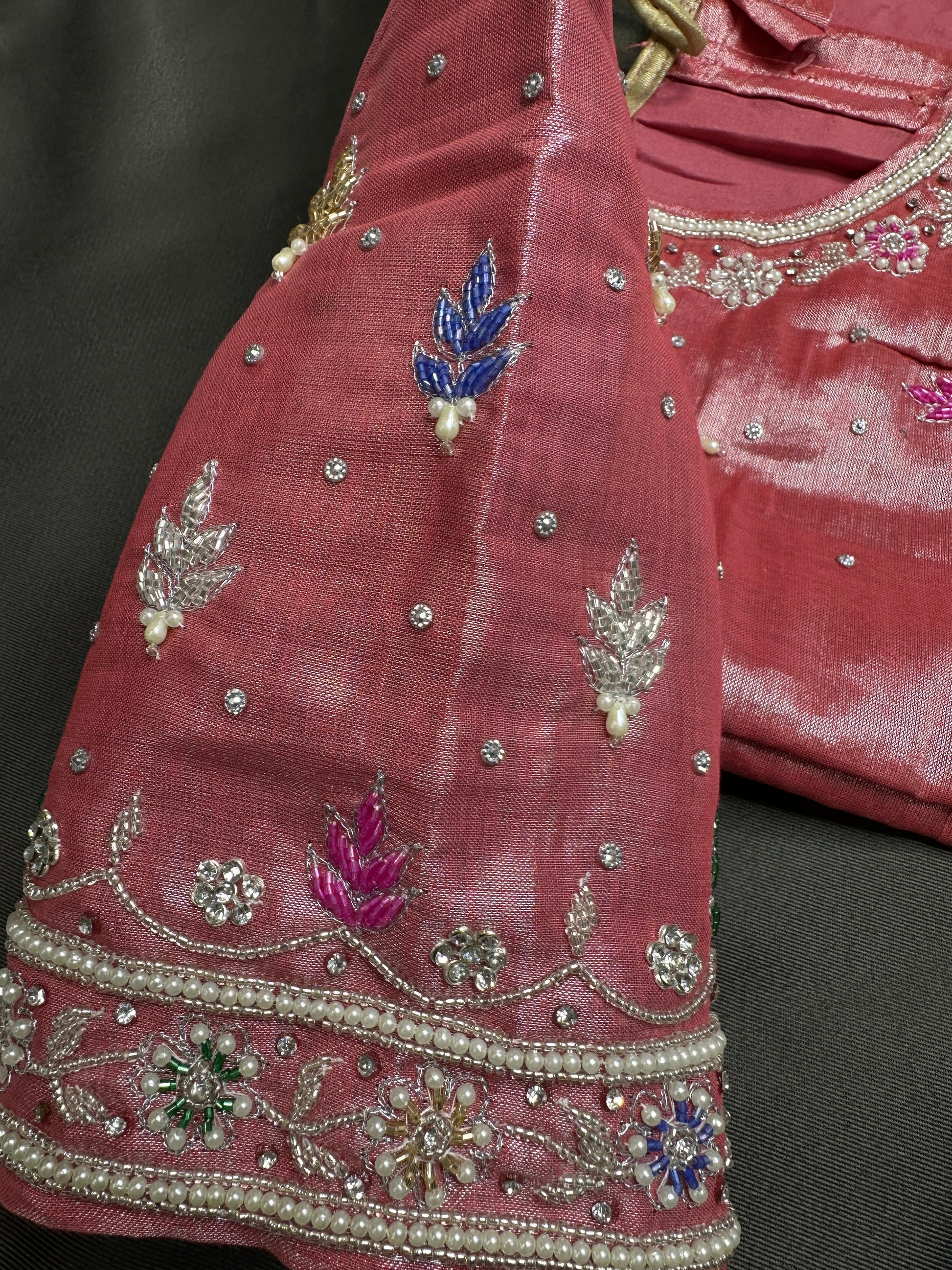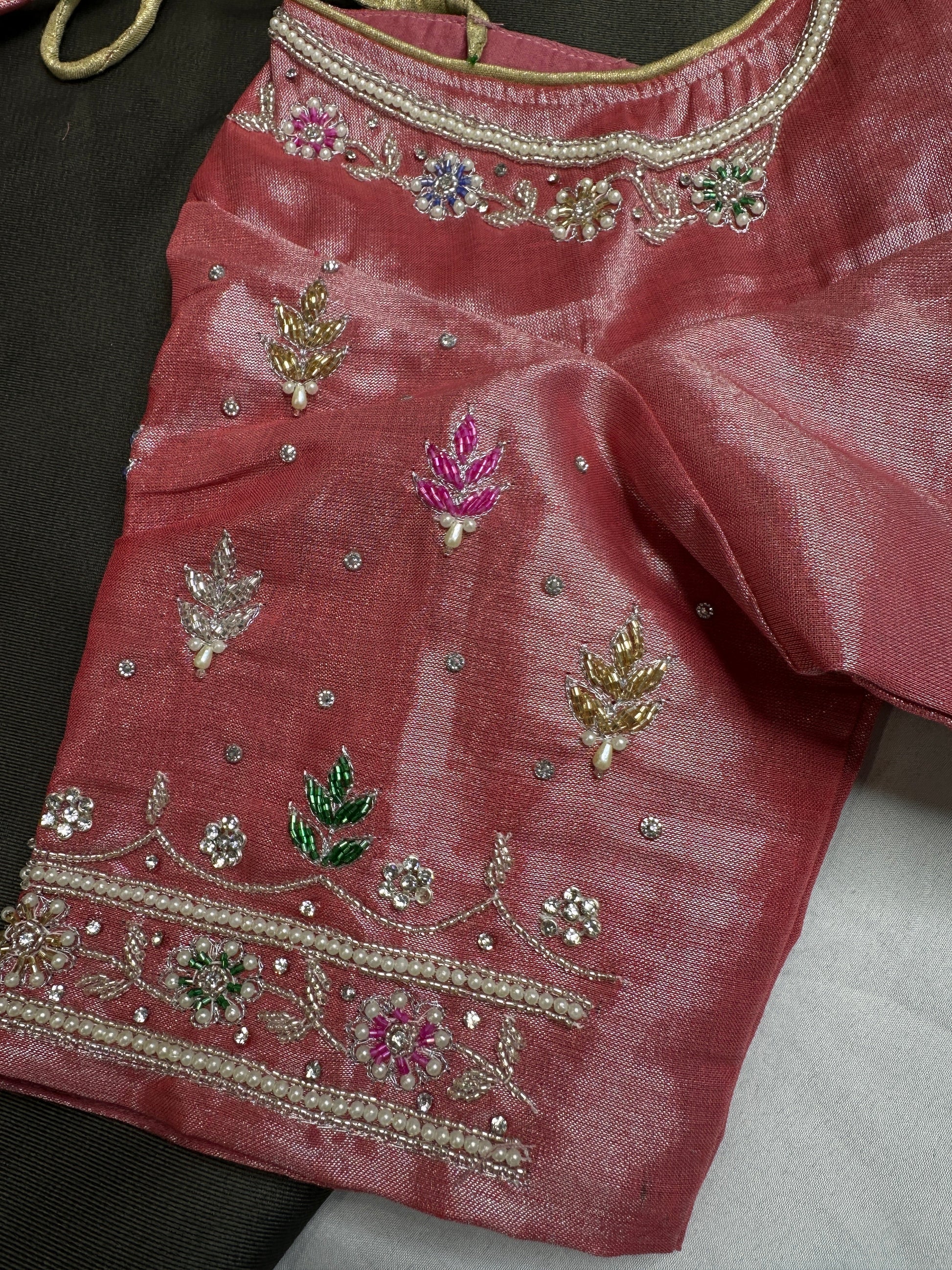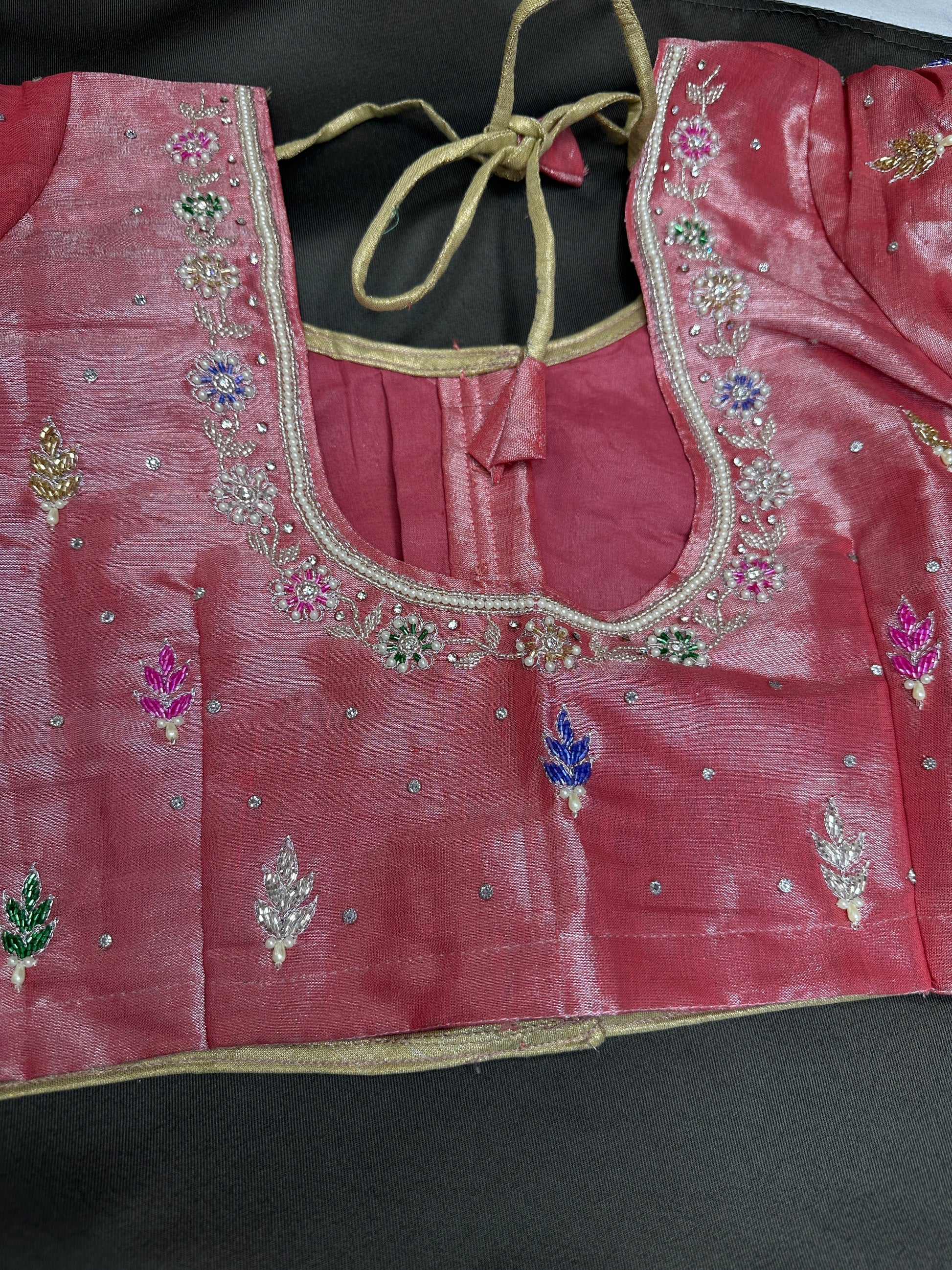 Tissue Pink Multi Color Maggam BlouseBlouse Details : Blouse Color : Purple; Blouse stitched Size 38 and can be altered from 36 to 44, Sleeves Length : 9 Inches, blouse Length 14.5 Inches, FrontNeck : 7 Inches and Back Neck : 4 Inches;