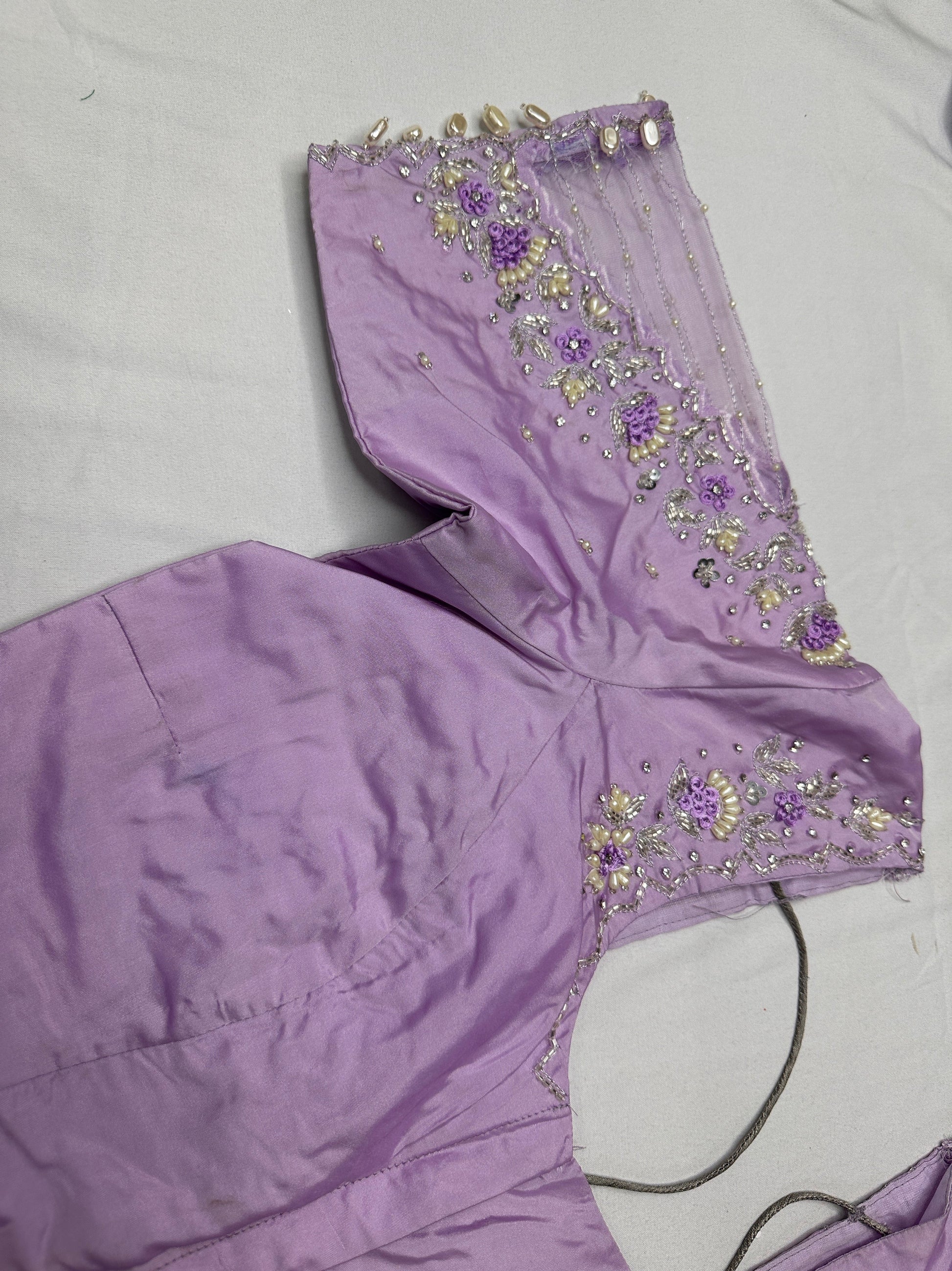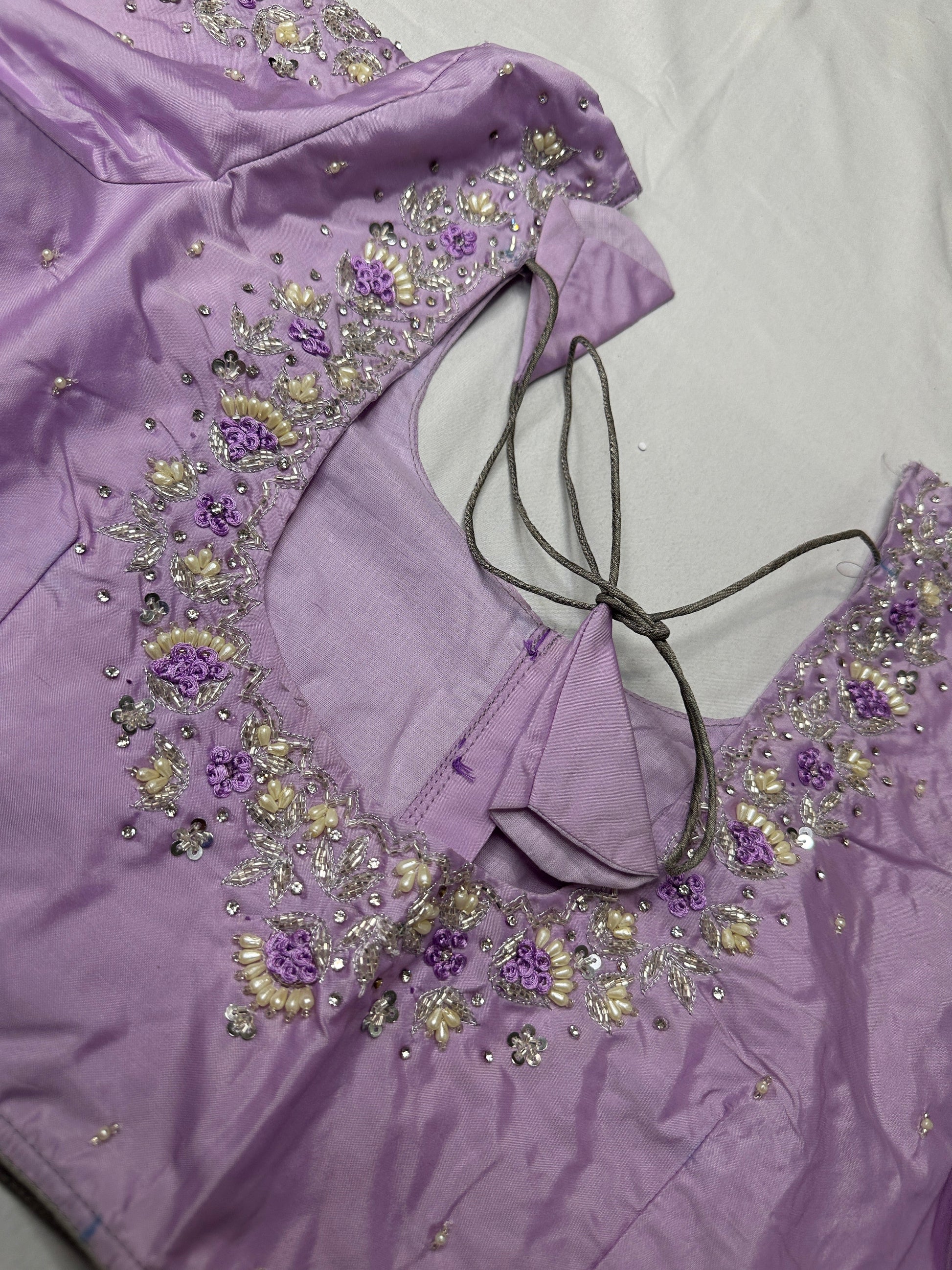 Tissue Silk Lavender Maggam Pearl Net BlouseBlouse Details : Blouse Color : Lavender; Blouse stitched Size 38 and can be altered from 36 to 44, Sleeves Length : 9.5 Inches, blouse Length 15 Inches, FrontNeck : 8 Inches and Back Neck : 10 Inches;