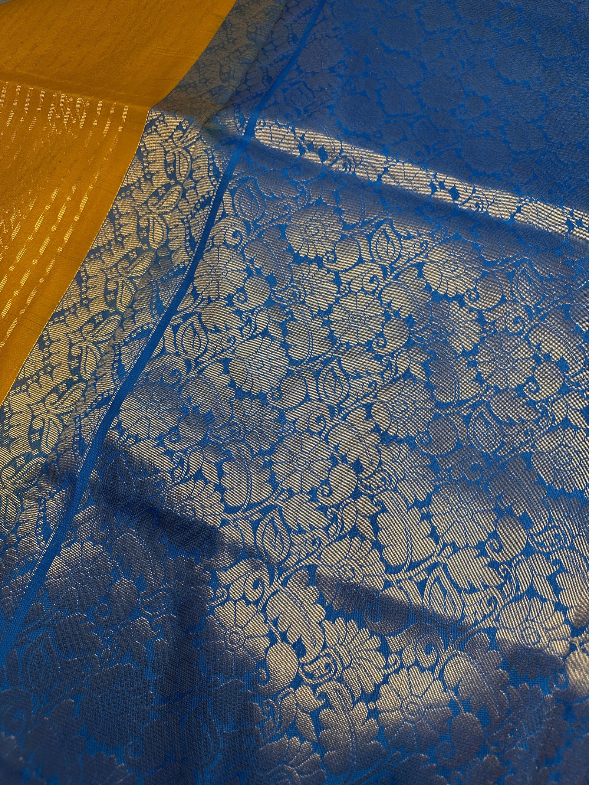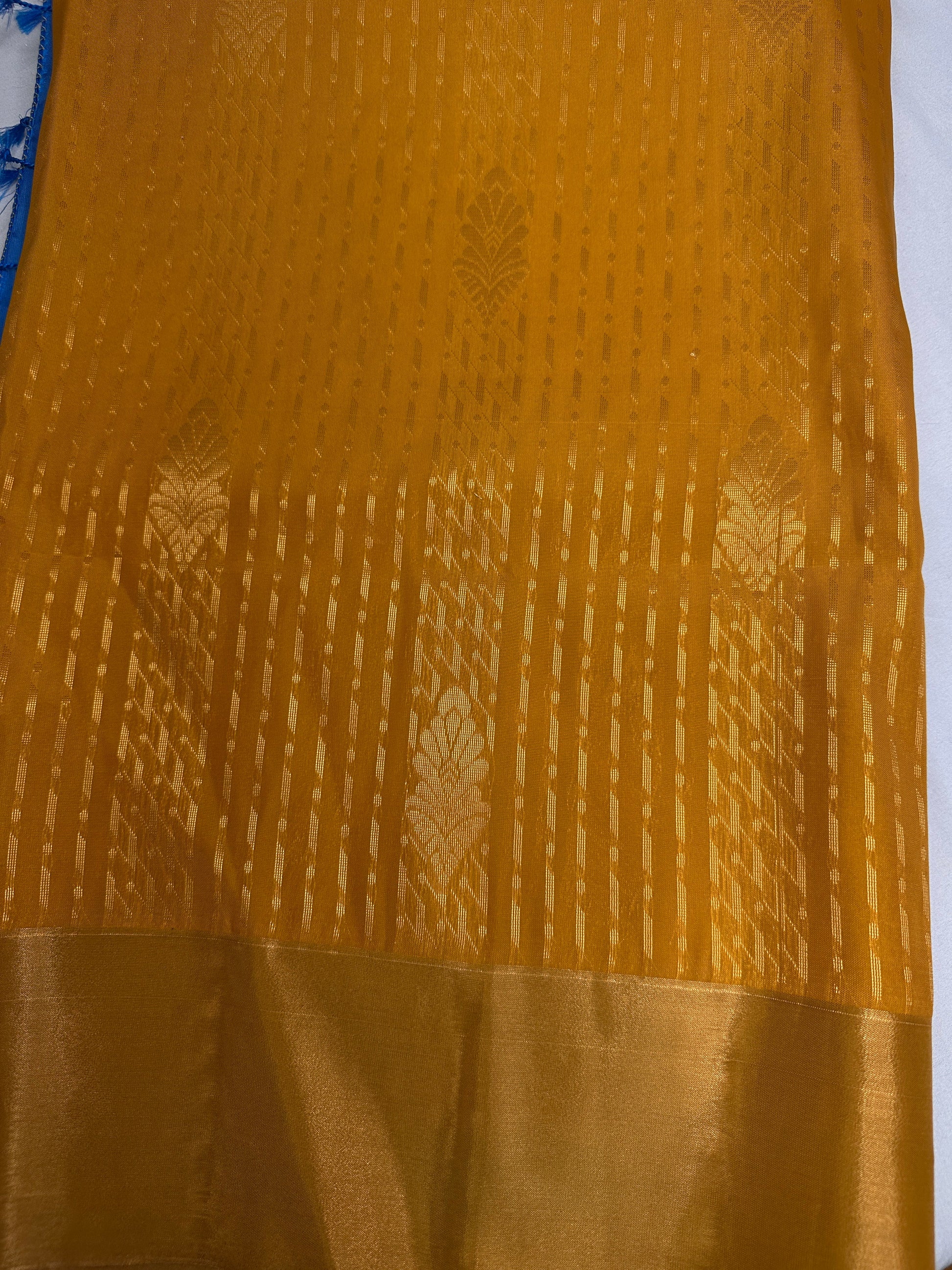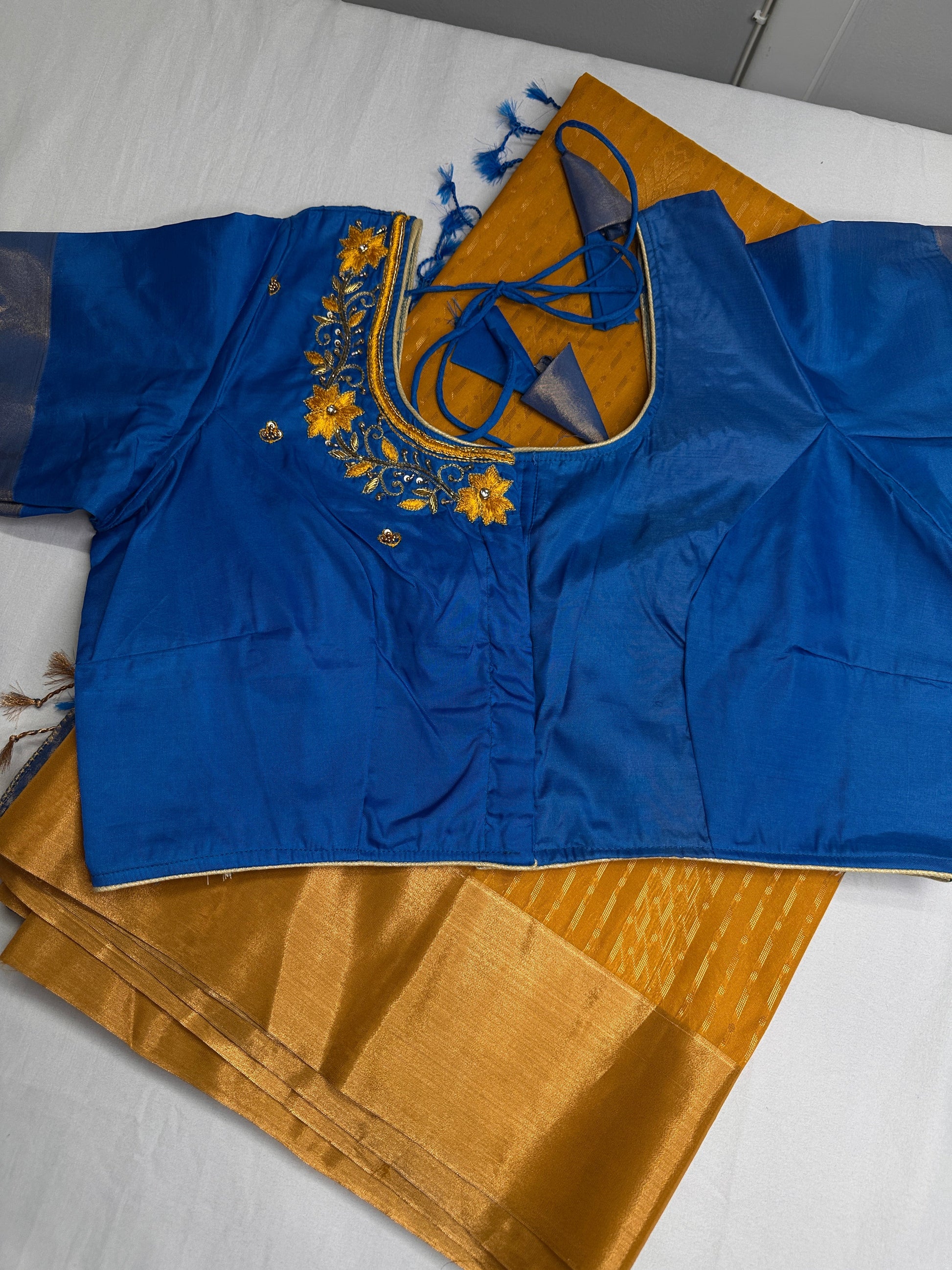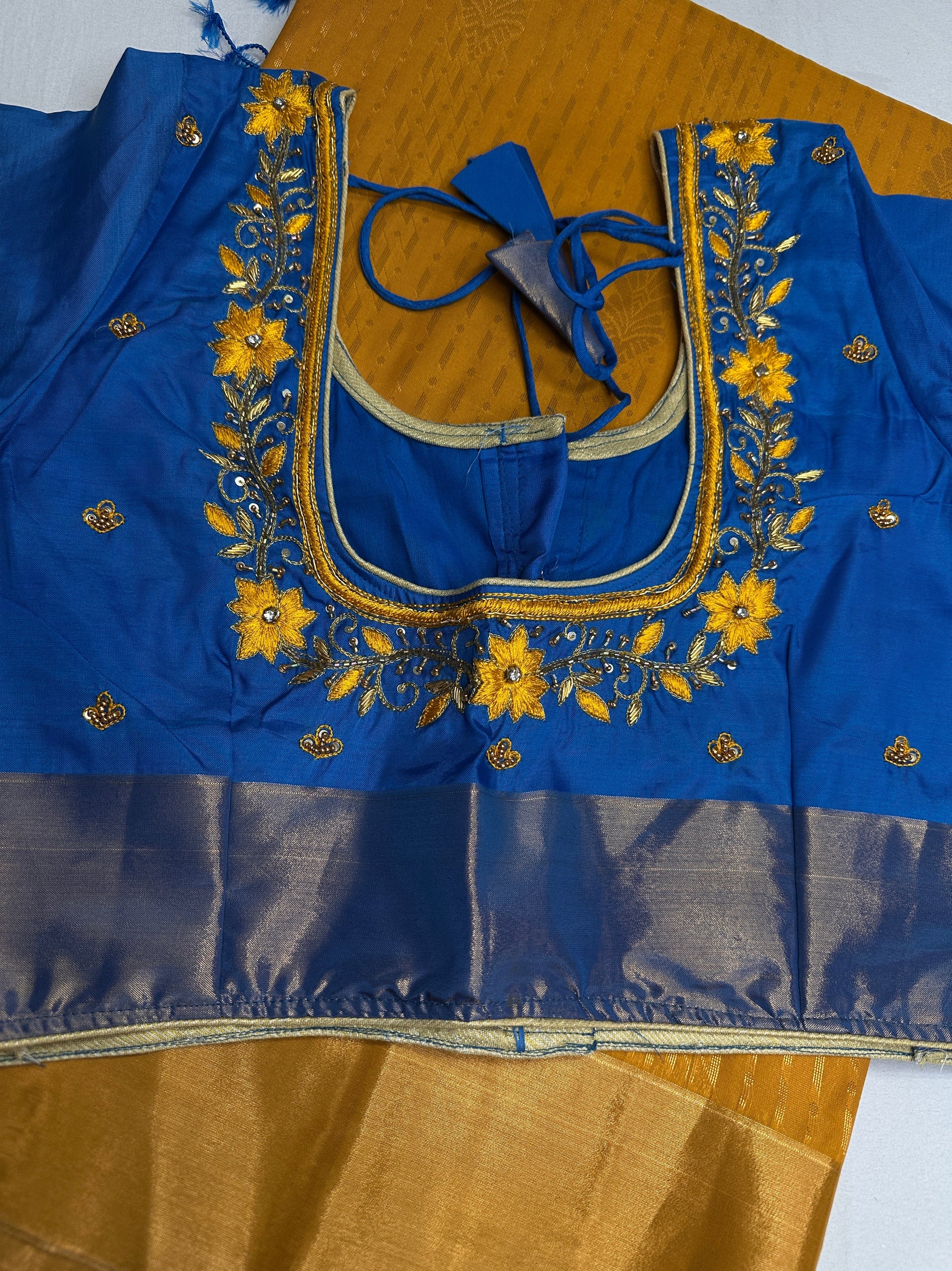 Uppada Semi Silk Mustard Saree Saree Details : Mustard Color Saree Blue Pallu Fall and Pico done Blouse Details : Blue Blouse Size 38 and has margin to go up to Size 46; Sleeves Length : 9 Inches: Blouse Length : 15 Inches; Front Neck : 7 Inches; Back Neck : 10 Inches Inches
