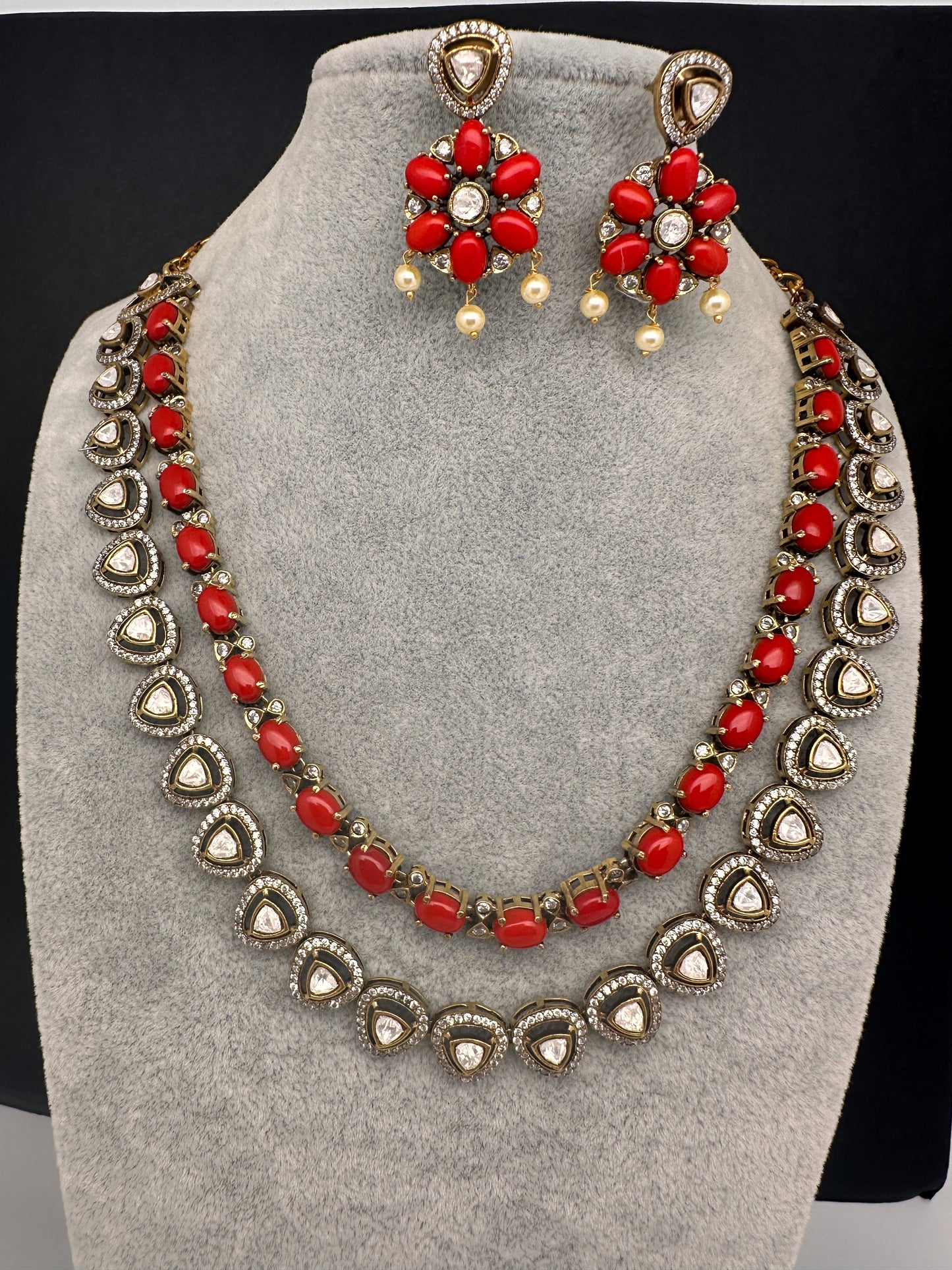Victorian Double Layer Color Stone Moissnite Necklace with Matching EarringsColor : Victorian MehndiSize : Necklace Length : 16 Inches; Earrings Length : 1.5 InchesStones : AD --Color-- Stone --Color