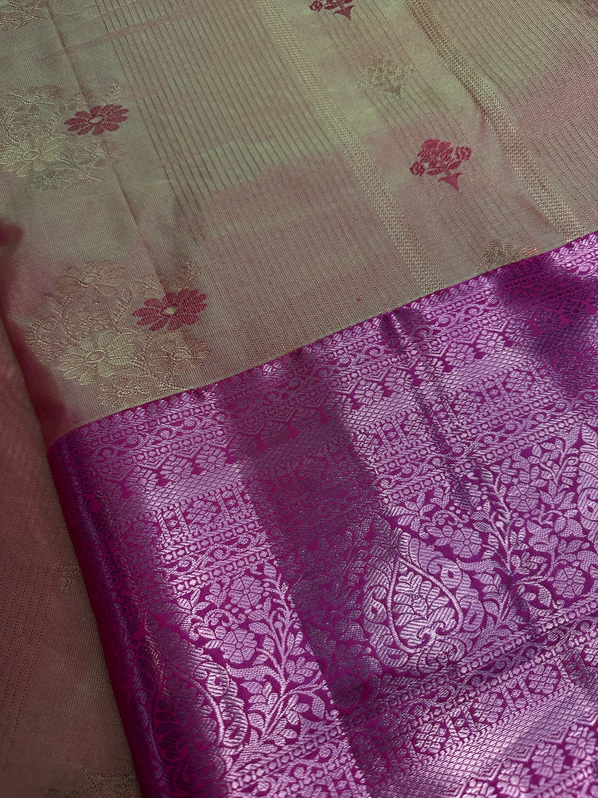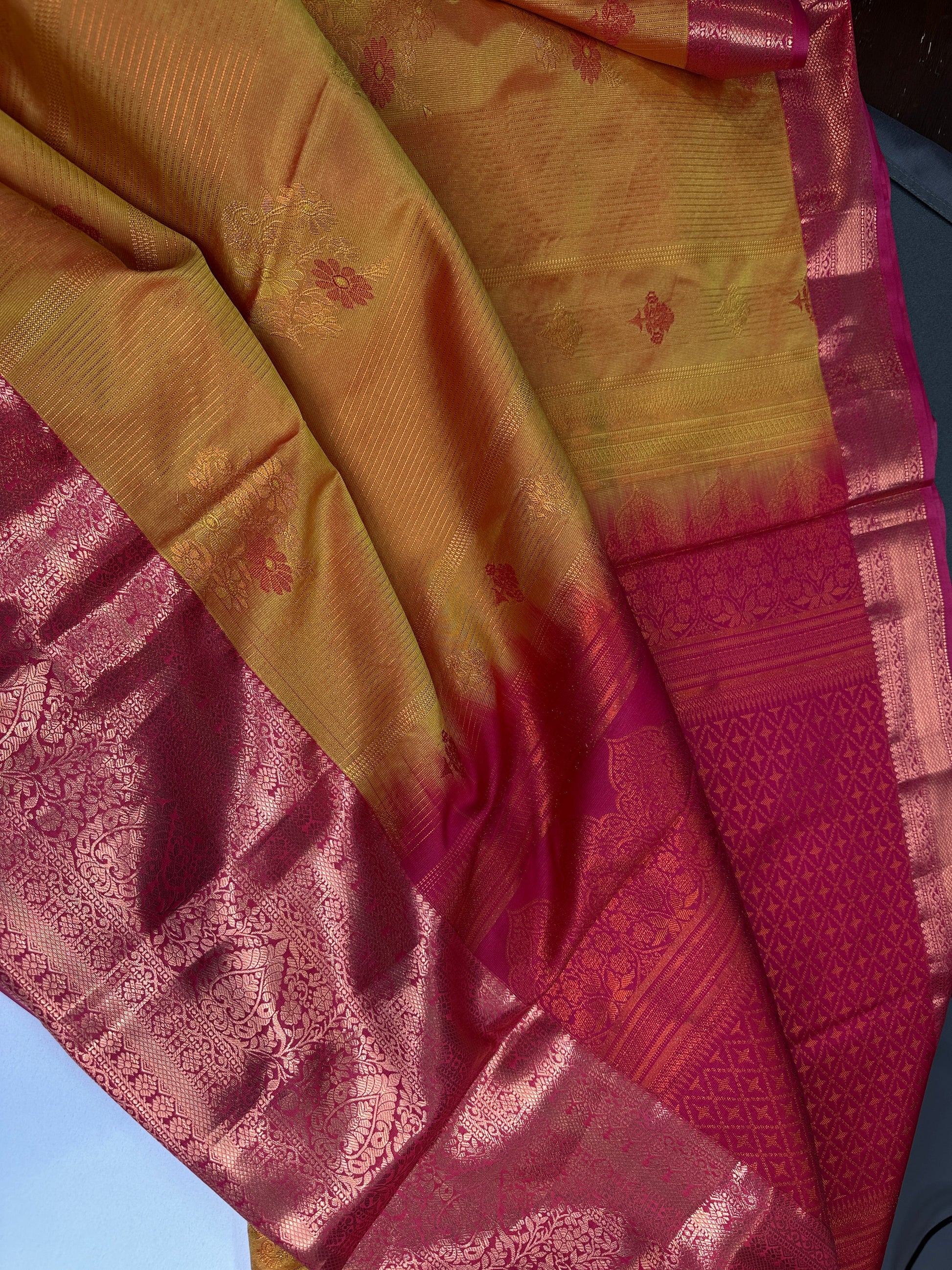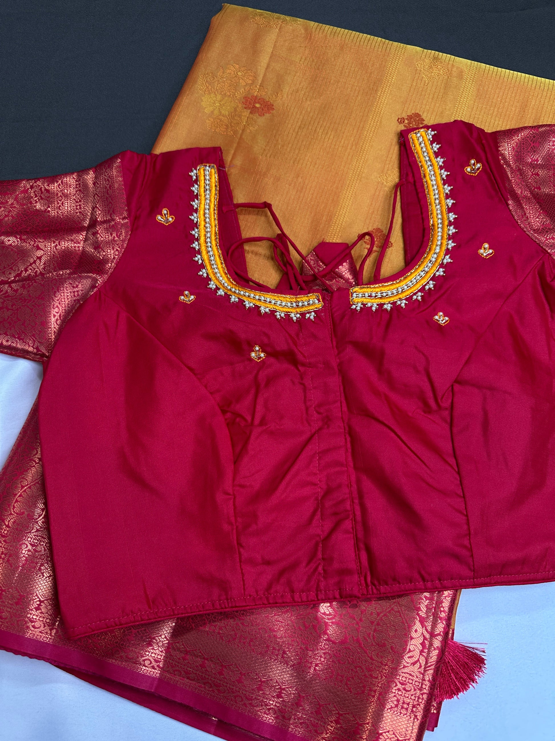 Vintage Orange Pink Soft Silk Saree Saree Details : Yellow Color Saree Pink Pallu Fall and Pico done Blouse Details : Pink Blouse Size 38 and has margin to go up to Size 42; Sleeves Length : 8 Inches: Blouse Length : 15 Inches; Front Neck : 7 Inches; Back Neck : 9 Inches