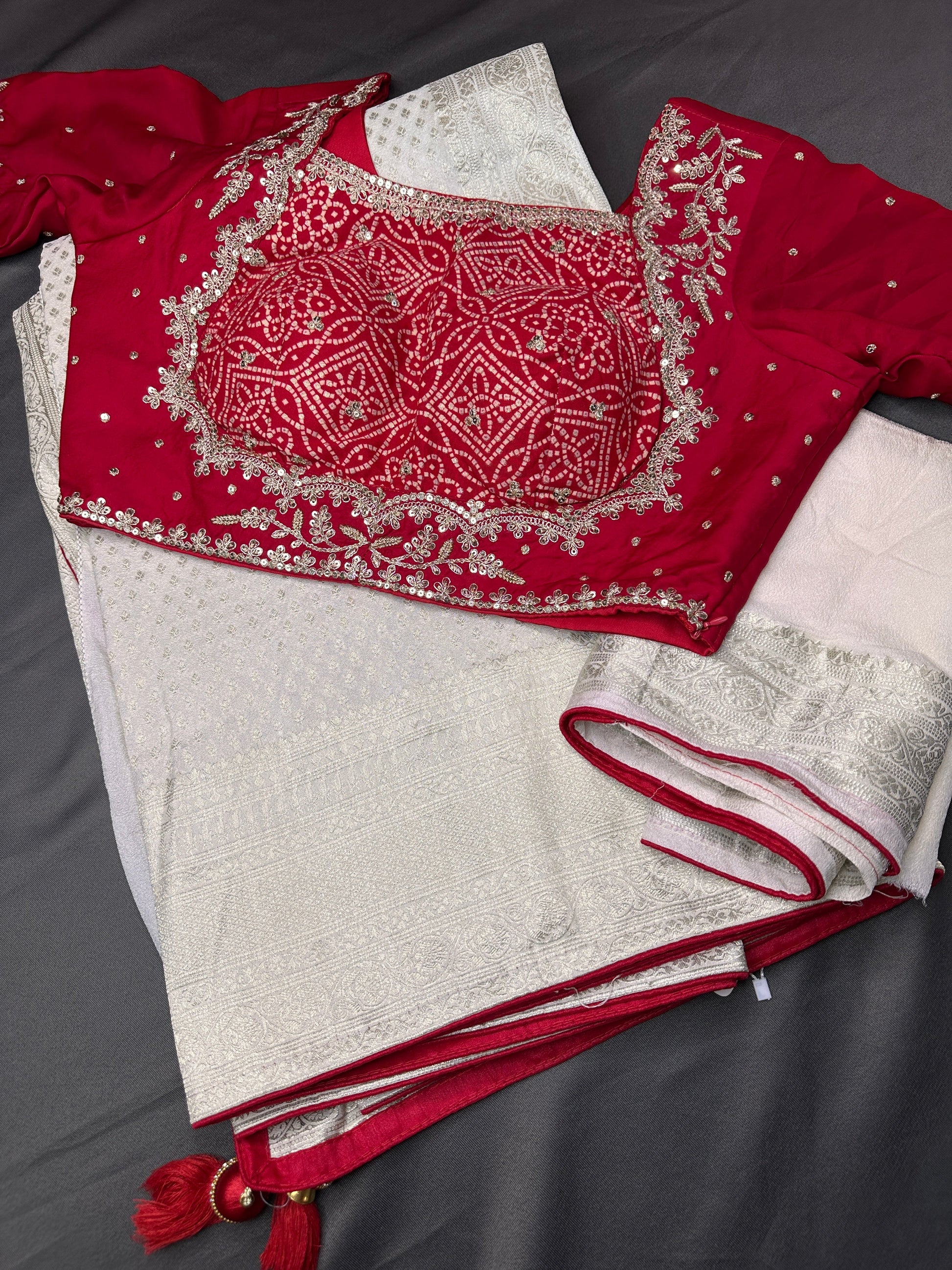 White Saree with Red Saree and a blouse piece Saree Details : White Color Saree White Pallu Fall and Pico done Blouse Details : Red Padded Blouse Size 38 and has margin to go up to Size 44; Sleeves Length : 11 Inches: Blouse Length : 14.5 Inches; Front Neck : 7 Inches; Back Neck : 8 Inches Inches