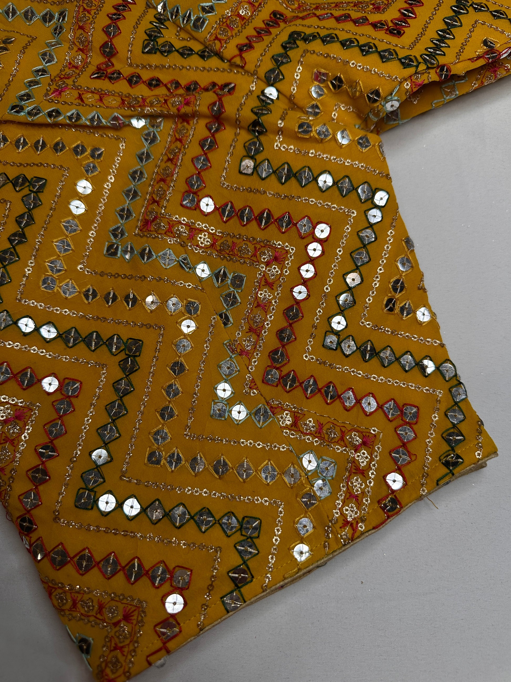 Yellow Foil Work Blouse Blouse Details : Blouse Color : Yellow; Blouse stitched Size 38 and has margin to open up to size 44, Sleeves Length : 9.5 Inches, blouse Length 14.5 Inches, FrontNeck : 9 Inches and Back Neck : Pot Neck;