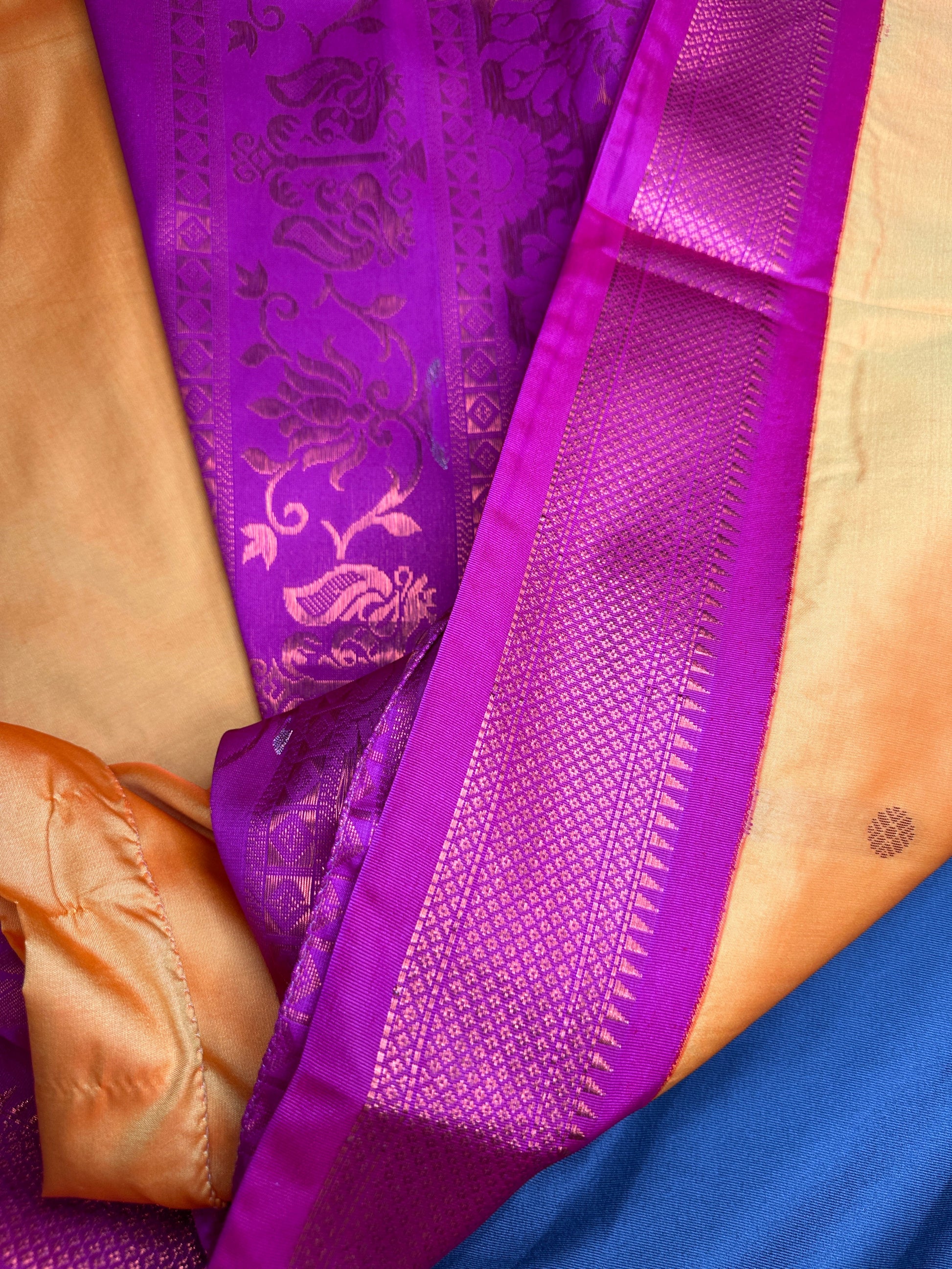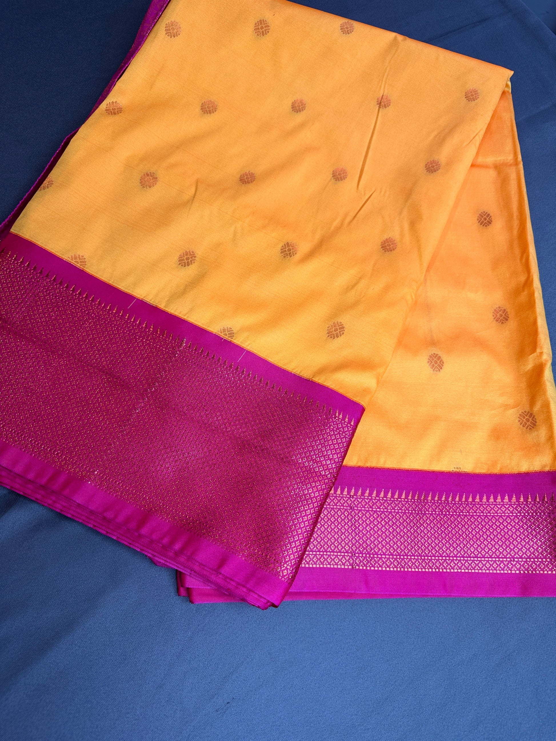 Yellow Pink Semi Handloom Purple Saree Saree Details : Yellow Color Saree Pink Pallu Fall and Pico done Blouse Details : Pink Maggam Work Blouse Size 40 and has margin to go up to Size 44; Sleeves Length : 11 Inches: Blouse Length : 15 Inches; Front Neck : 7 Inches; Back Neck : 8 Inches Inches