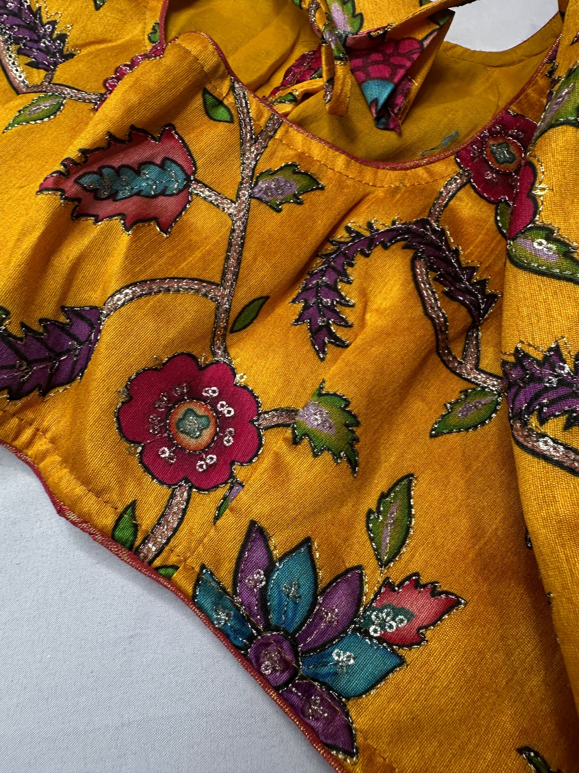 Blouse Details : Blouse Color : Yellow; Blouse stitched Size 36 and has margin to open up to size 42, Sleeves Length : 10 Inches, blouse Length 14.5 Inches, FrontNeck : 7 Inches and Back Neck : 4 Inches;