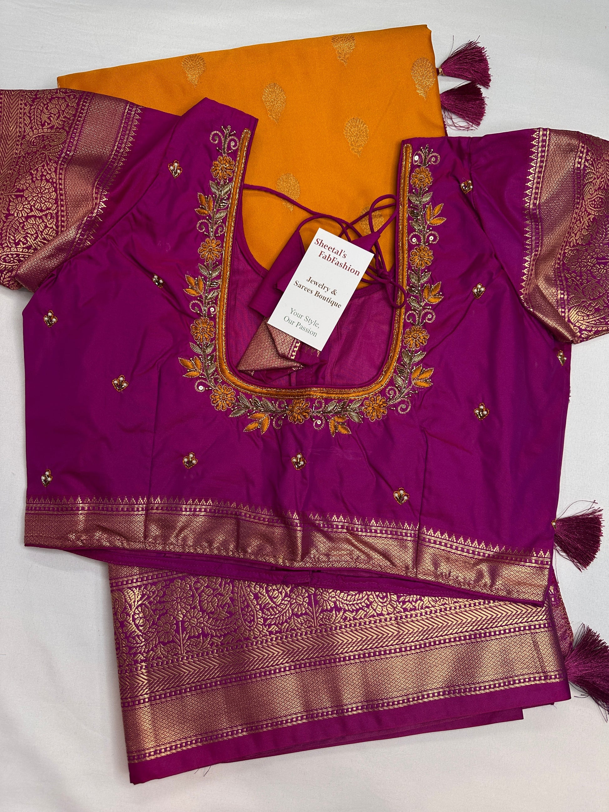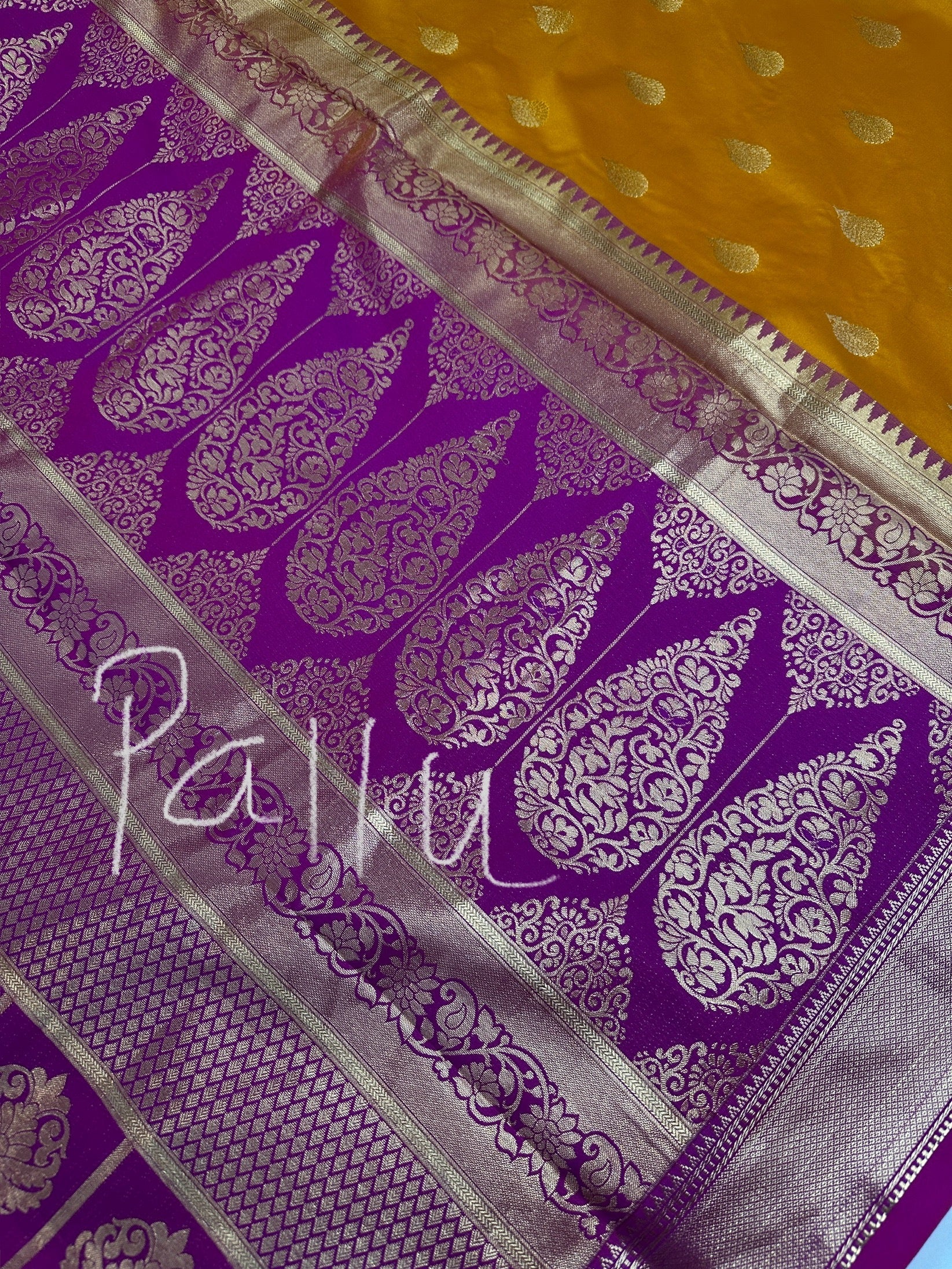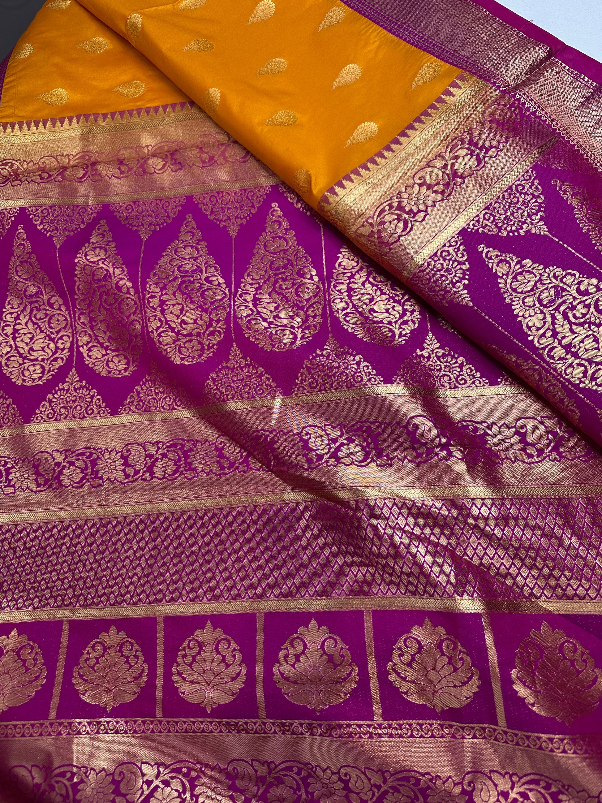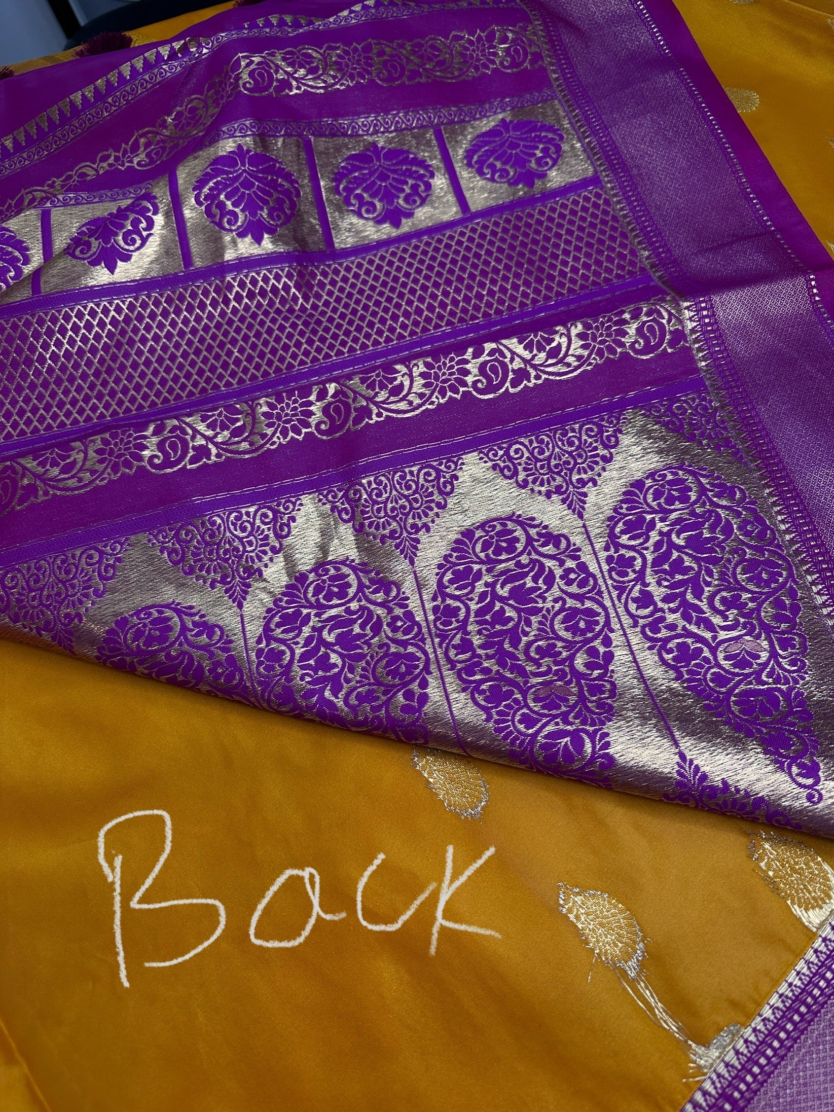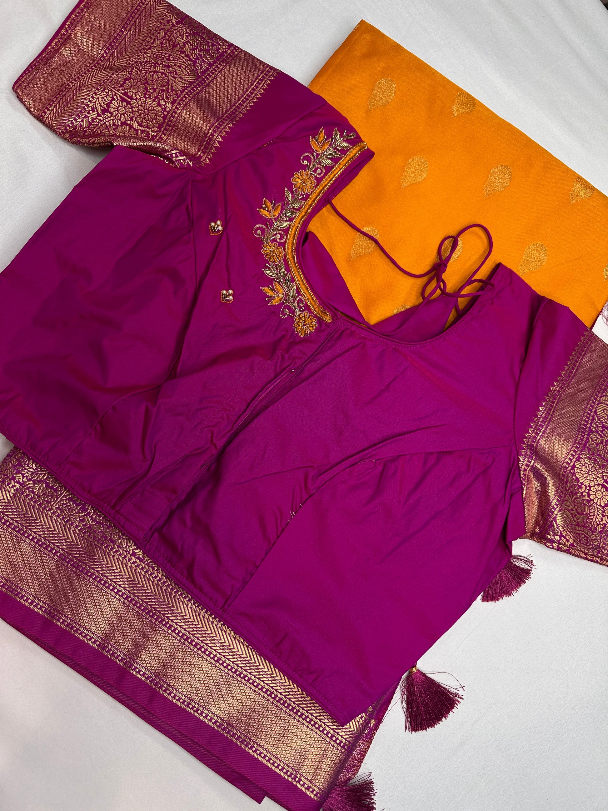yellow Traditional Semi Gadwal Saree Saree Details : Yellow Color Saree Pink Pallu Fall and Pico done Blouse Details : Pink Blouse Size 38 and has margin to go up to Size 44; Sleeves Length : 9 Inches: Blouse Length : 15 Inches; Front Neck : 7 Inches; Back Neck : 9 Inches