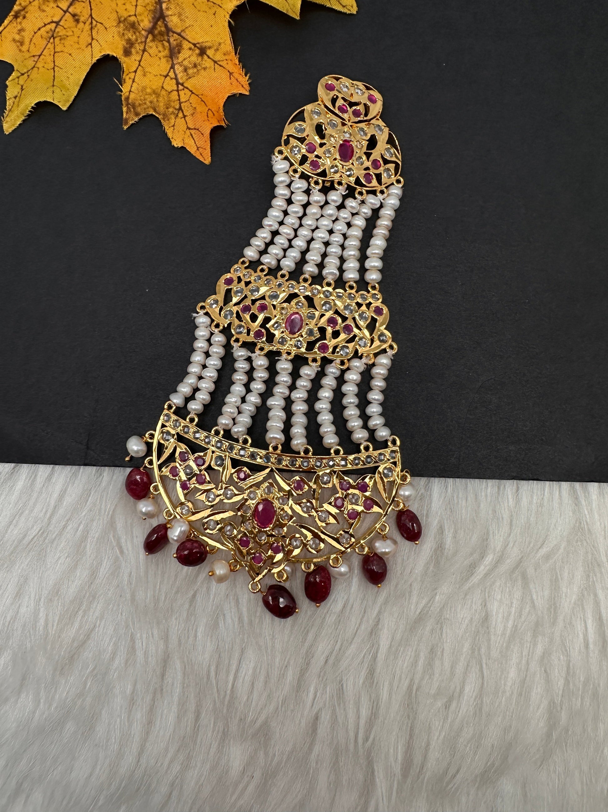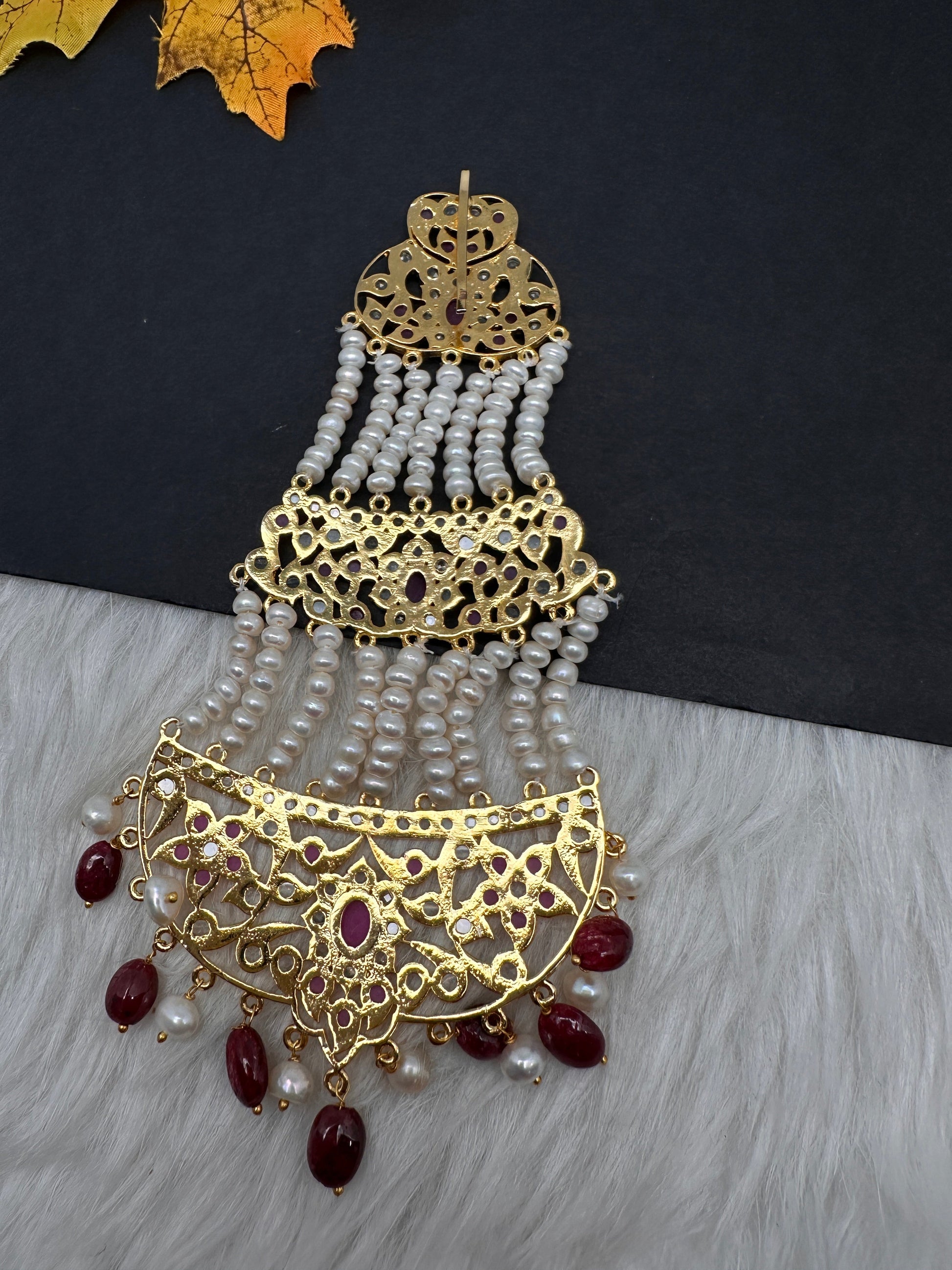6 Carat Gold Plated Hyderabadi Jadau Real Pearls Pearls Golden JhoomarColor : GoldenSize : Length : Approx 6 inchesStones : Hyderabadi Jadau and Pearls