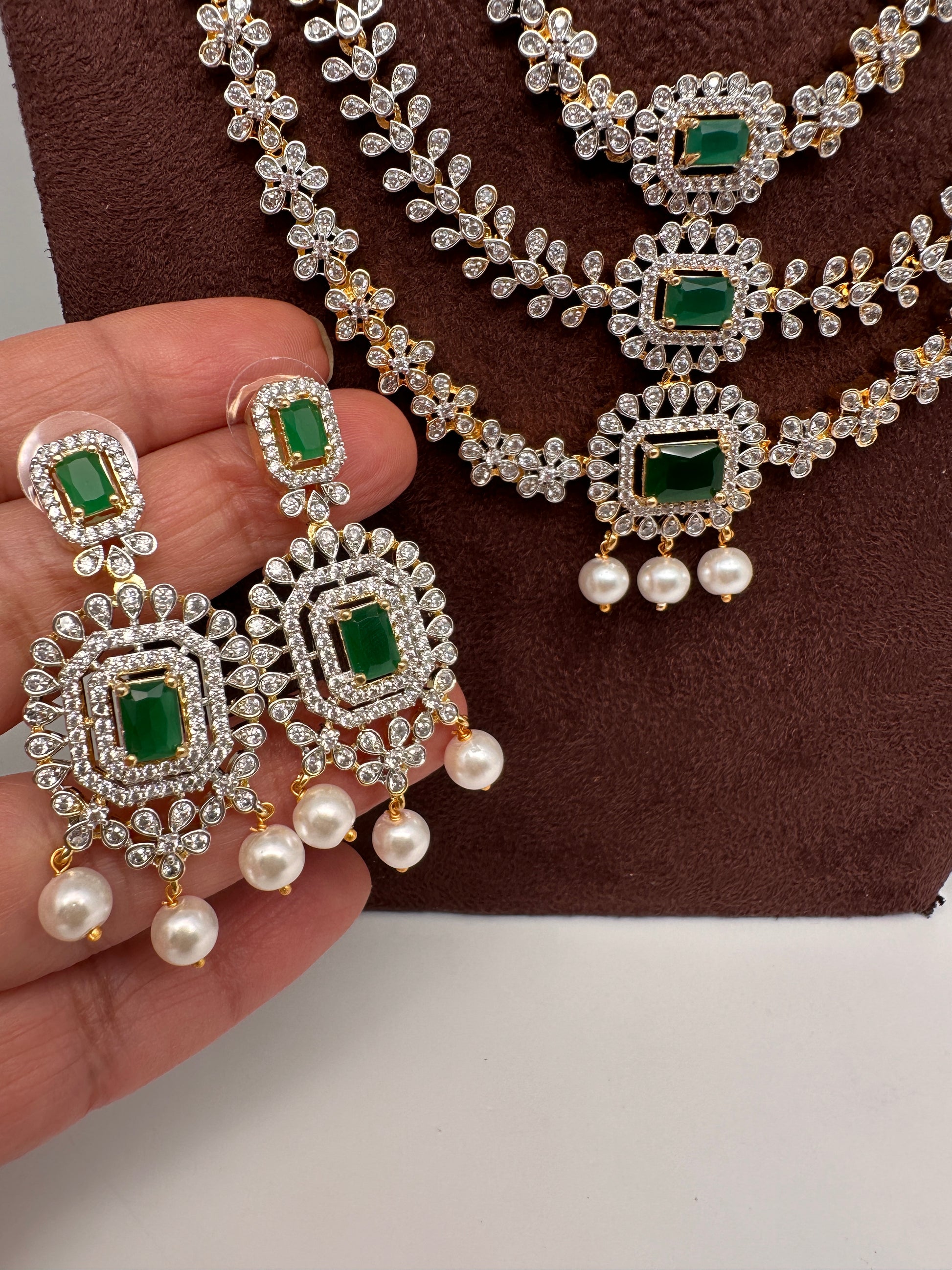 AD Color Stone Diamond Finish Multi Layer Long Necklace with matching earringsColor : Golden ADSize : Necklace Length : Approx 20 Inches; Earrings Length : 2 Inches;Stones : AD-Color Stone