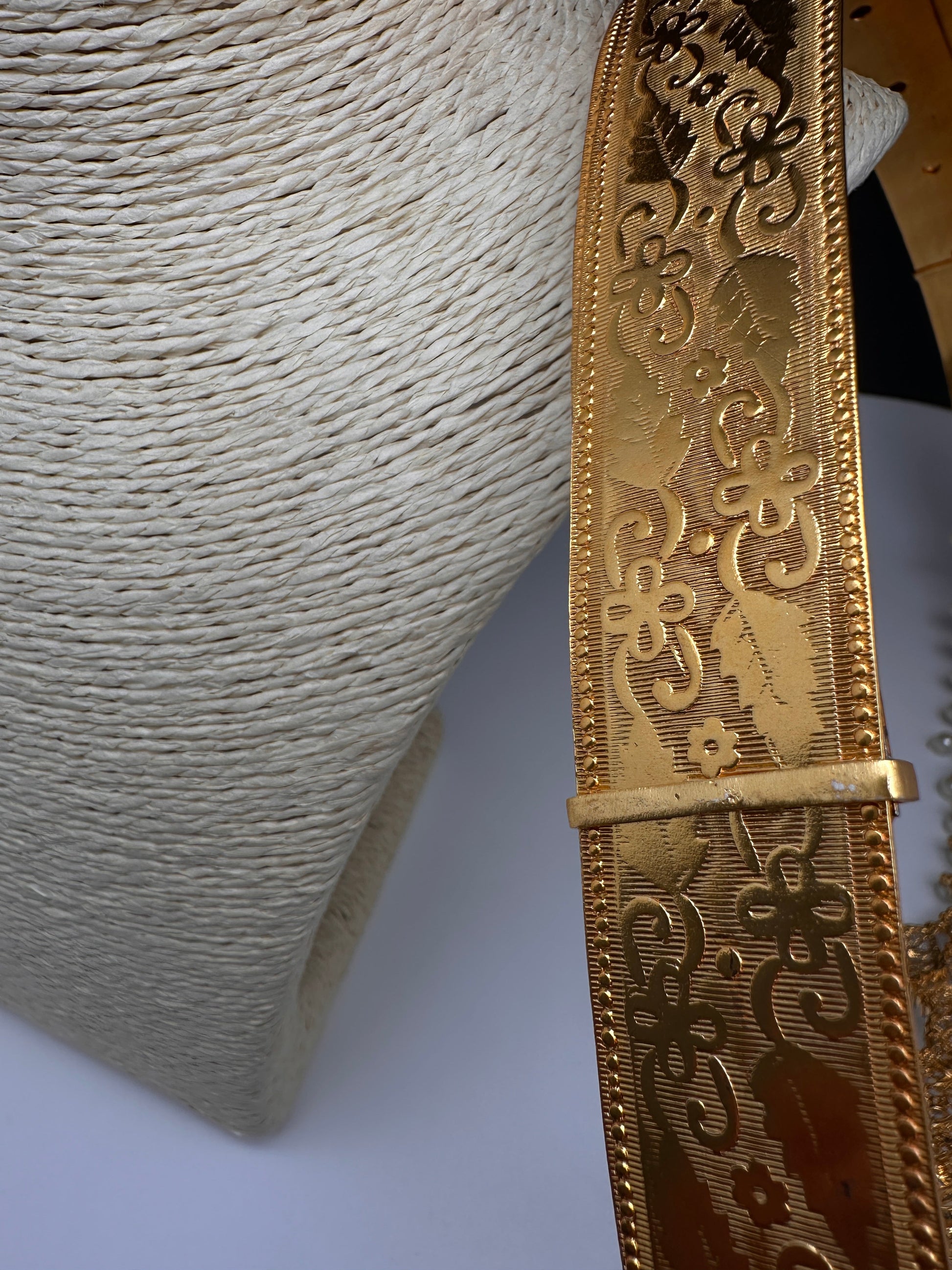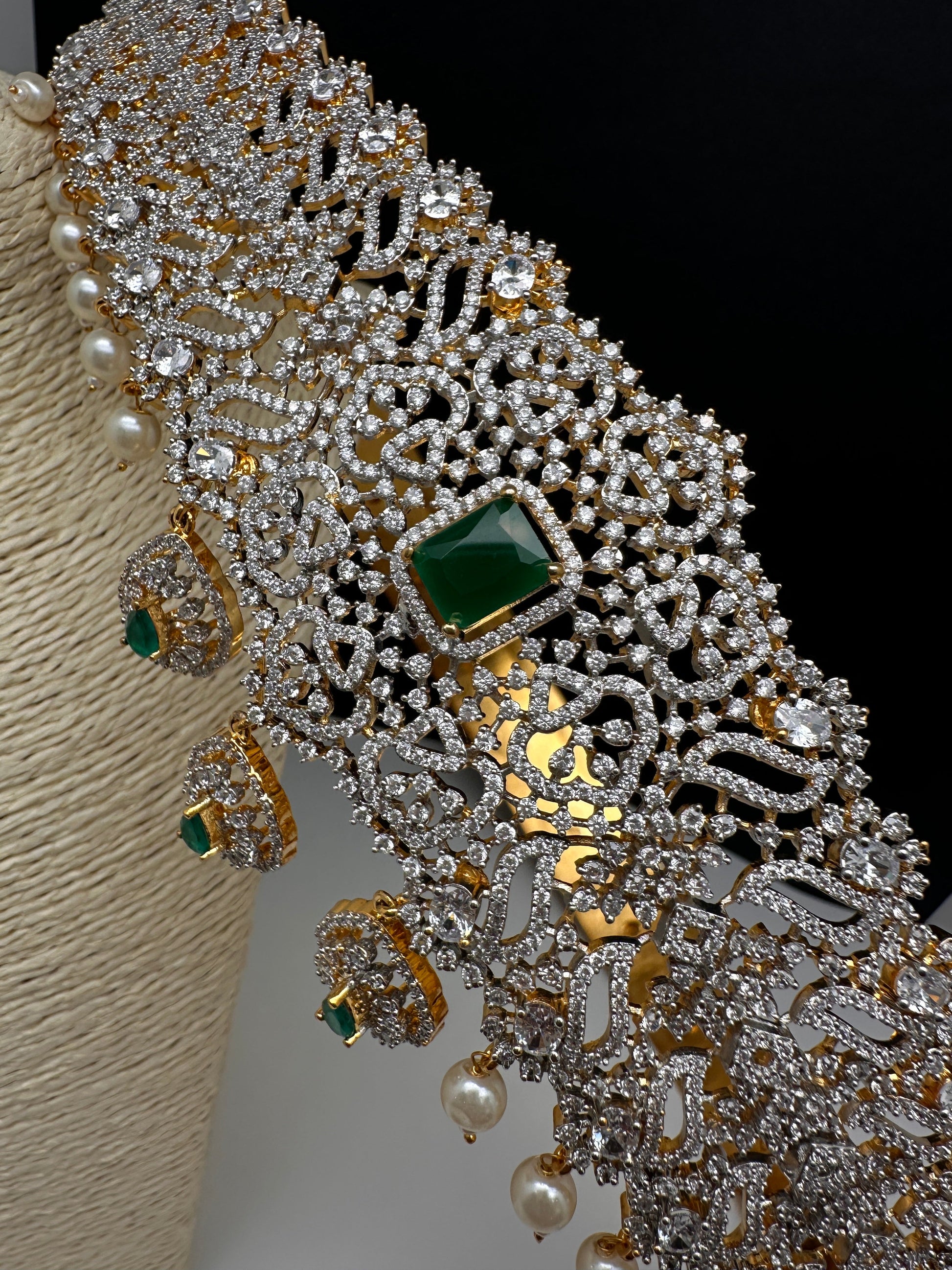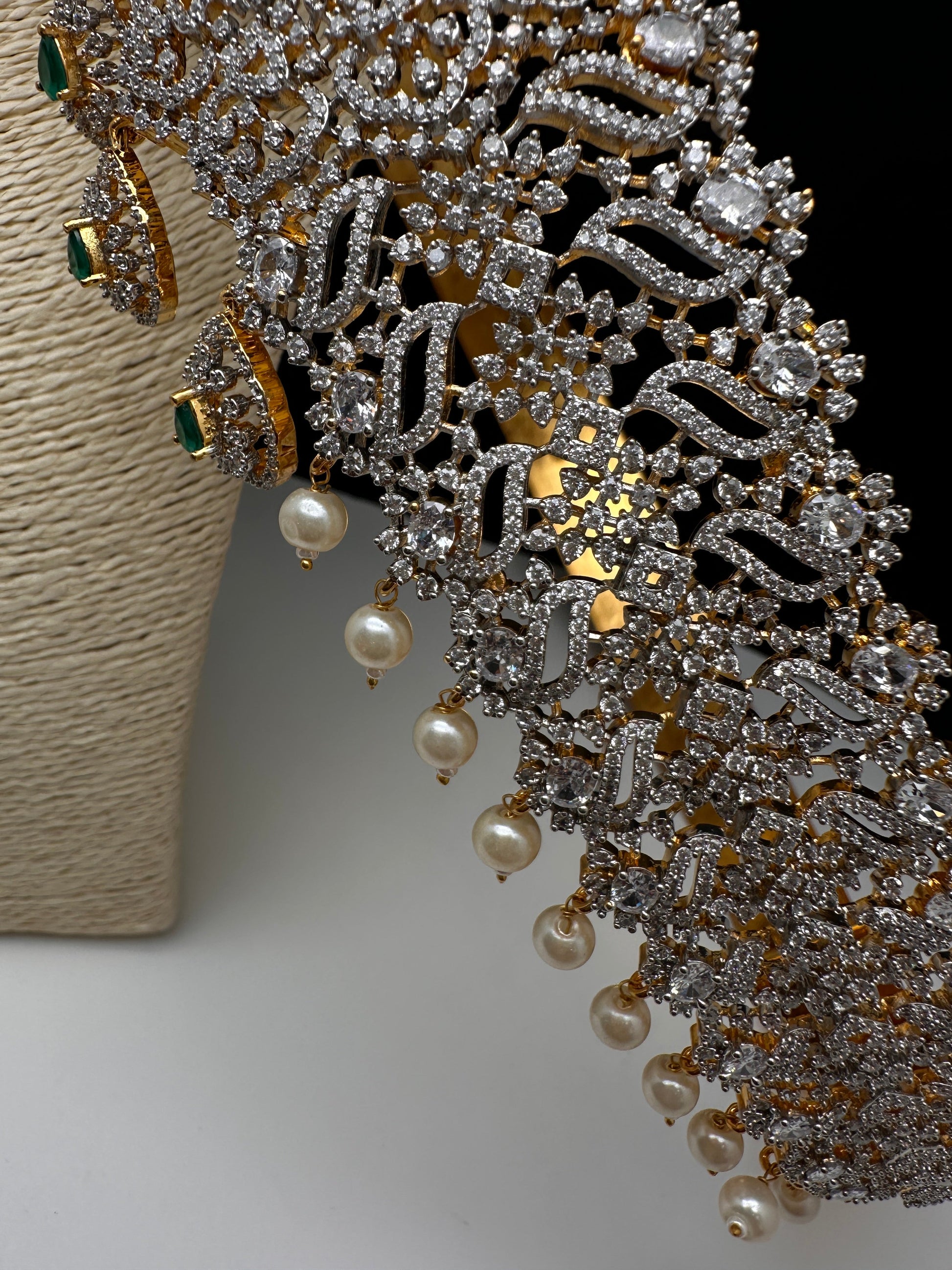 AD Diamond Finish Emerald Green Stone Hip Belt Kamarbandh long around waist adjustable waist beltColor : GoldenSize : Maximum Length : 41 Inches; Minimum Length : 29 Inches; Front Design Length : 12 InchesStones : Green Stone CZ Pearls