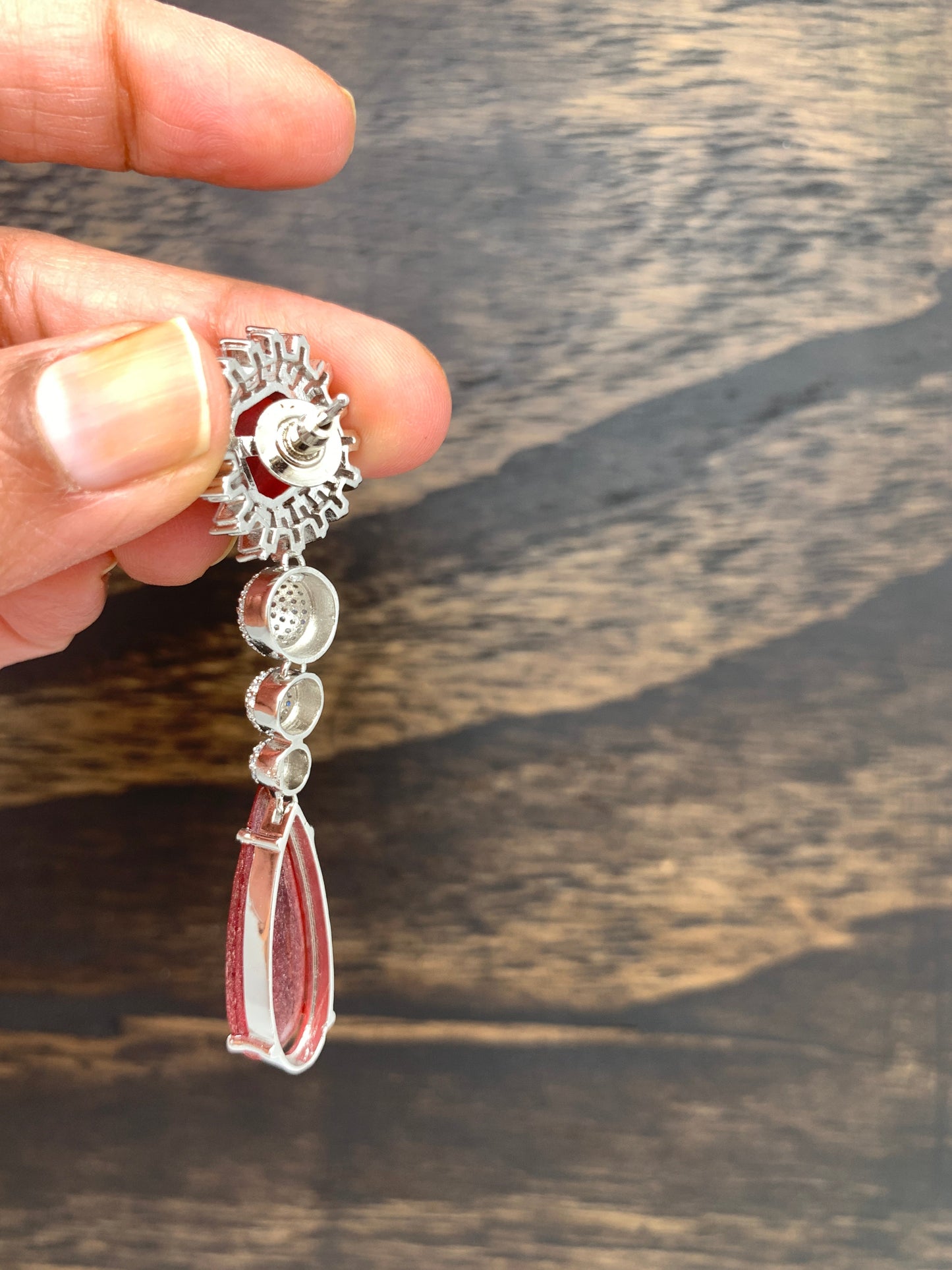 AD Earrings with Red Stone in Silver PolishColor : Diamond FinishSize : Approx 3 Inches; Weight Approx 10 Gms EachStones : American Diamond Red Stone