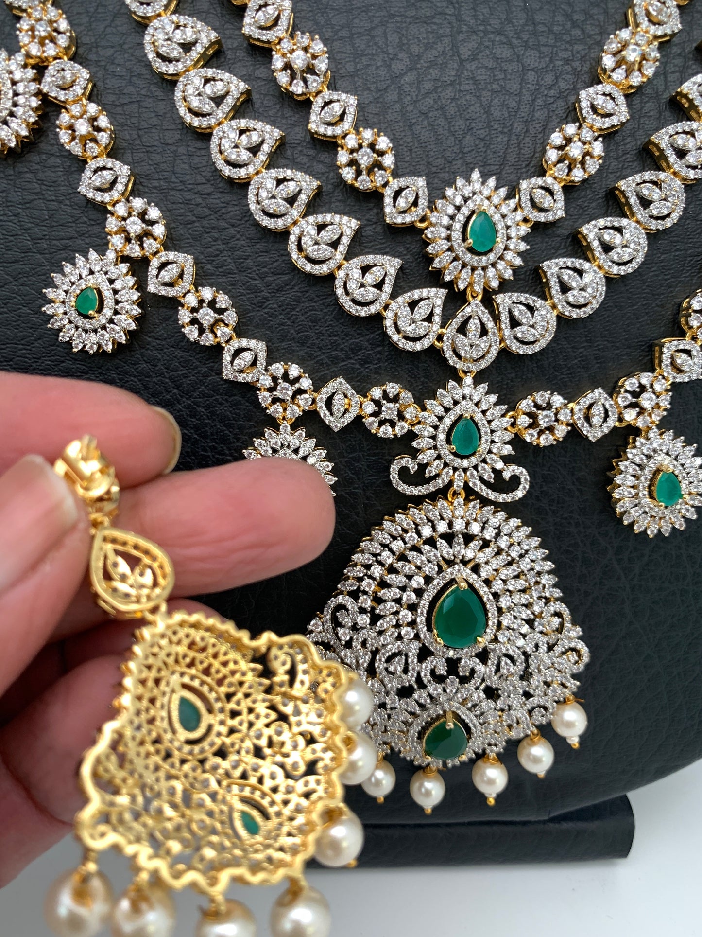 AD Emerald Green Stone Three Layer Teen Lada Long Necklace with matching screwback earrings