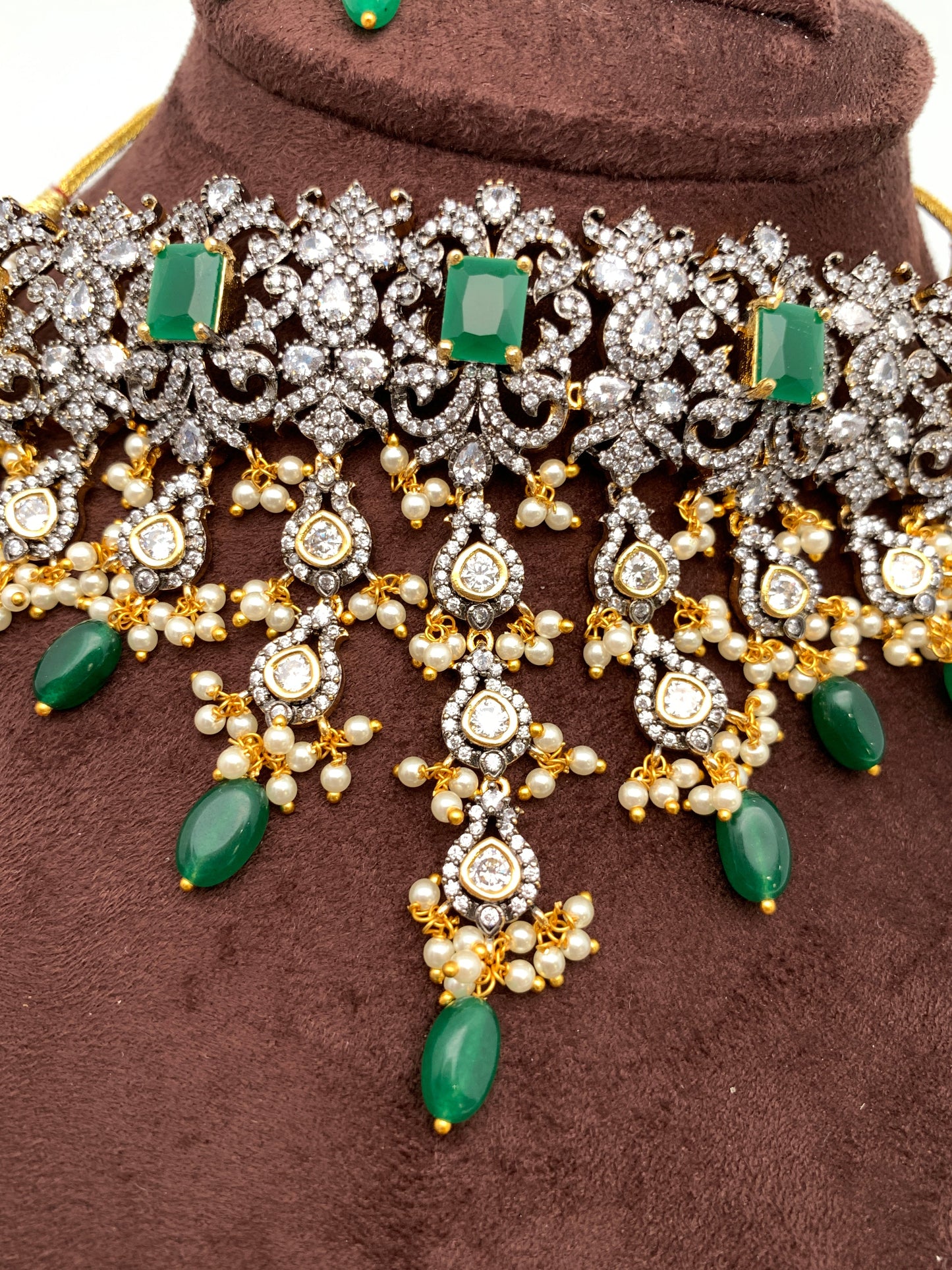 AD Green Stone Dual Polish Choker with Matching Screwback Earrings
