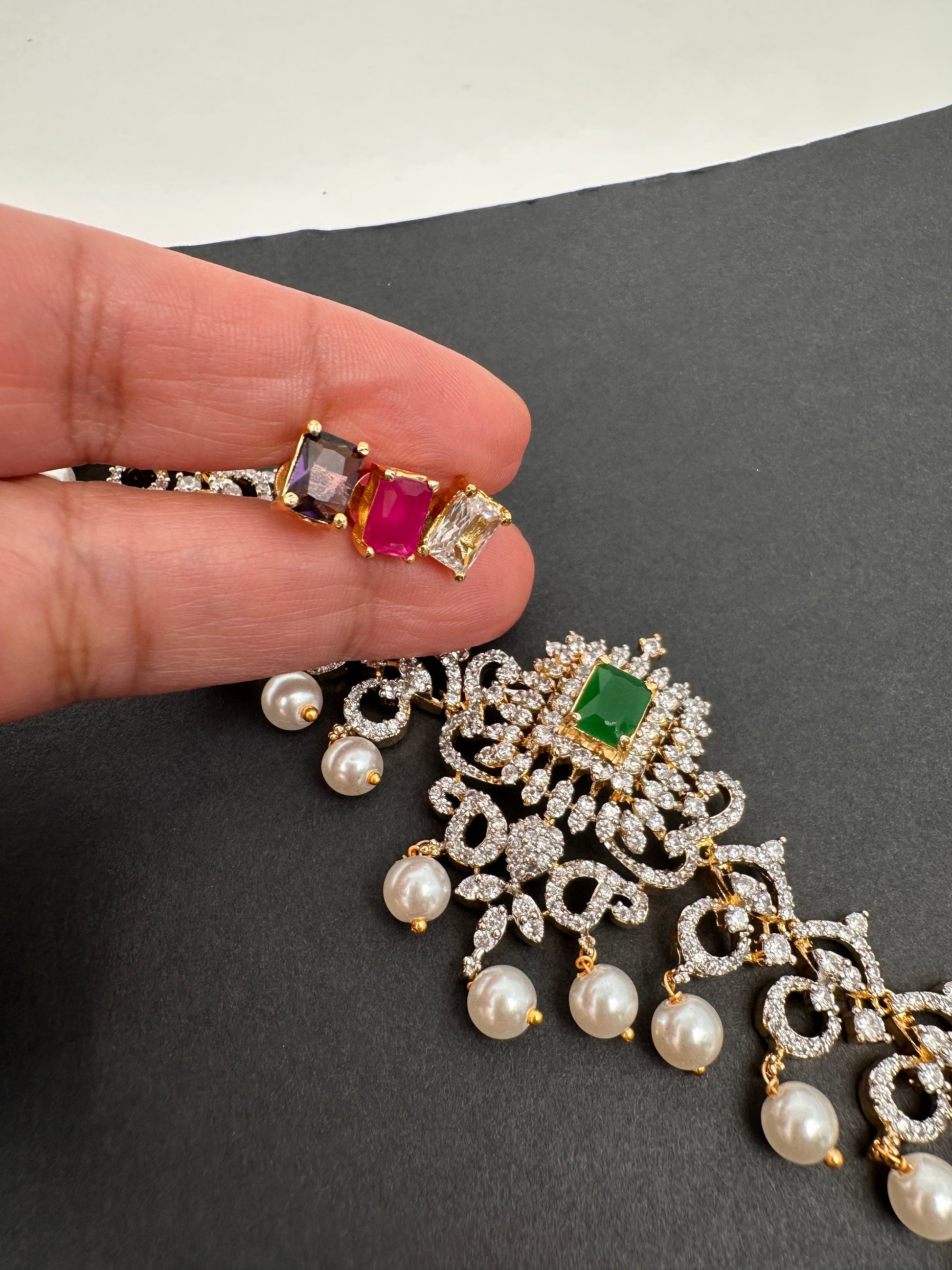 AD Kamarband Hip Chain With Changabale Stones Finish long around waist adjustable waist belt ideal for kids Color : Golden Size : Maximum Length : 41 Inches; Minimum Length : 29 Inches; Front Design Length : 11 Inches Stones : Red Green Purple Clear Stone CZ and Pearls