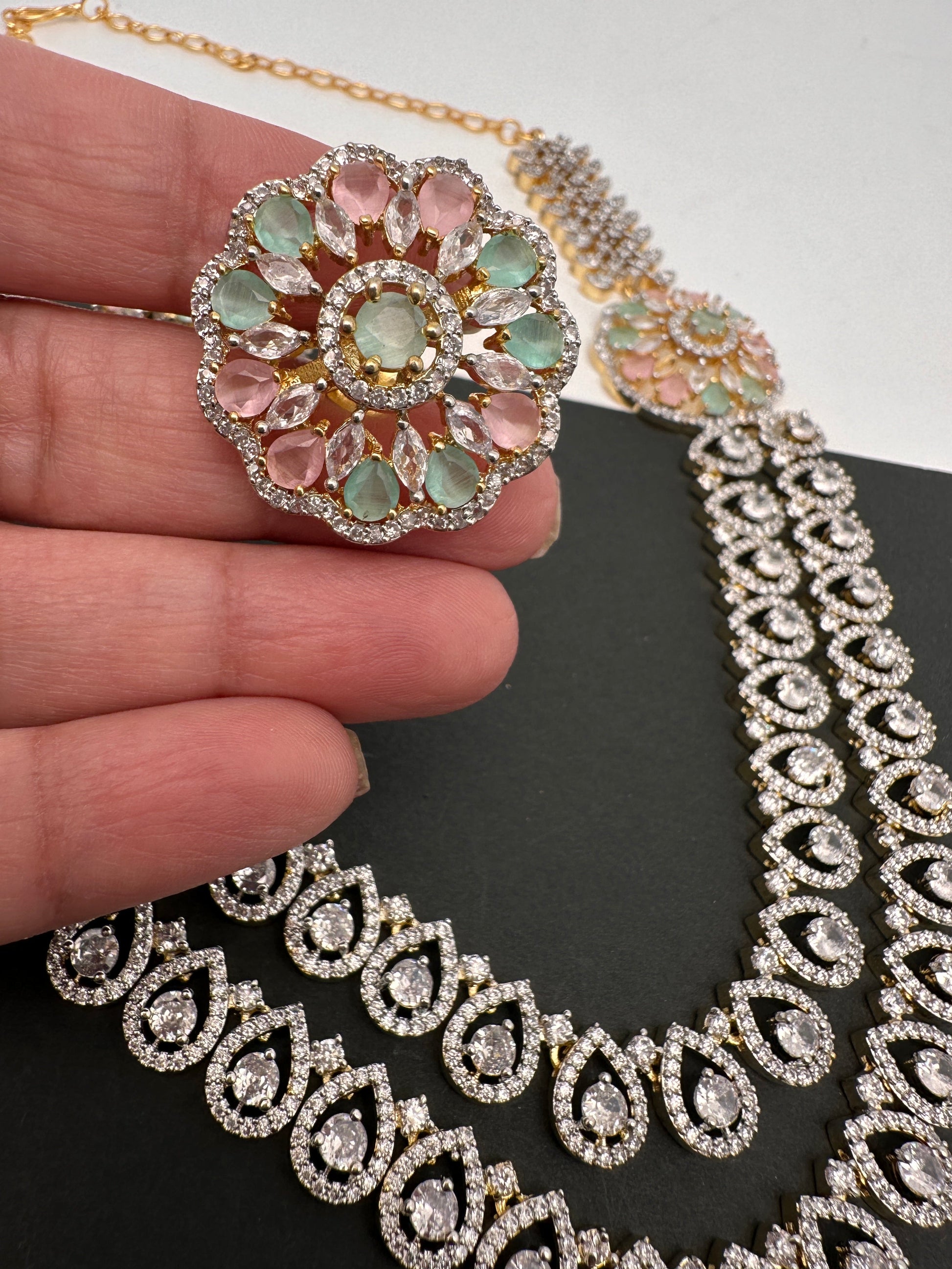 AD Mint Green Pink Stone Short Necklace with matching studsColor : Golden ADSize : Necklace Length : Approx 16 Inches; Earrings Length : 1 Inches;Stones : AD Mint Green Pink Stone