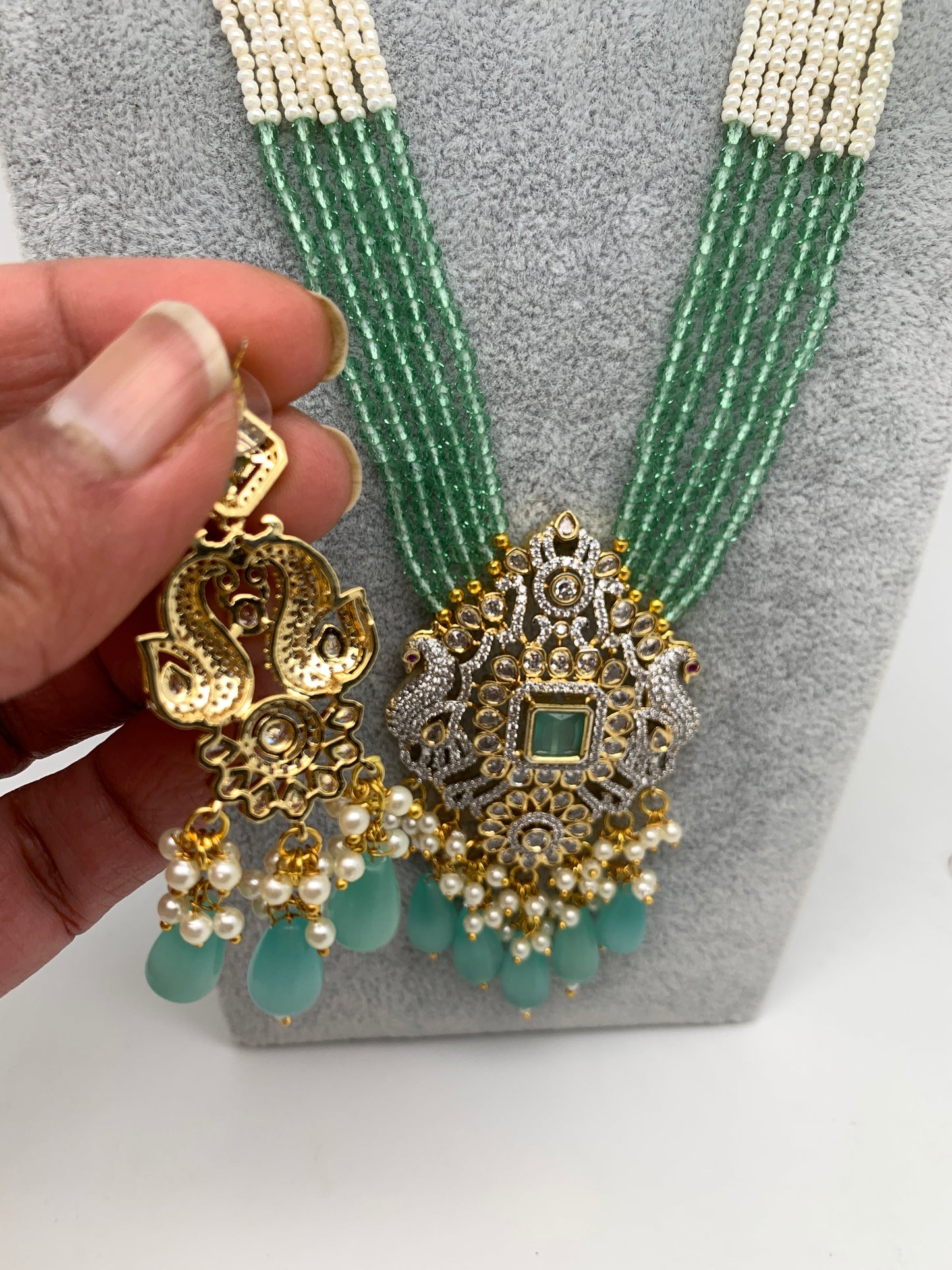 AD Mint Green Stone Mint Green Beads Peacock Pendent Mint Green White Hydro Beads Long Mala with matching earrings Color : Golden Size : Necklace Length : 22 Inches; Earring Length : 2.5 Inches Approx Stones : CZ Mint Green Stone Mint Green Beads White Hydro Beads Pearls