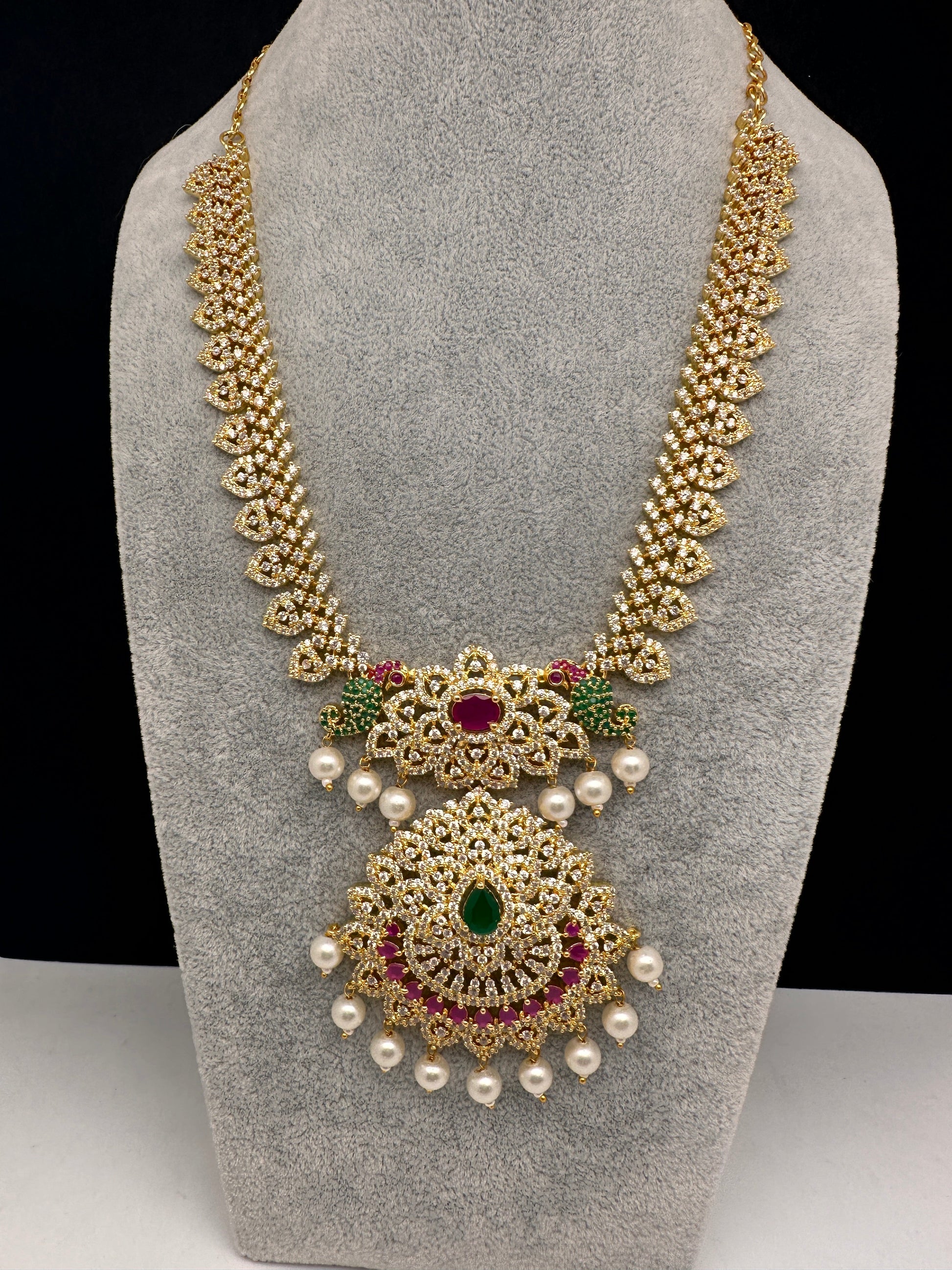 AD Red Green Multi Stone Peacock Design Golden Finish Short Necklacewith matching screwback earringsColor : GoldenSize : Necklace Length : Approx 16 inches; Earring Length : 1.75 InchesStones : CZ Red Green Stone Pearls