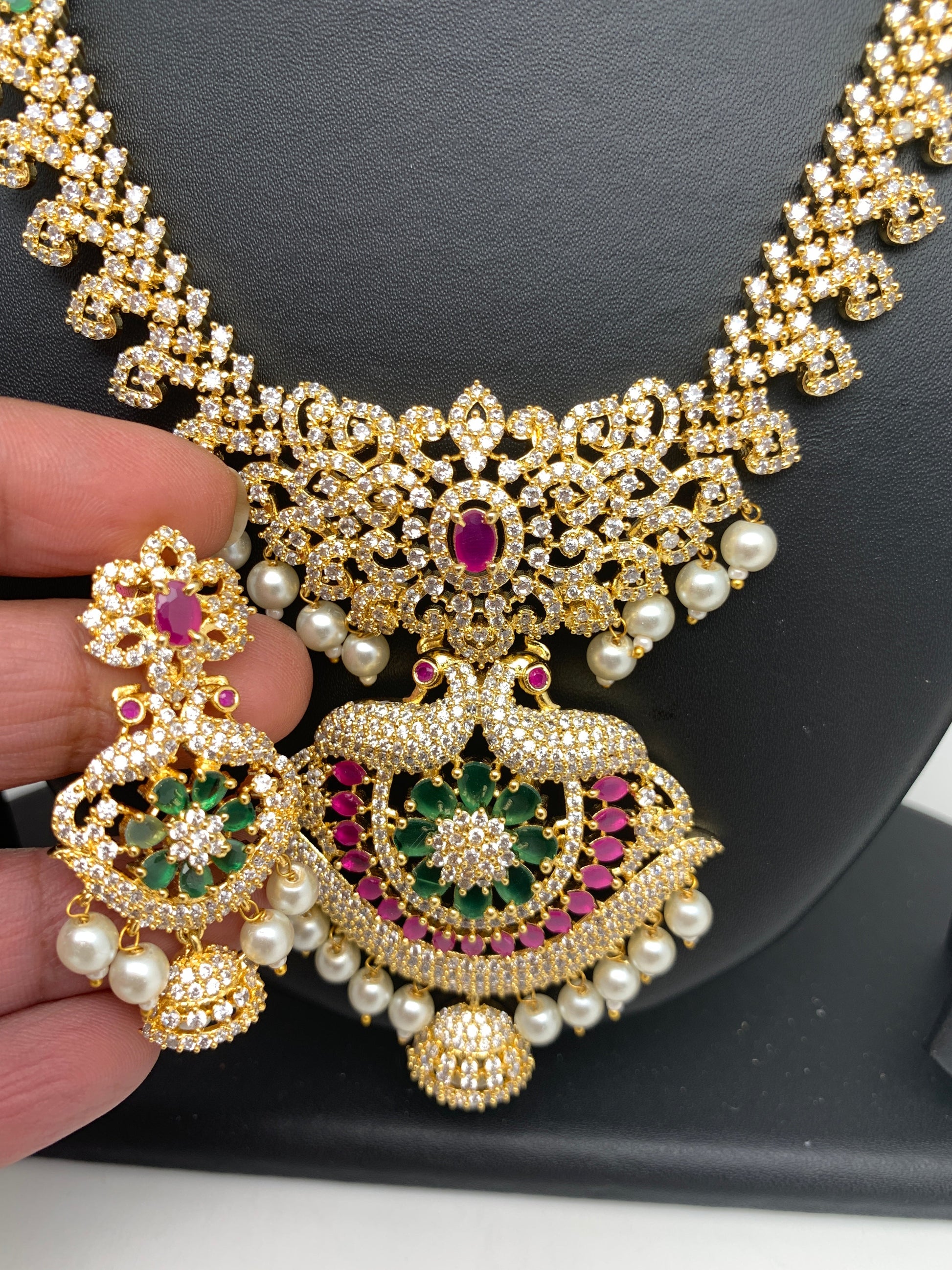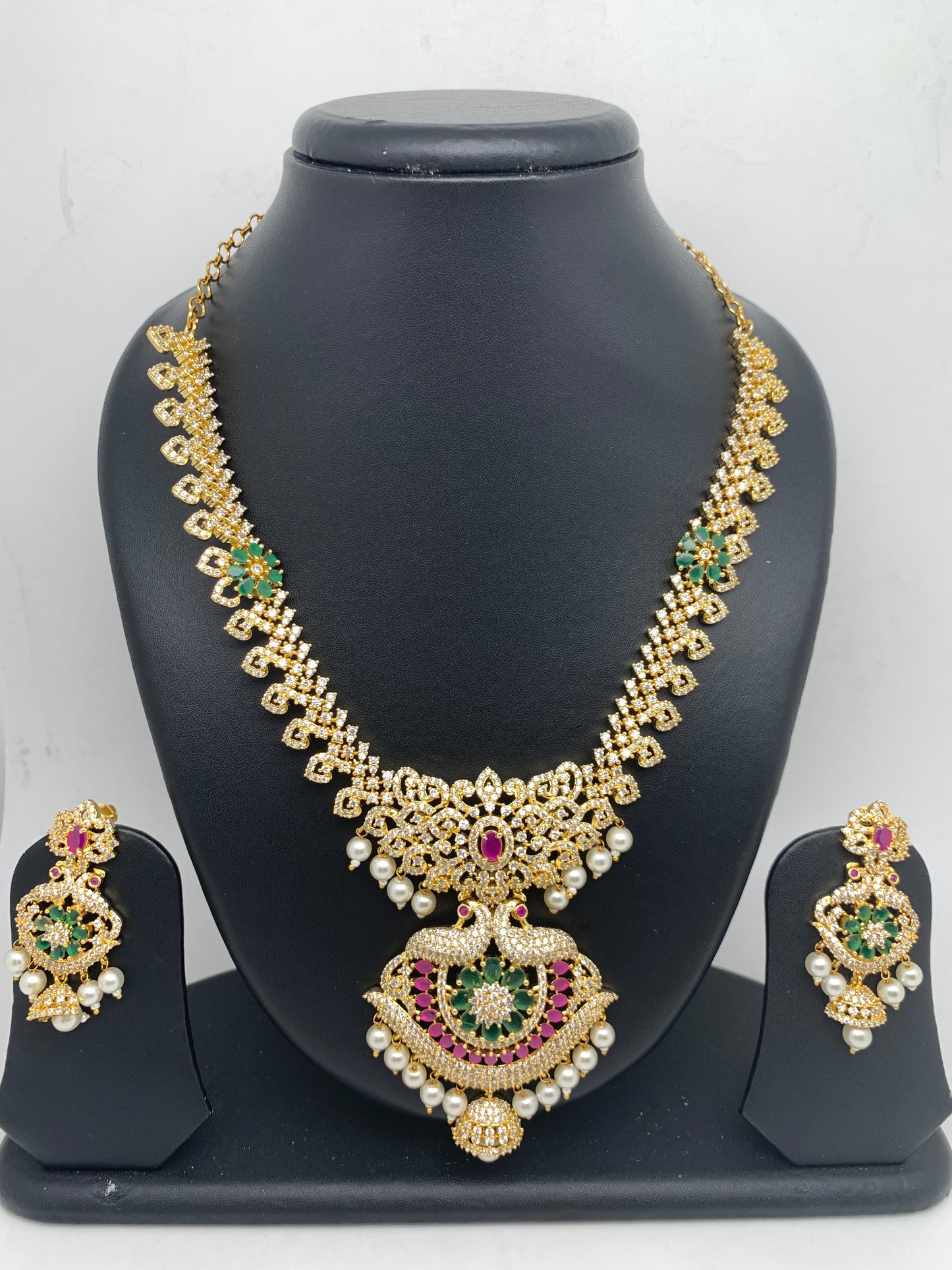 AD Red Green Stone Peacock Pendent Golden Finish Short Necklacewith matching screwback earringsColor : GoldenSize : Necklace Length : Approx 16 inches; Earring Length : 2 InchesStones : CZ Red Green Stone Pearls