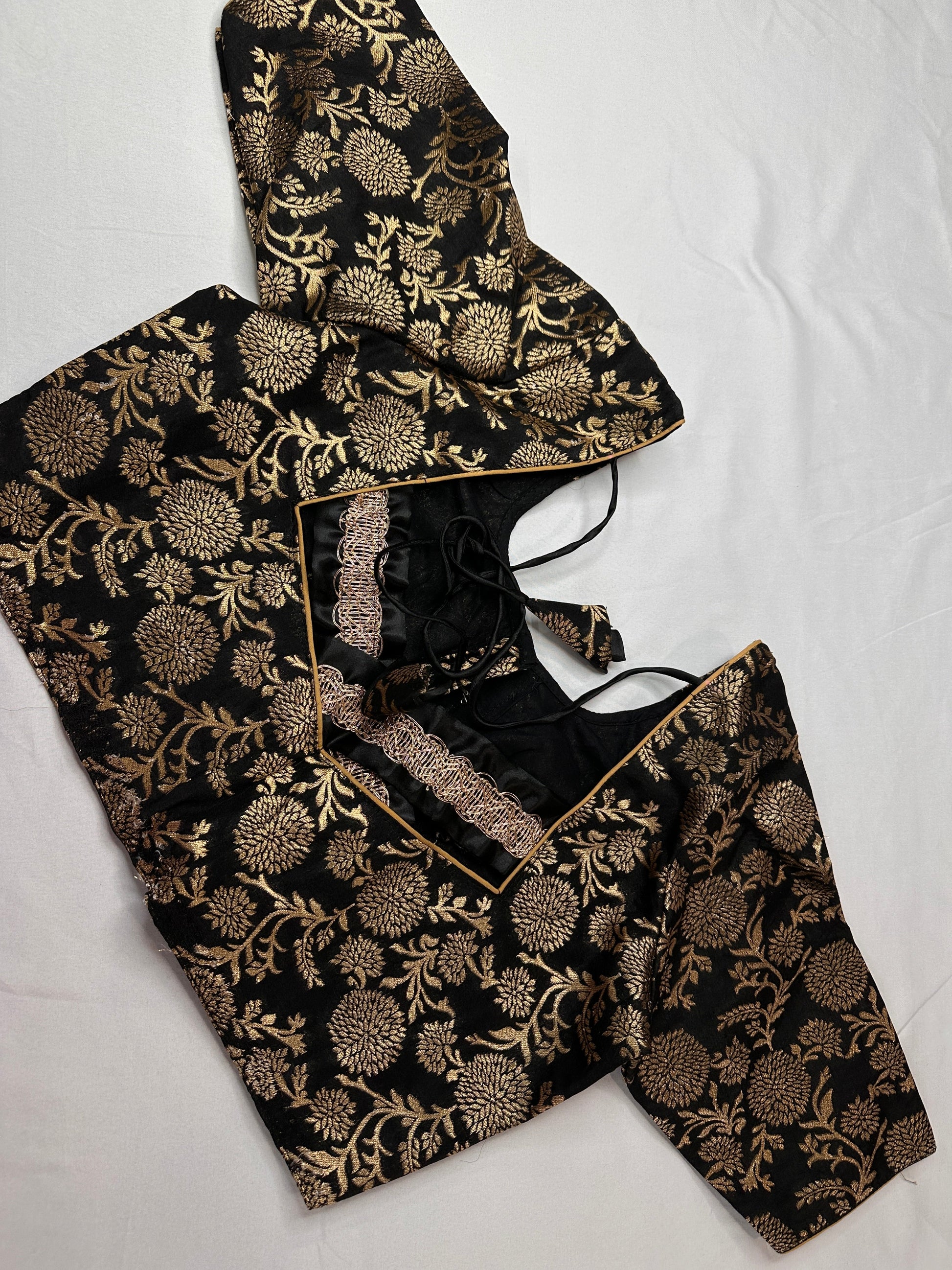 Blouse Details : Blouse Color : Black; Blouse stitched Size 38 and can be altered from 36 to 42, Sleeves Length : 9.5 Inches, blouse Length 15 Inches, FrontNeck : 7 Inches and Back Neck : 8 Inches;