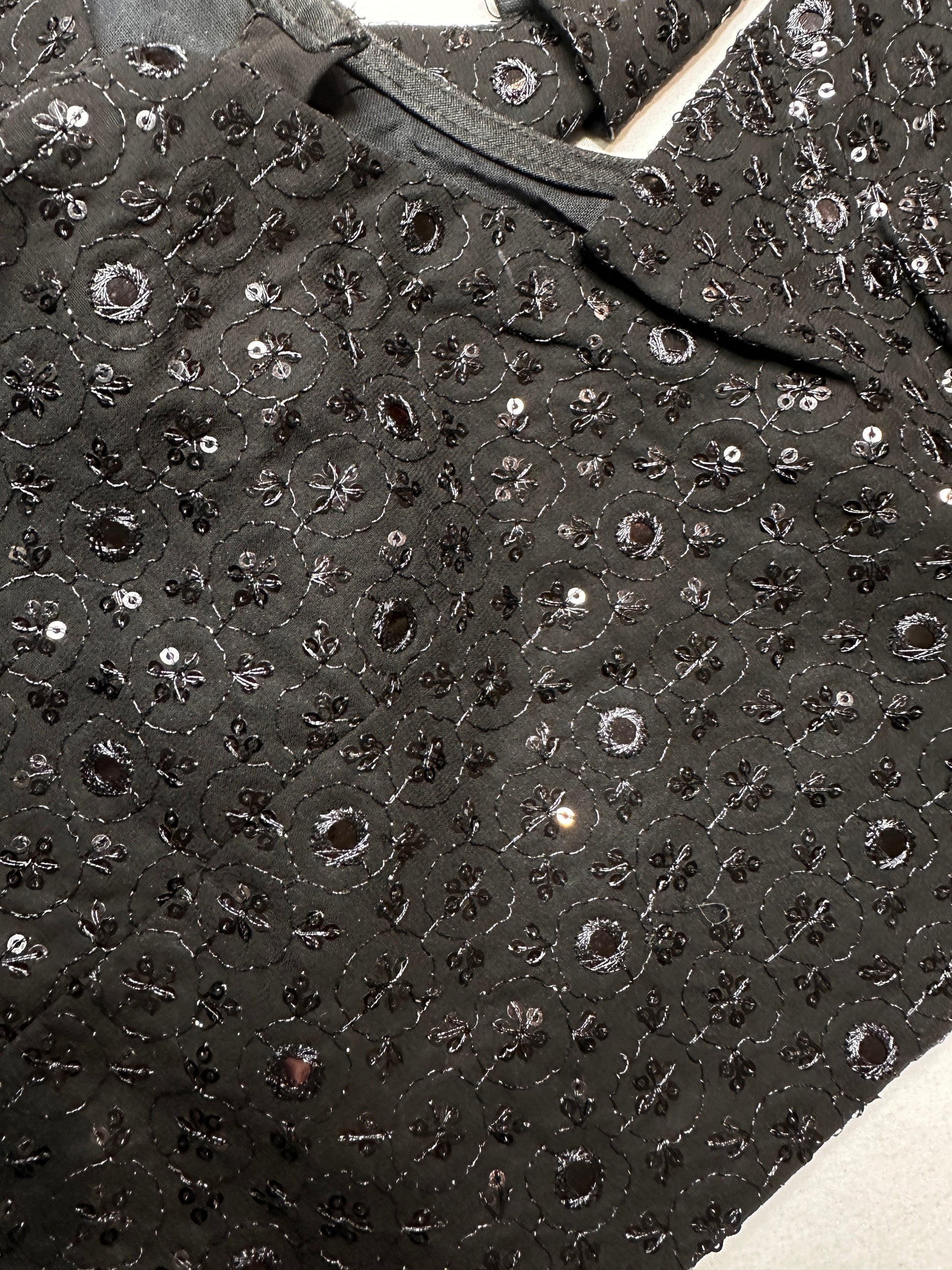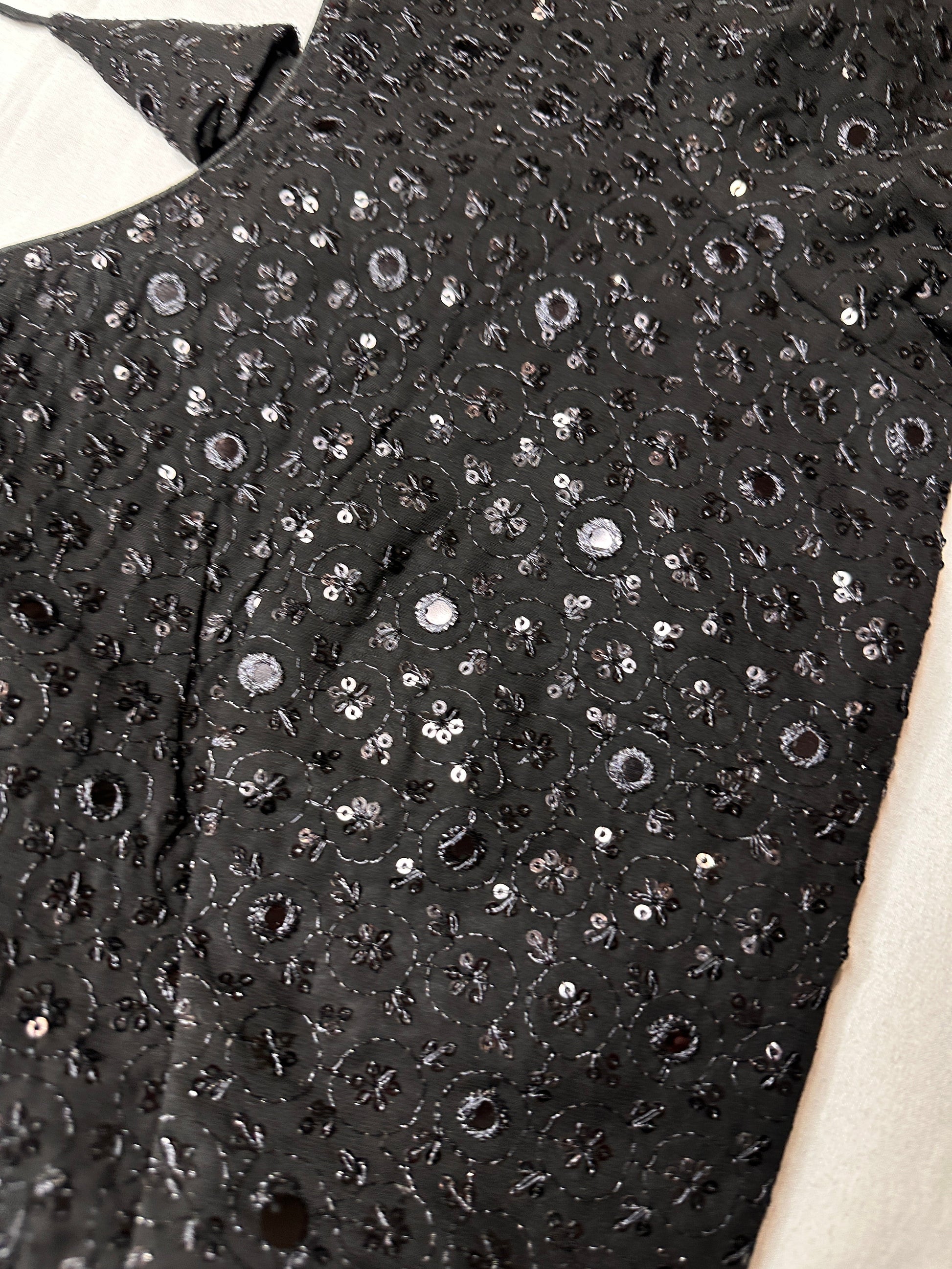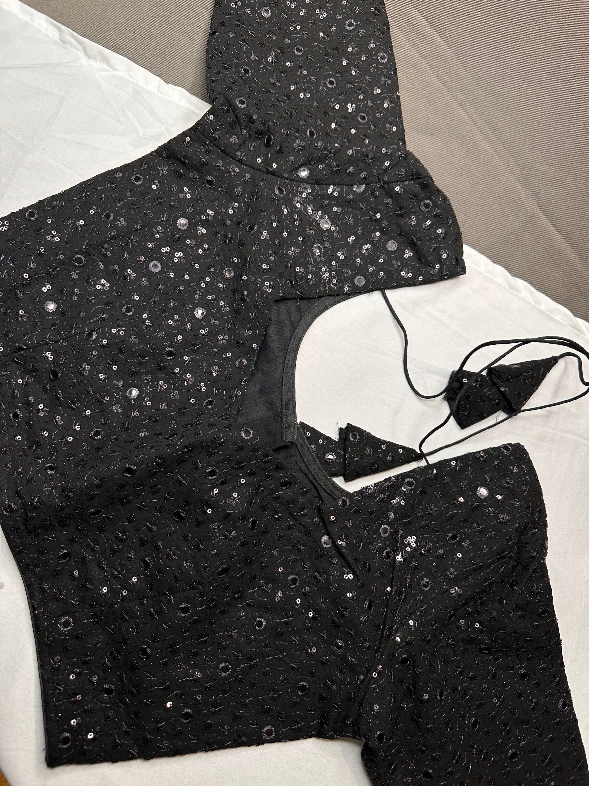 Black Sequence BlouseBlouse Details : Blouse Color : Black; Blouse stitched Size 36 and can be altered from 36 to 42, Sleeves Length : 9.5 Inches, blouse Length 15 Inches, FrontNeck : 7 Inches and Back Neck : 10 Inches;