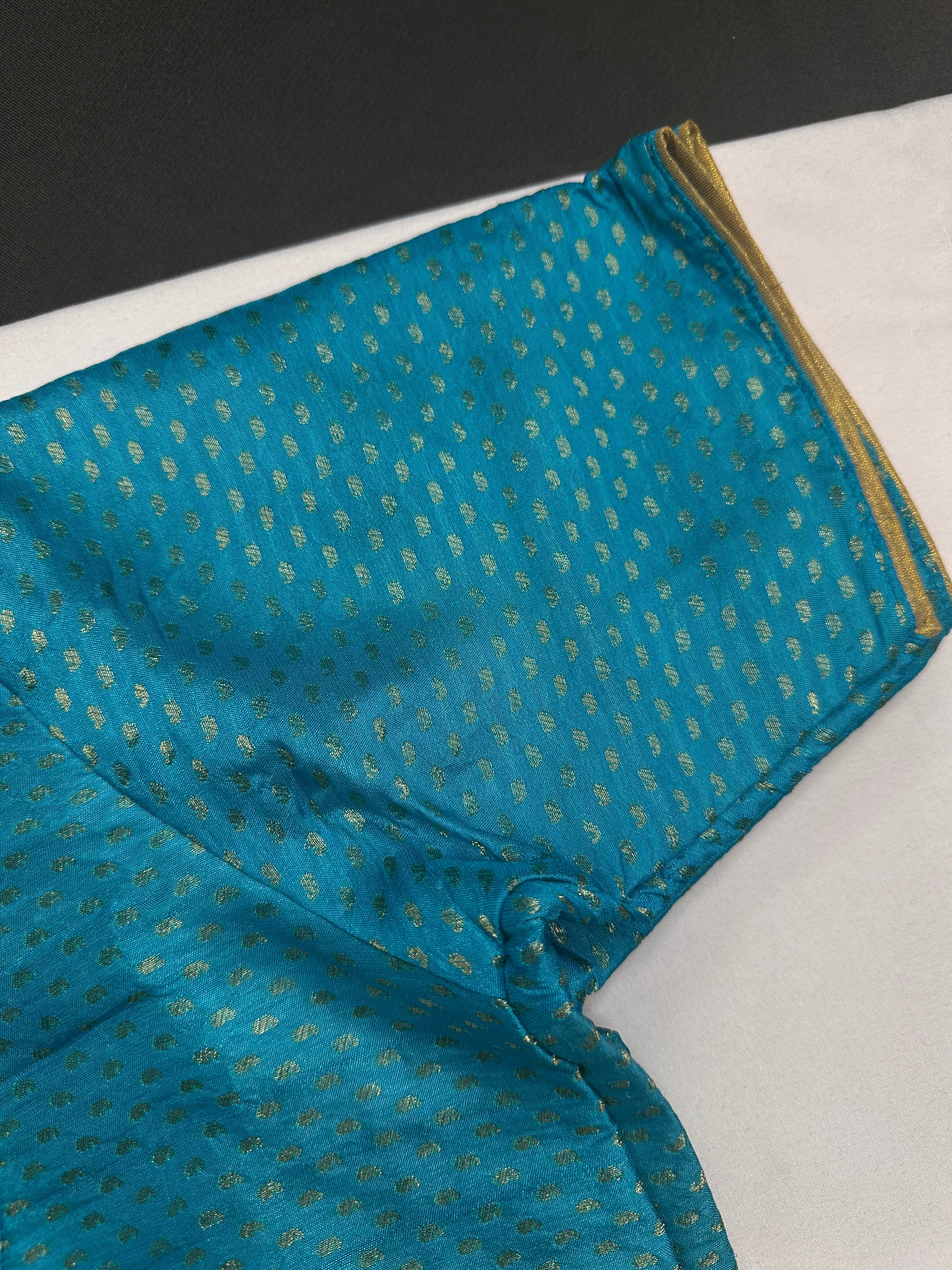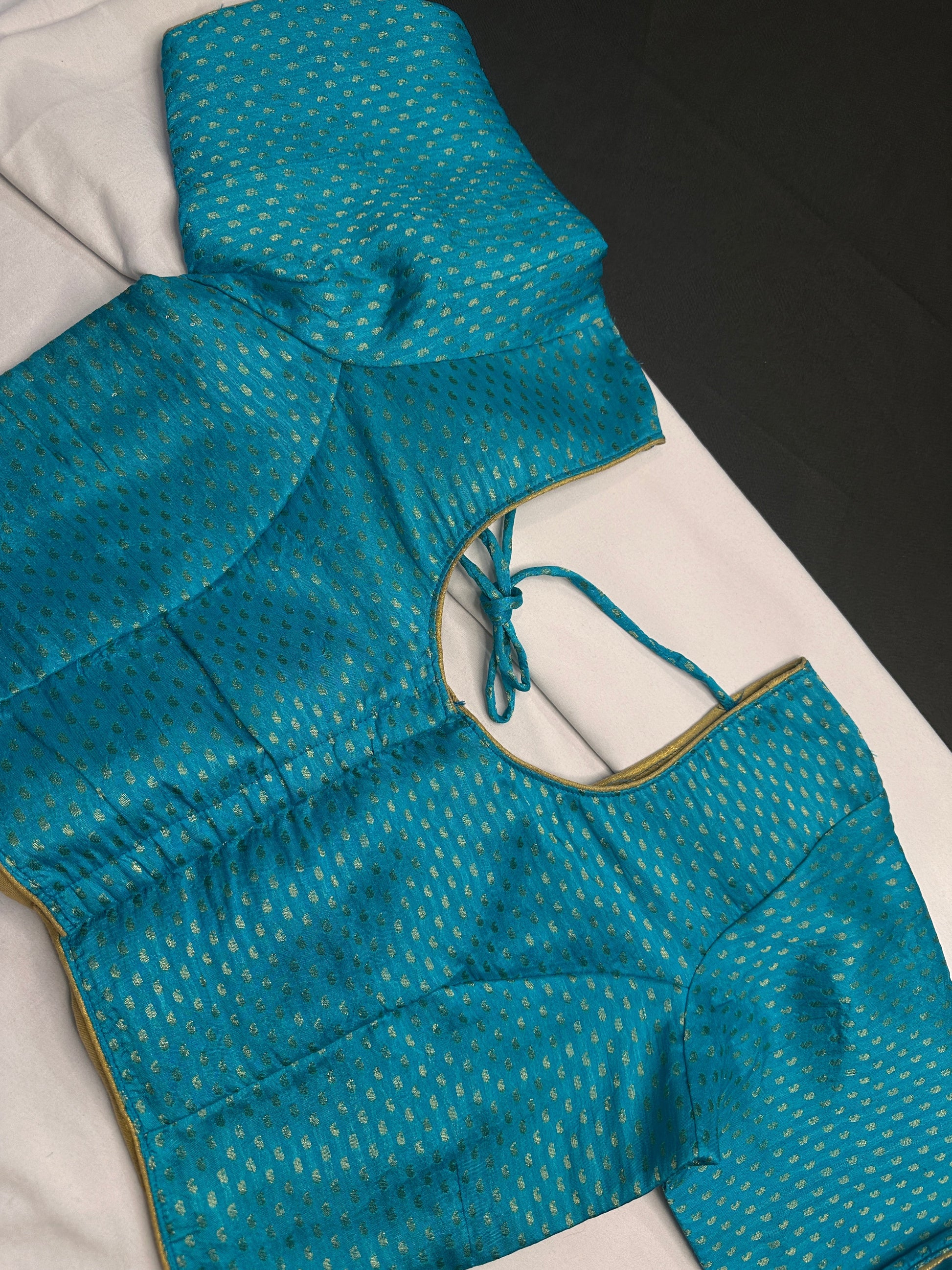 Blouse Details : Blouse Color : Blue; Blouse stitched Size 36 and can be altered from 34 to 42, Sleeves Length : 8.5 Inches, blouse Length 14 Inches, FrontNeck : 7 Inches and Back Neck : 9 Inches;