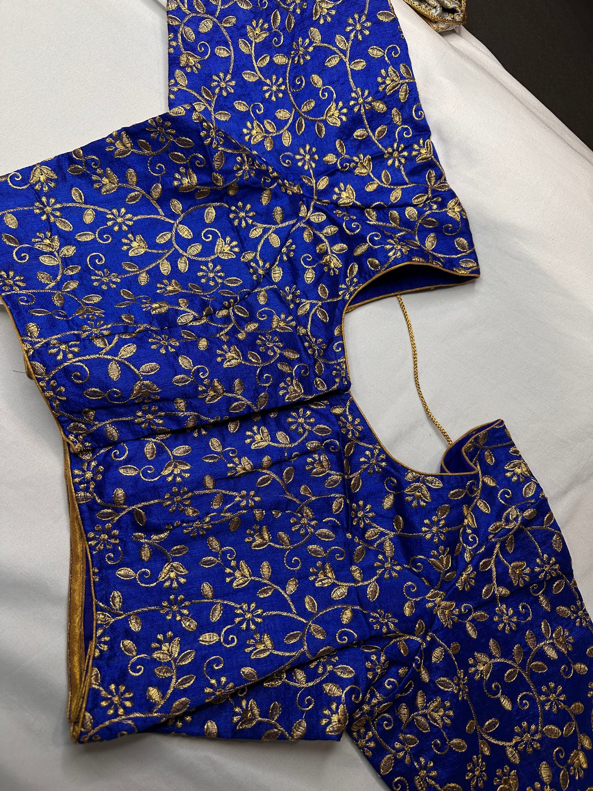 Blouse Details : Blouse Color : Blue; Blouse stitched Size 40 and can be altered from 36 to 44, Sleeves Length : 10 Inches, blouse Length 15 Inches, FrontNeck : 6.5 Inches and Back Neck : 8 Inches;
