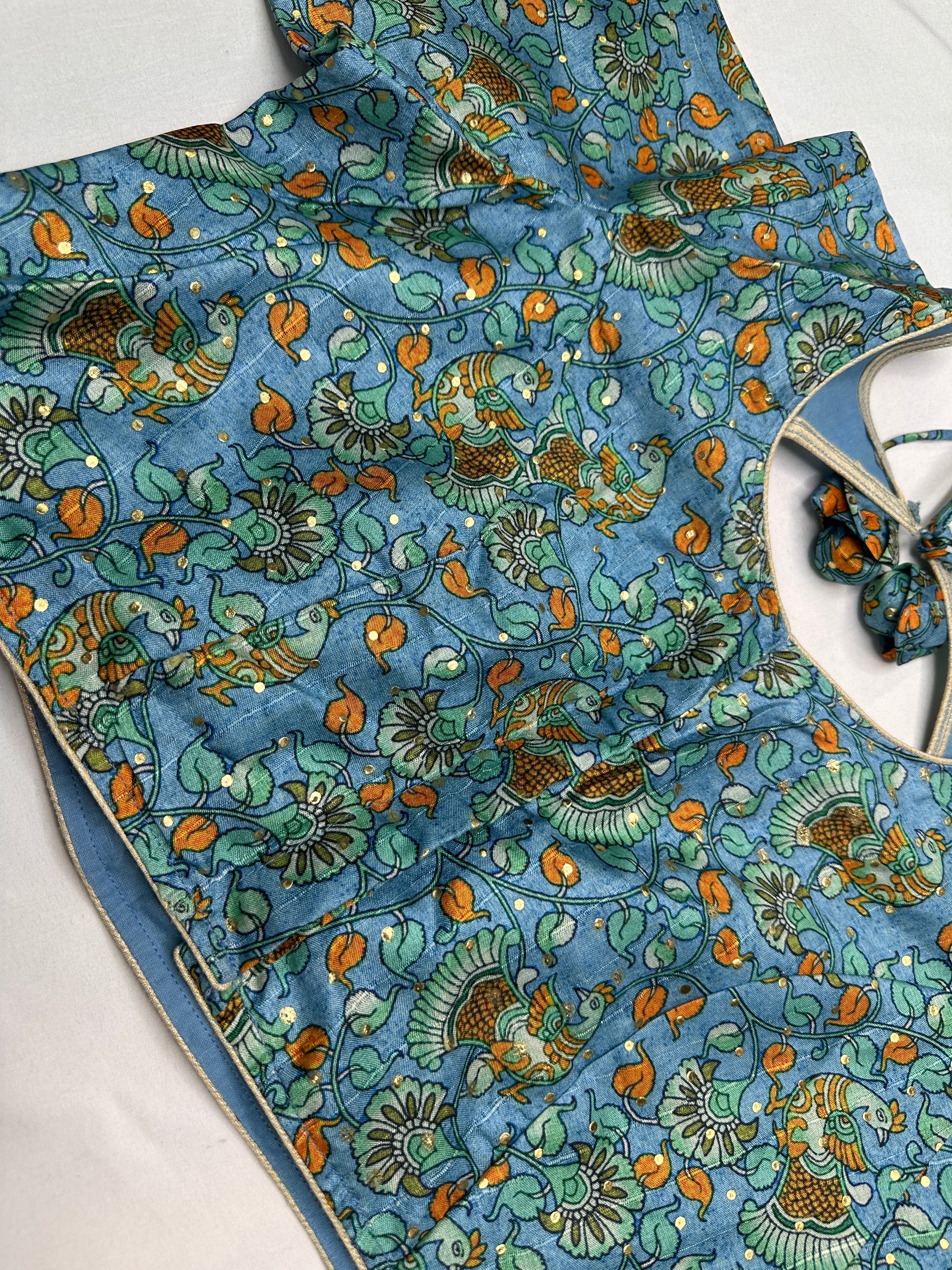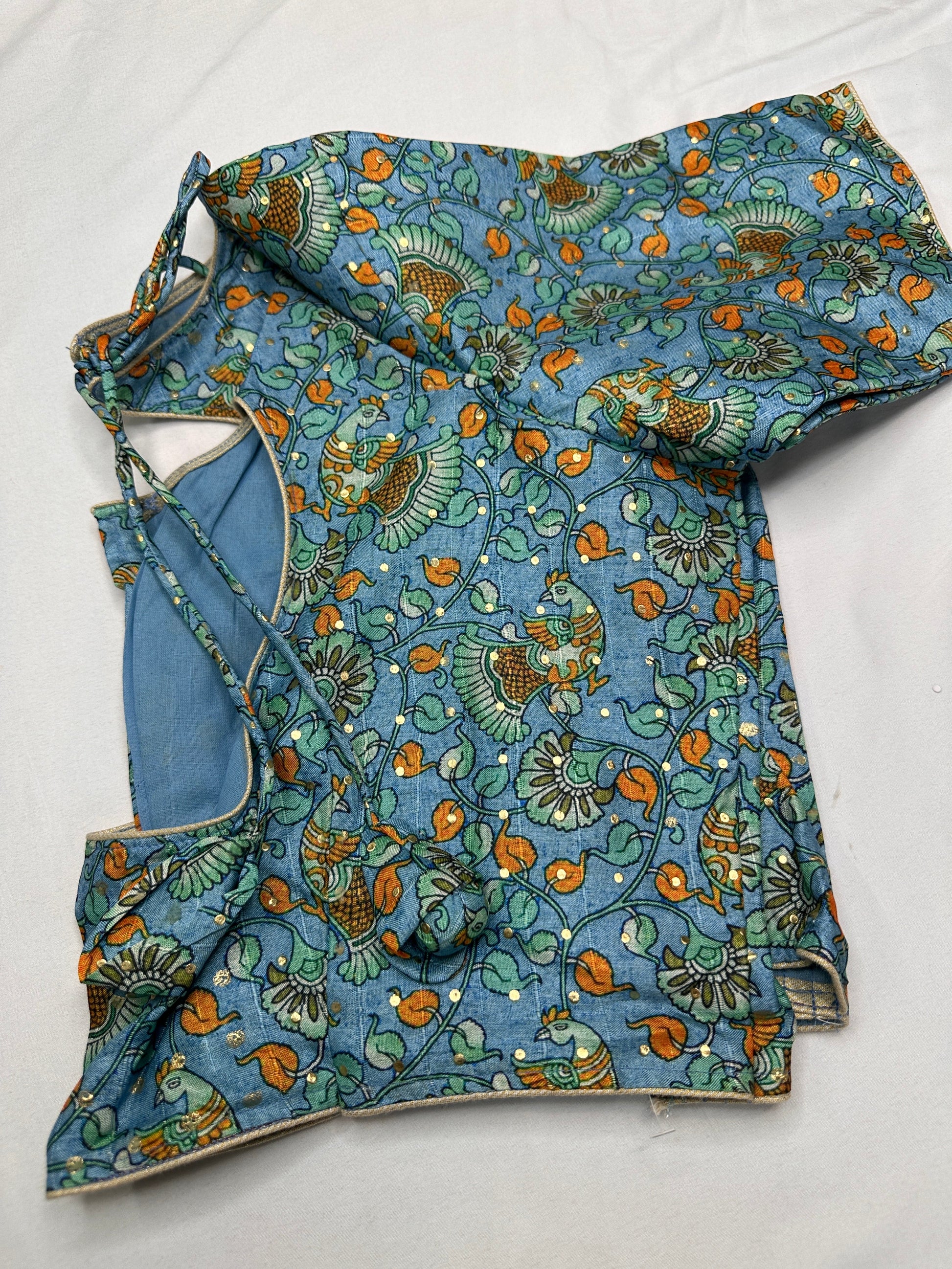 Blue Floral Multi Kalmakari Printed Silk BlouseBlouse Details : Blouse Color : Blue; Blouse stitched Size 42 and can be altered from 36 to 46, Sleeves Length : 10 Inches, blouse Length 15 Inches, FrontNeck : 6 Inches and Back Neck : 5 Inches;