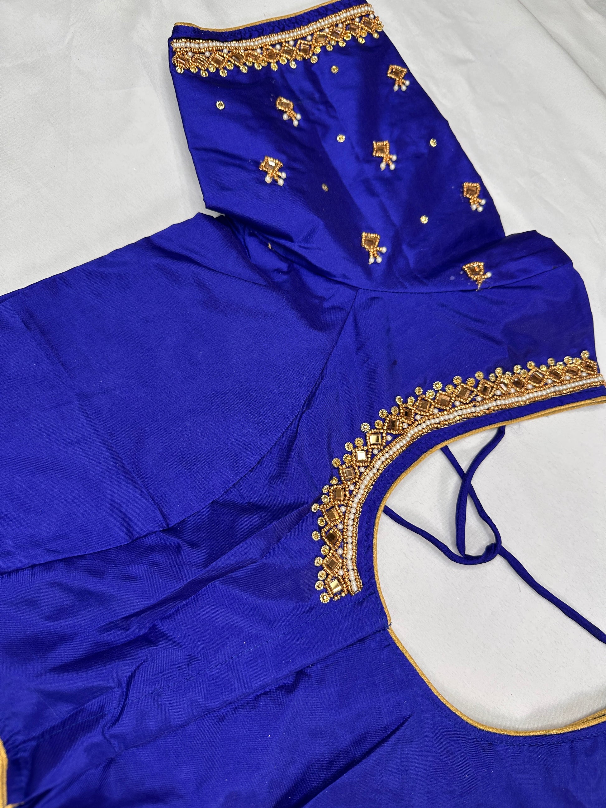 Blue Maggam Aari Work BlouseBlouse Details : Blouse Color : Blue; Blouse stitched Size 38 and can be altered from 36 to 44, Sleeves Length : 9 Inches, blouse Length 15 Inches, FrontNeck : 8 Inches and Back Neck : 10 Inches;