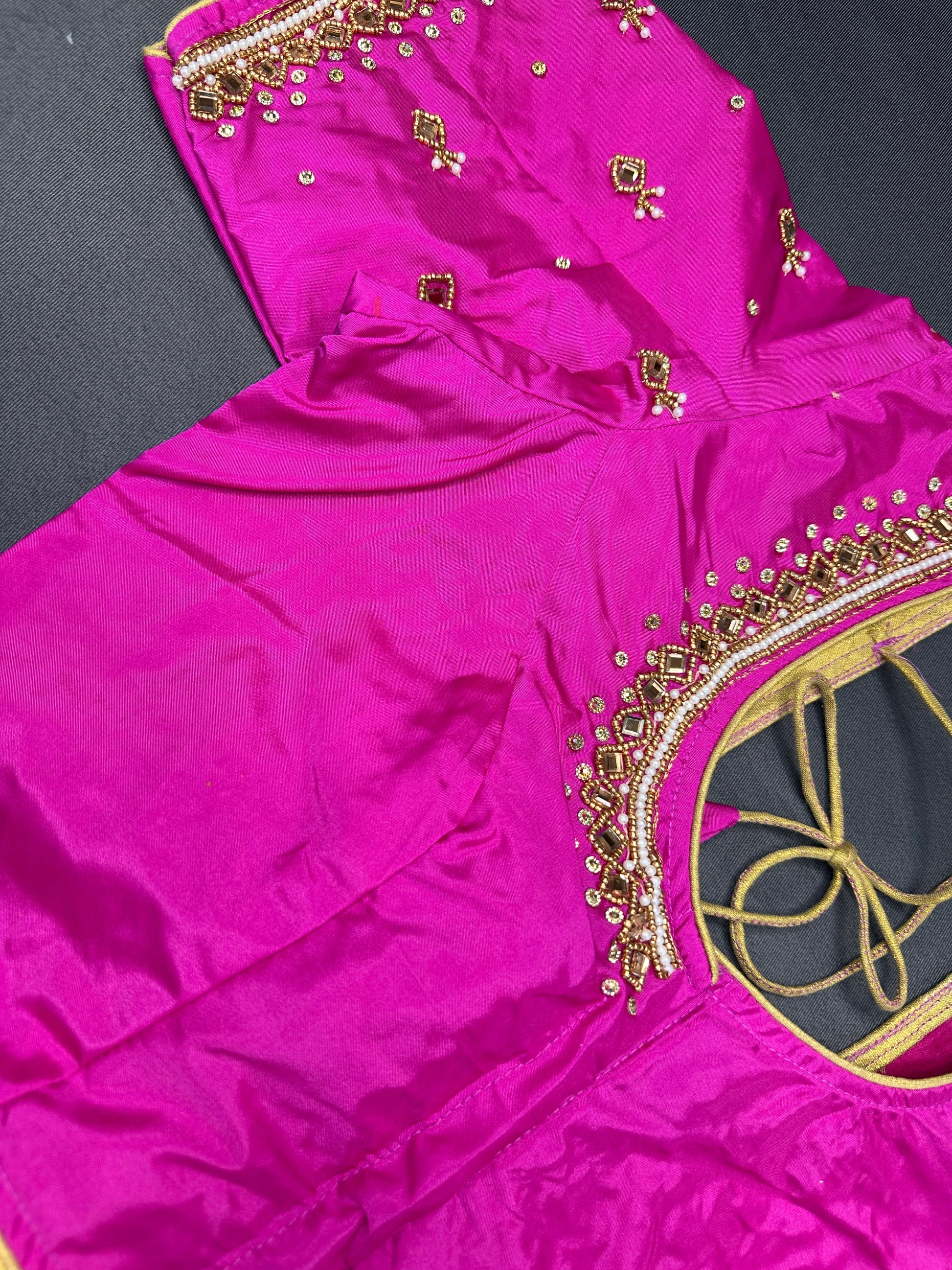 Blue Maggam Aari Work BlouseBlouse Details : Blouse Color : Blue; Blouse stitched Size 38 and can be altered from 36 to 44, Sleeves Length : 9 Inches, blouse Length 15 Inches, FrontNeck : 8 Inches and Back Neck : 10 Inches;