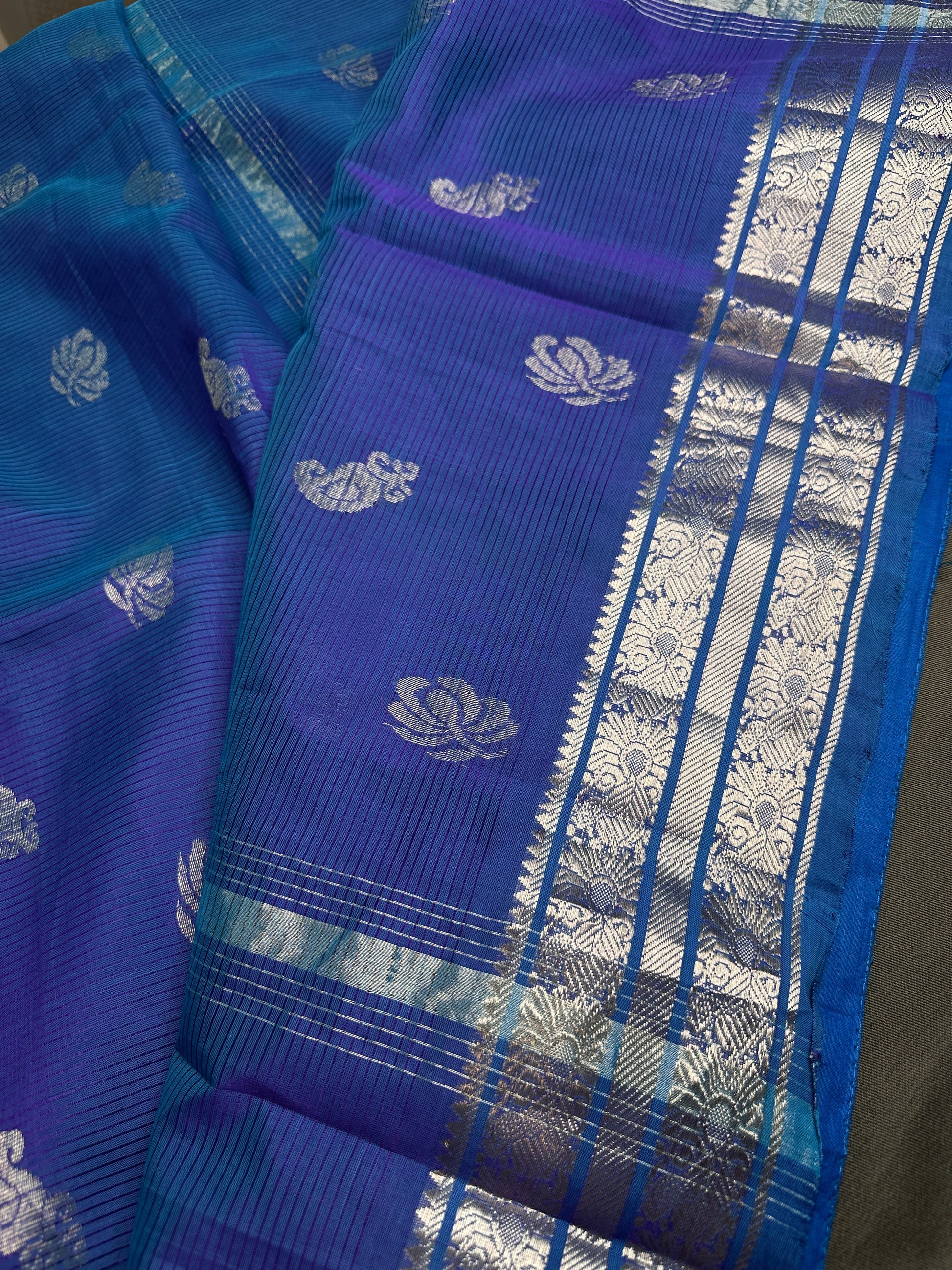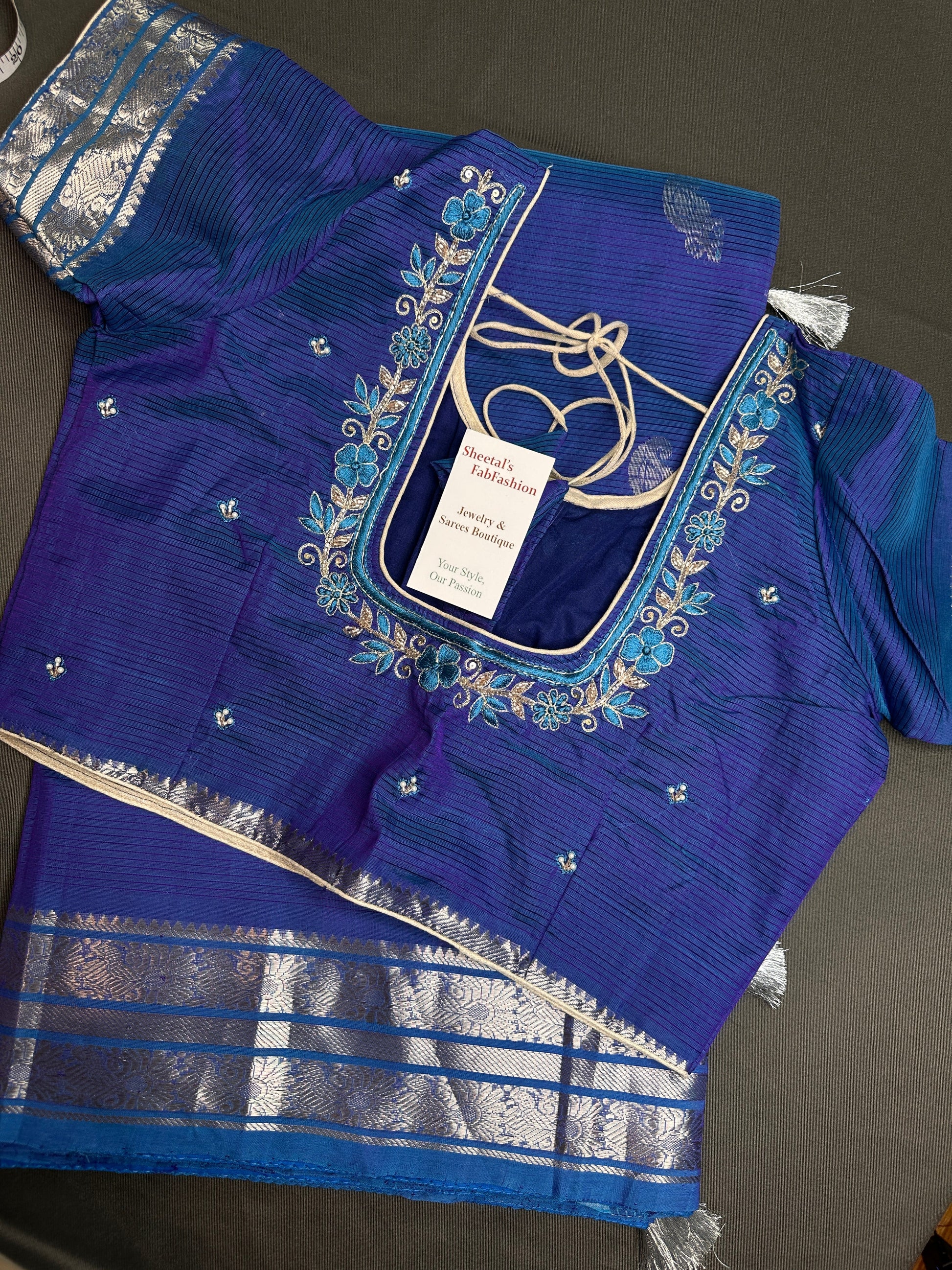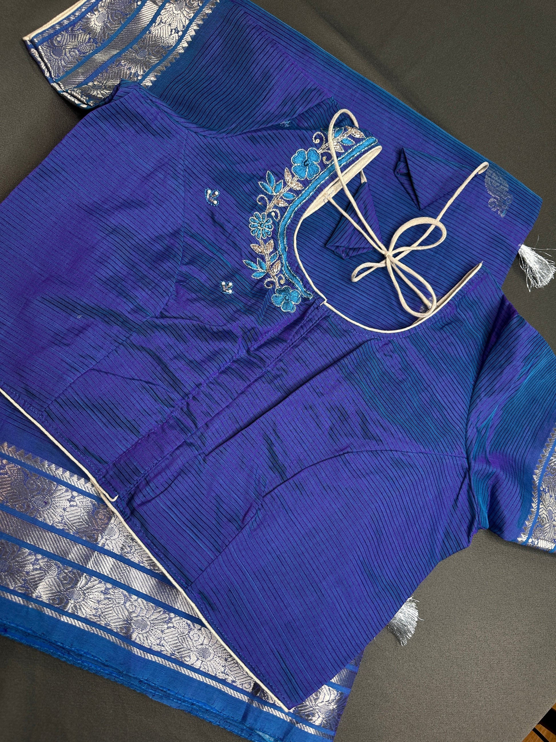 Blue Mangalgiri SICO Handloom Saree Saree Details : Blue Color Saree Fall and Pico done Blouse Details : Lavender Blouse Size 40 and has margin to go up to Size 46; Sleeves Length : 7 Inches: Blouse Length : 15 Inches; Front Neck : 7.5Inches; Back Neck : 10 Inches