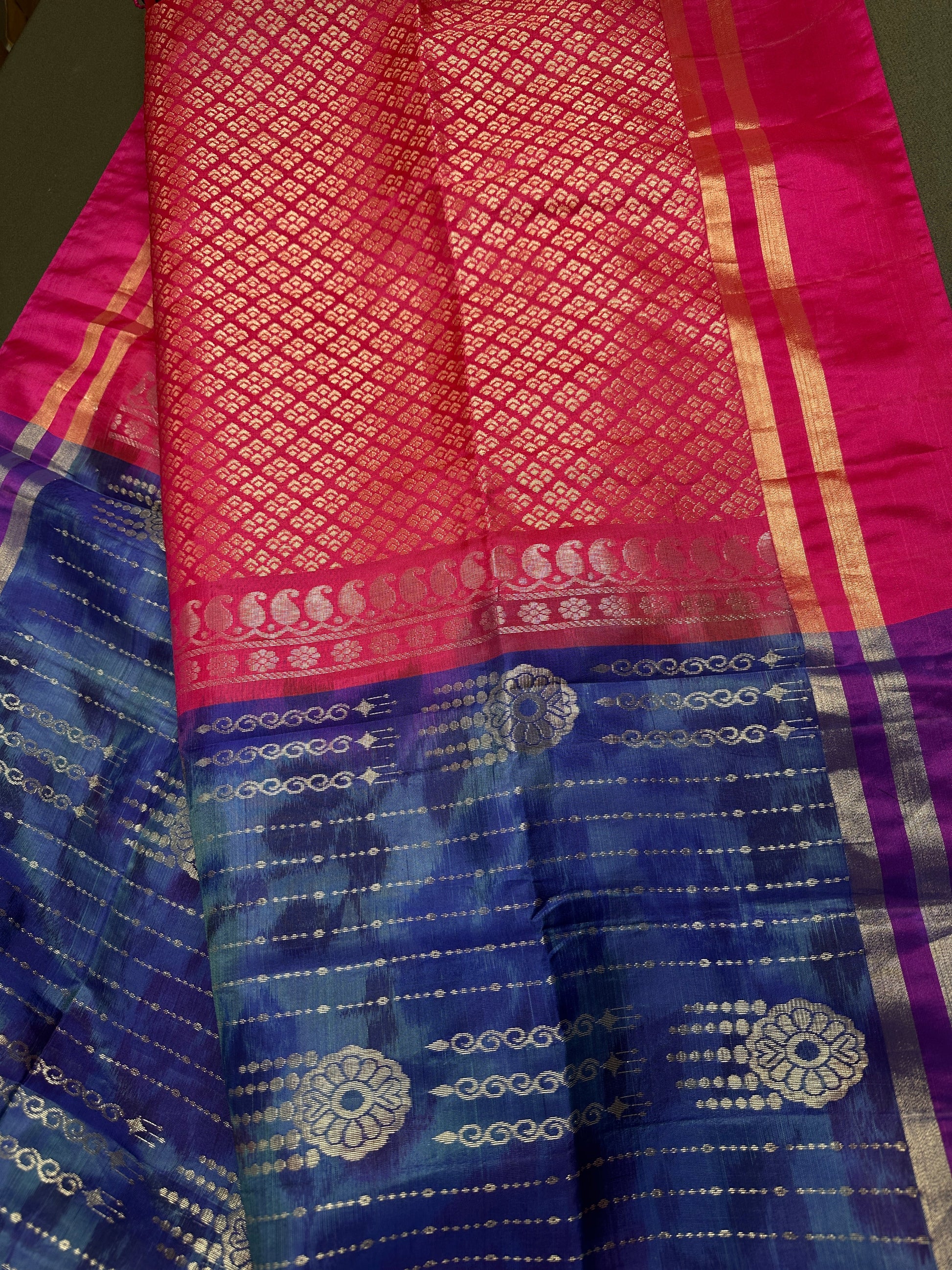 Blue Pink Uppada light Weight Silk Saree Saree Details : Blue Color Saree with Pink PaLLU Fall and Pico done Blouse Details : Pink Blouse Size 38 and has margin to go up to Size 42; Sleeves Length : 7 Inches: Blouse Length : 15 Inches; Front Neck : 6 Inches; Back Neck : 10 Inches