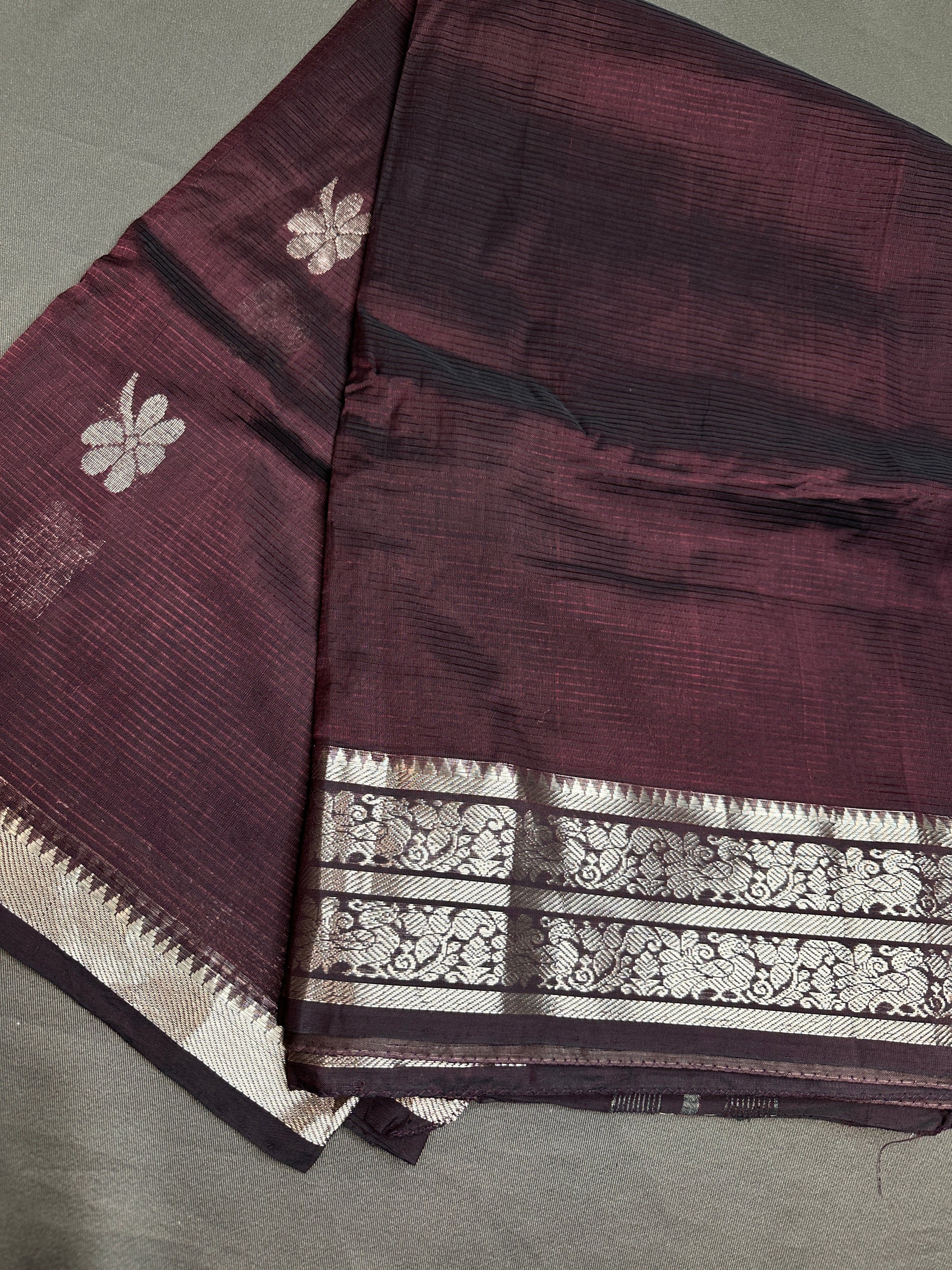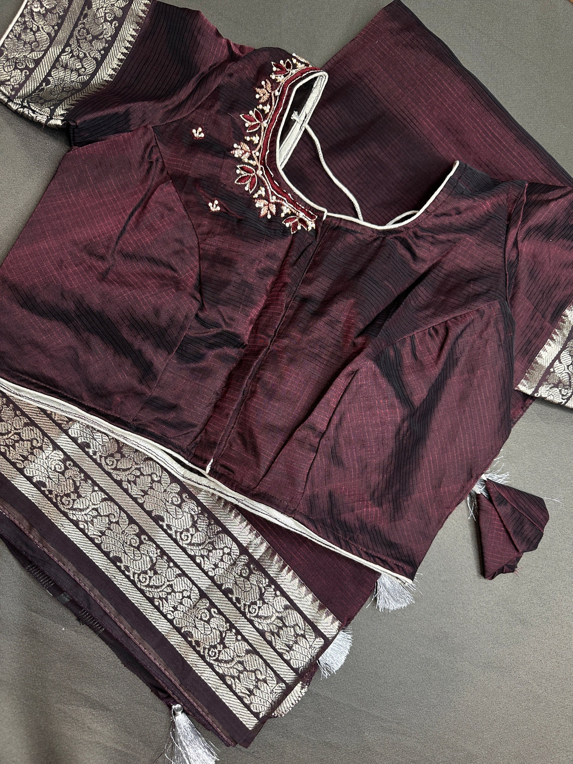 Brown Mangalgiri SICO Handloom Saree Saree Details : Brown Color Saree Fall and Pico done Blouse Details : Brown Blouse Size 40 and has margin to go up to Size 46; Sleeves Length : 7 Inches: Blouse Length : 15 Inches; Front Neck : 7.5Inches; Back Neck : 10 Inches