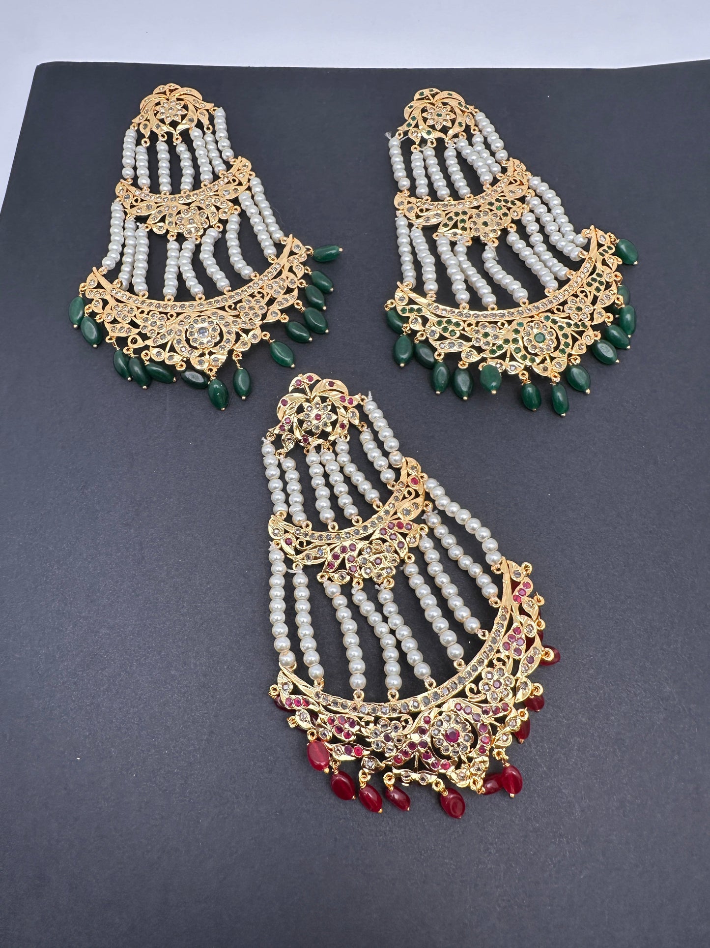 Color Stone Hyderabadi Jadau Pearls Golden JhoomarColor : GoldenSize : Length : Approx 5 inchesStones : --Color-- Stone Hyderabadi Jadau and Pearls
