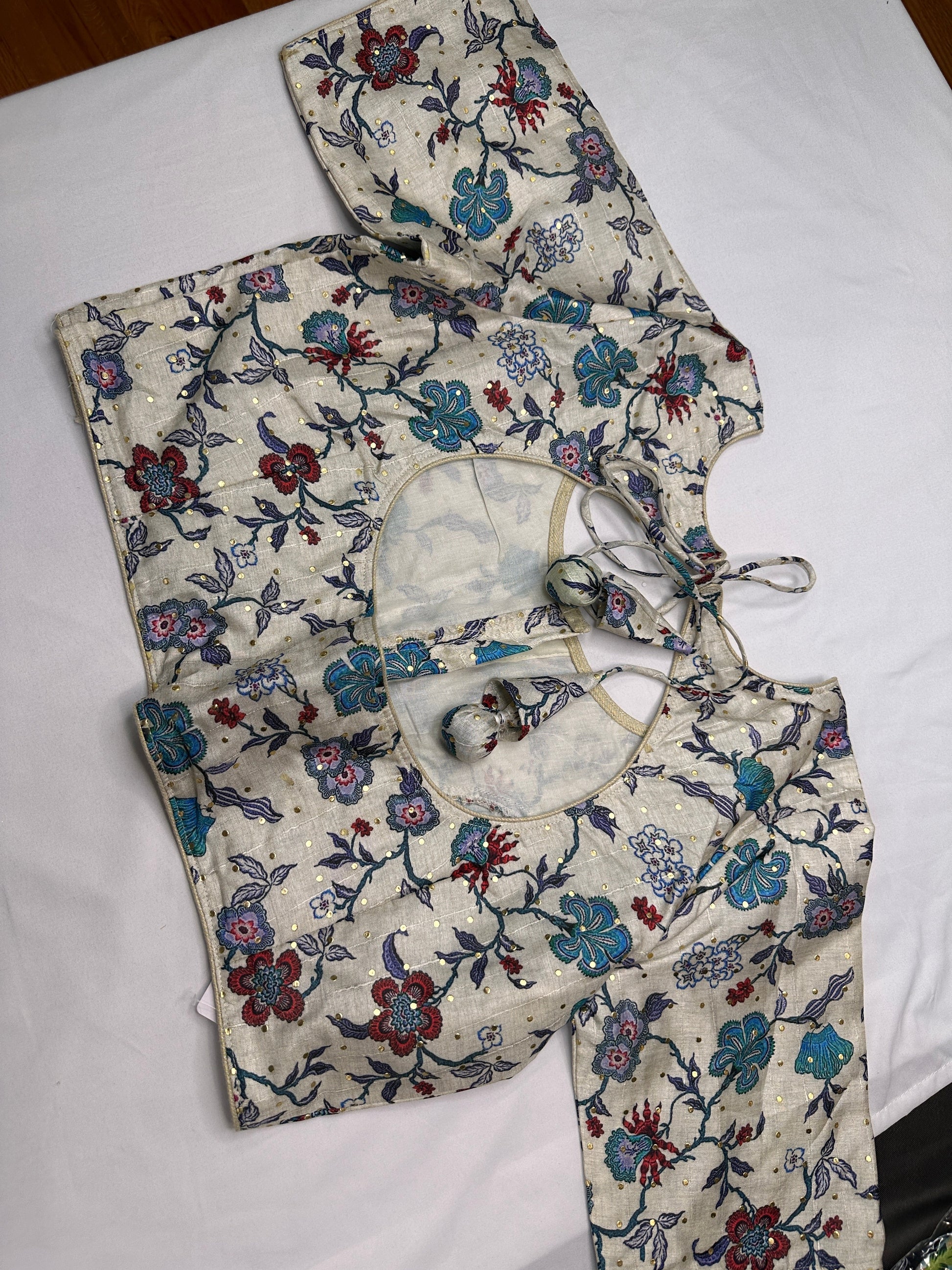 Blouse Details : Blouse Color : Cream; Blouse stitched Size 42 and can be altered from 36 to 46, Sleeves Length : 10 Inches, blouse Length 15 Inches, FrontNeck : 6 Inches and Back Neck : 5 Inches;