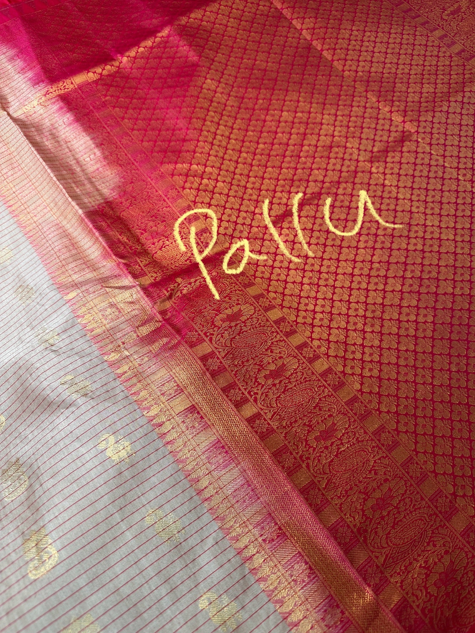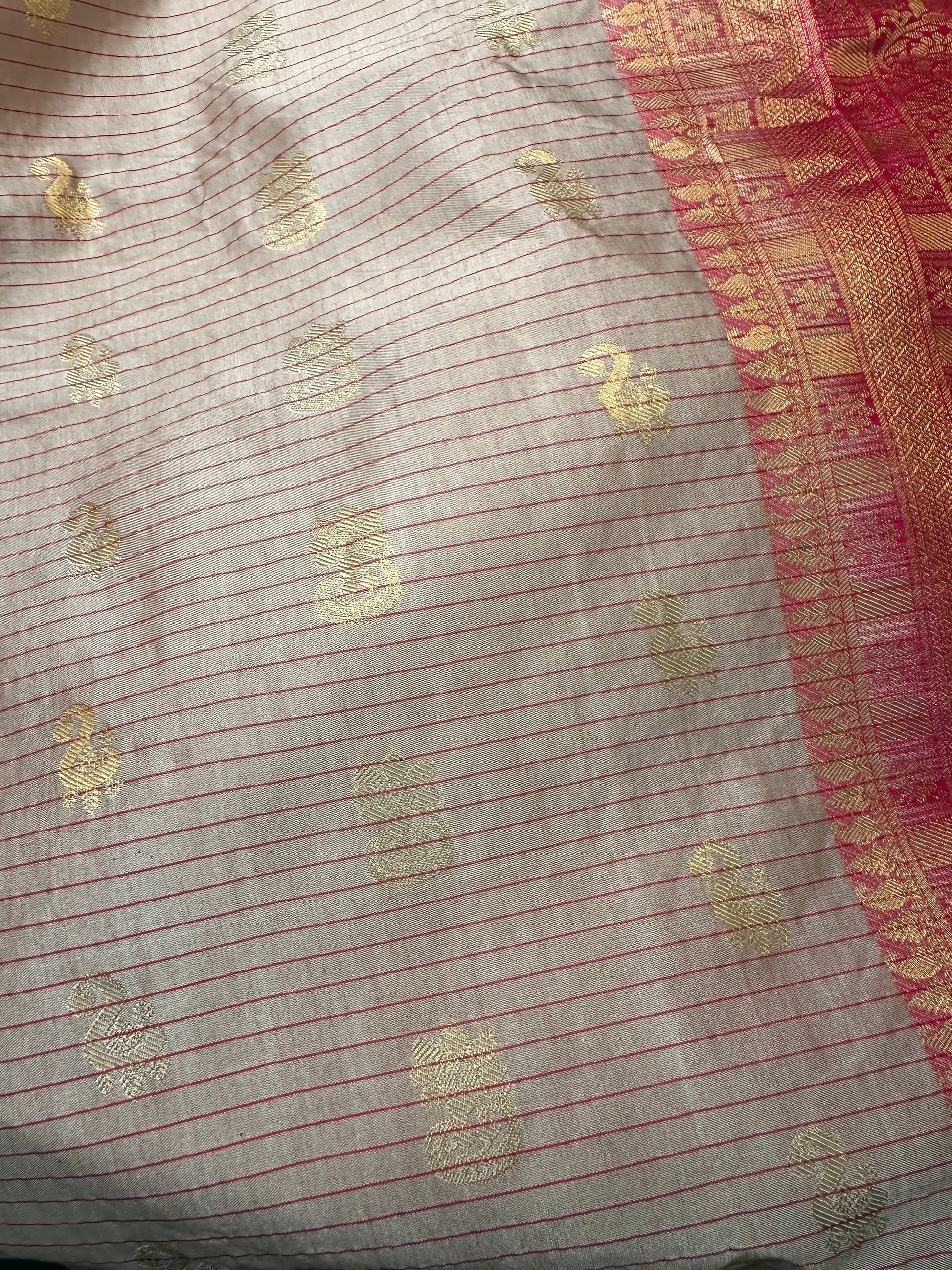 Cream Pink Pure Silk Pattu Gadwal Saree Saree Details : Beige Color Saree Pink Pallu Fall and Pico done Blouse Details : Pink Maggam Work Blouse Size 38 and has margin to go up to Size 44; Sleeves Length : 8.5 Inches: Blouse Length : 15 Inches; Front Neck : 7 Inches; Back Neck : 8 Inches Inches