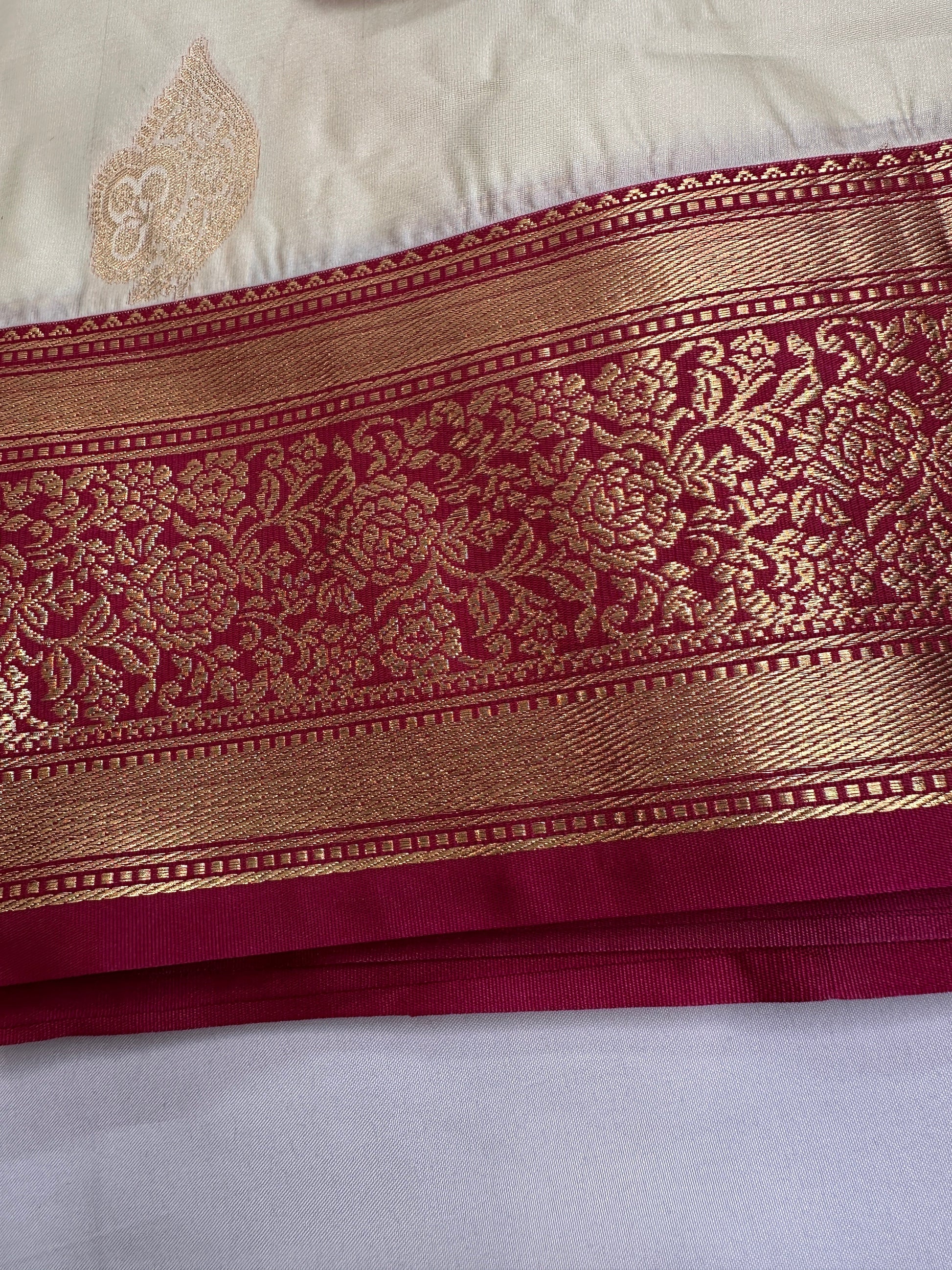 Cream Pink Semi Kanchi Silk Saree Saree Details : Cream Color Saree Pink Pallu Fall and Pico done Blouse Details : Pink Blouse Size 40 and has margin to go up to Size 46; Sleeves Length : 8 Inches: Blouse Length : 15 Inches; Front Neck : 6 Inches; Back Neck : 9 Inches