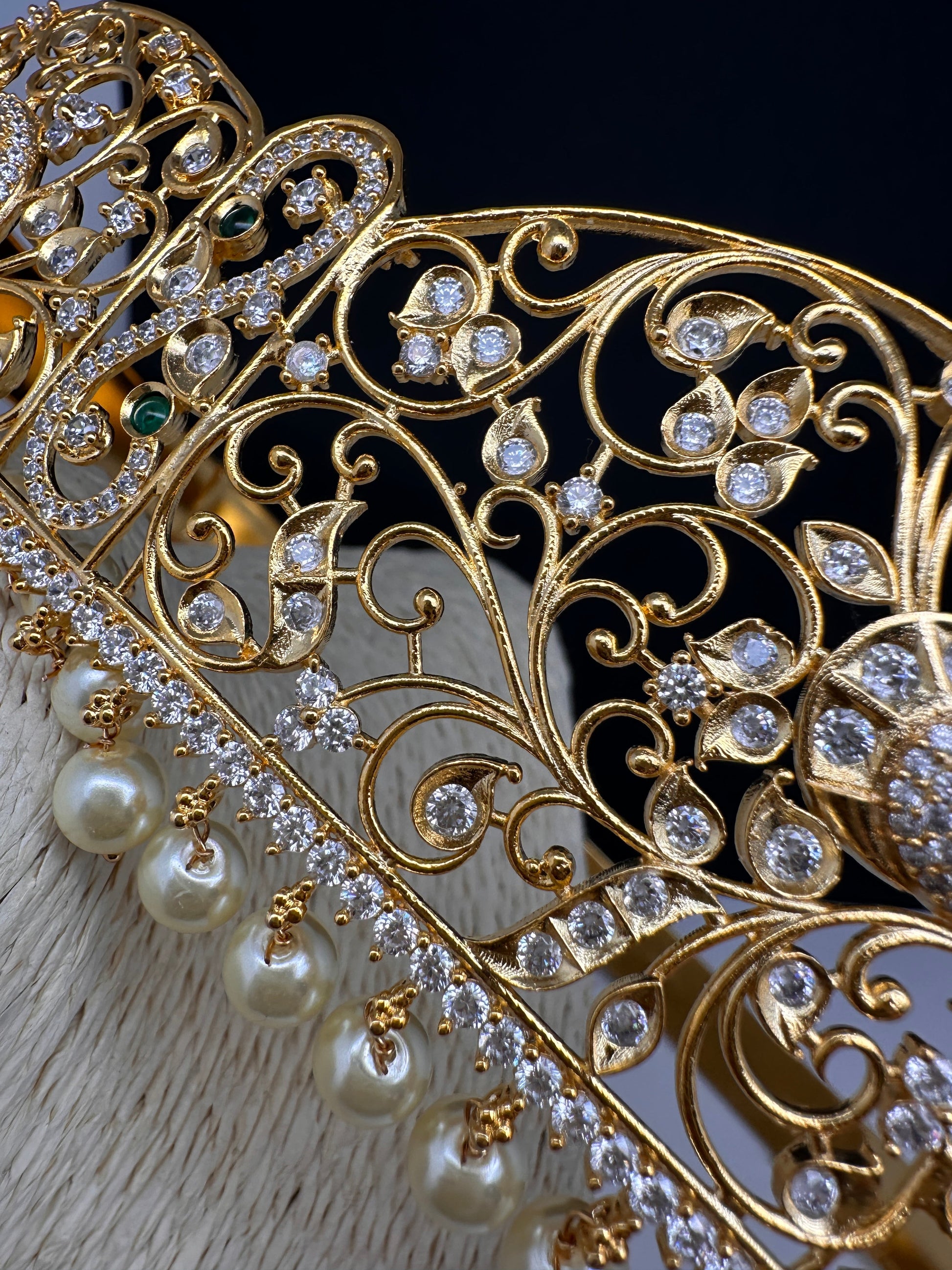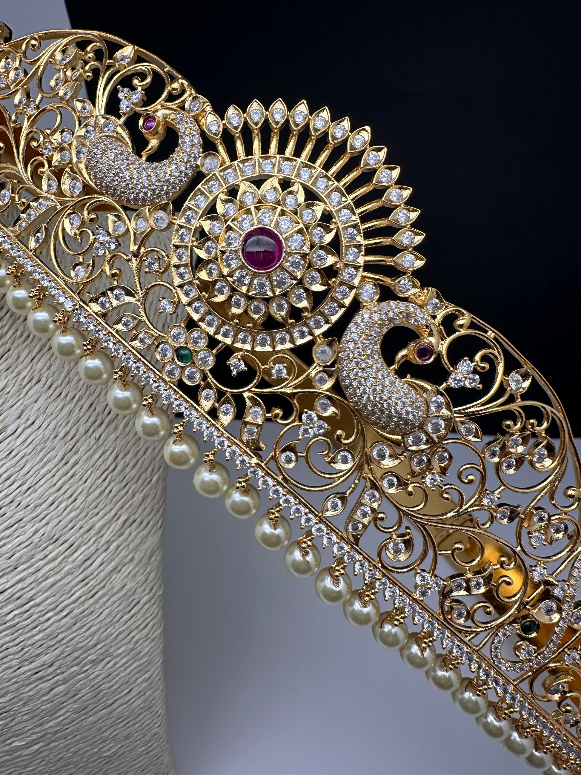 CZ Gold Finish Hip Belt Vaddanam long around waist adjustable waist beltColor : GoldenSize : Maximum Length : 42 Inches; Minimum Length : 32 Inches; Front Design Length :12 InchesStones : AD Stones